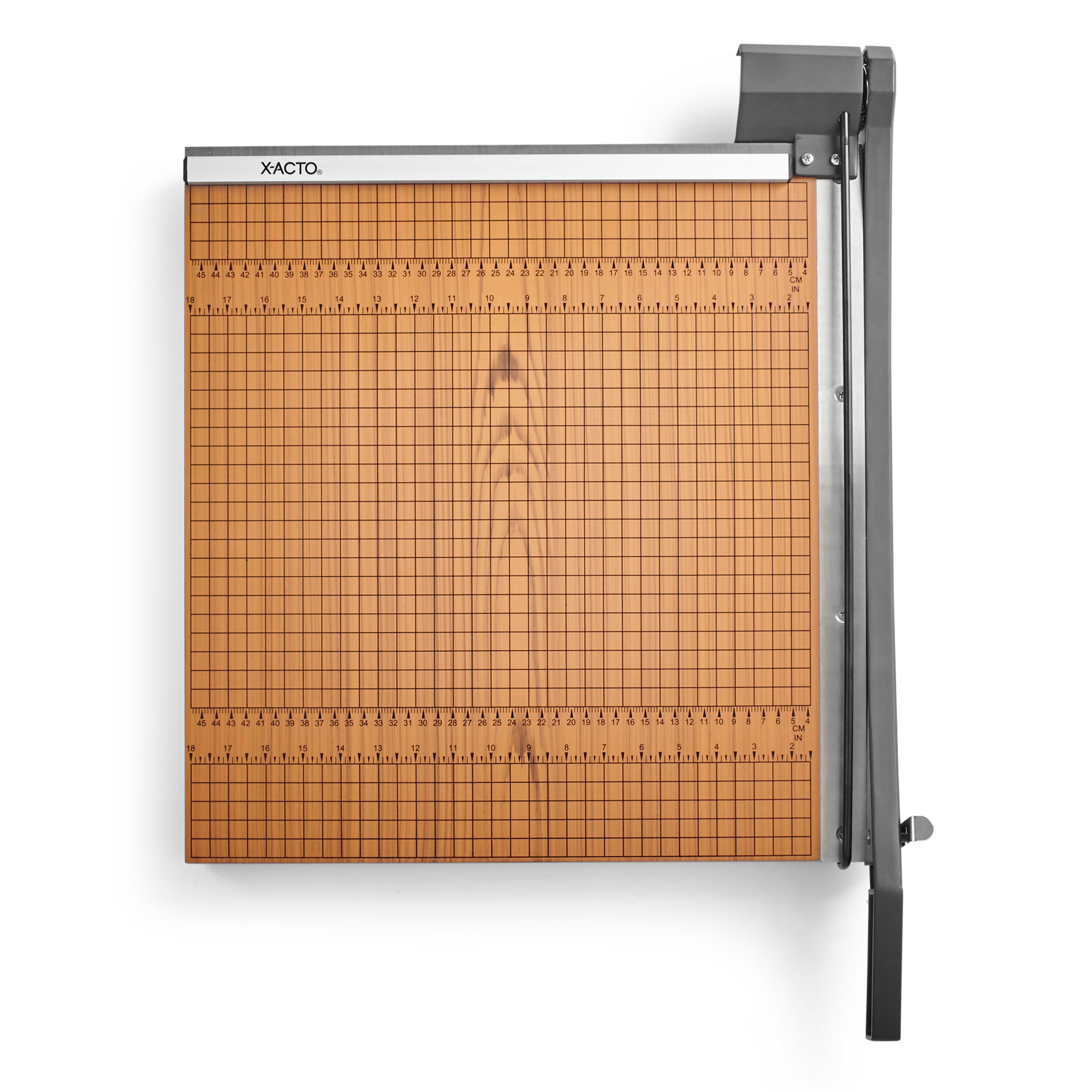 This Square Wood Paper Trimmer from X-ACTO has a 15-sheet capacity, an 18 inch cut size, and a hardened steel blade making it perfect for schools and other high-use environments. The trimmer features a strong 3/4-inch wood base, a perpetual self-sharpening system, a self-locking safety latch, and a finger guard that come together to provide functionality and safety. The base is complete with English and metric measurement grids that allow for precision cuts. Measures 18 x 18 inches.Features