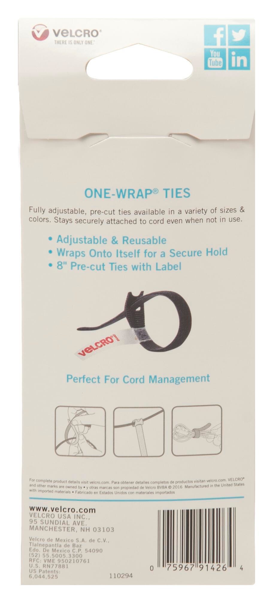 VELCRO Brand ONE-WRAP precut ties make it easy to color-code wires, cords, and cables for construction and networking projects. Available in different sizes to handle thin wires and bulky cables. Adjustable ONE-WRAP ties are strong and reusable for indoor or outdoor use.
