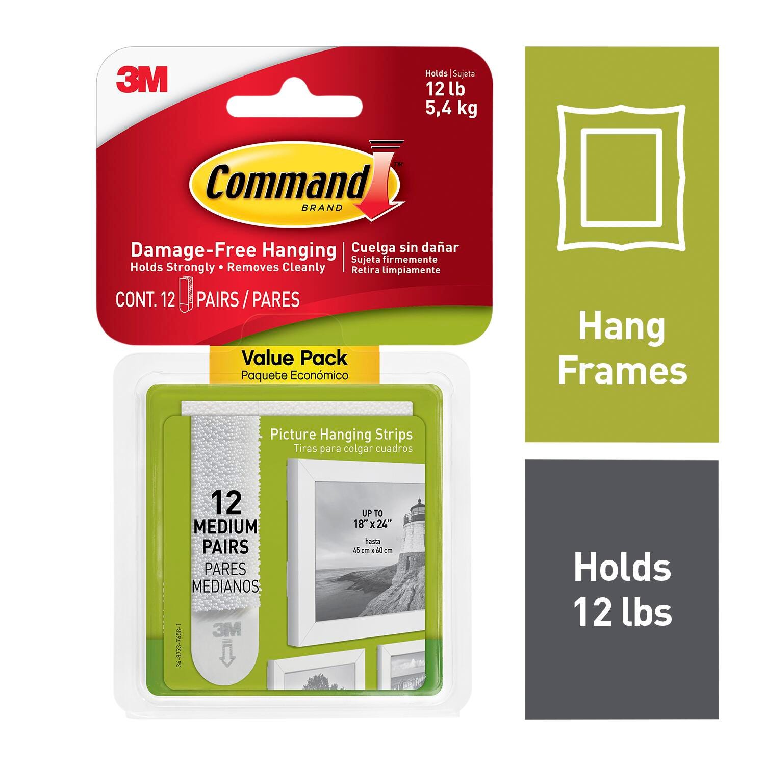 Hang picture frames and other decorations without the hassle and mess of a hammer and nails with these Medium Picture Hanging Strips from Command™. These handy strips function in pairs to firmly hold your items on a variety of surfaces including painted walls, painted concrete, finished wood, and other smooth surfaces. Decorating your room is as easy as clicking a pair of strips together, sticking them on the item you want to hang, and pressing them onto the wall. These picture hangers feature stretch-release technology for effortless removal without any sticky residue. Maximum frame size of 18 inches x 24 inches. Four pairs of adhesive strips hold up to 12 pounds.Features