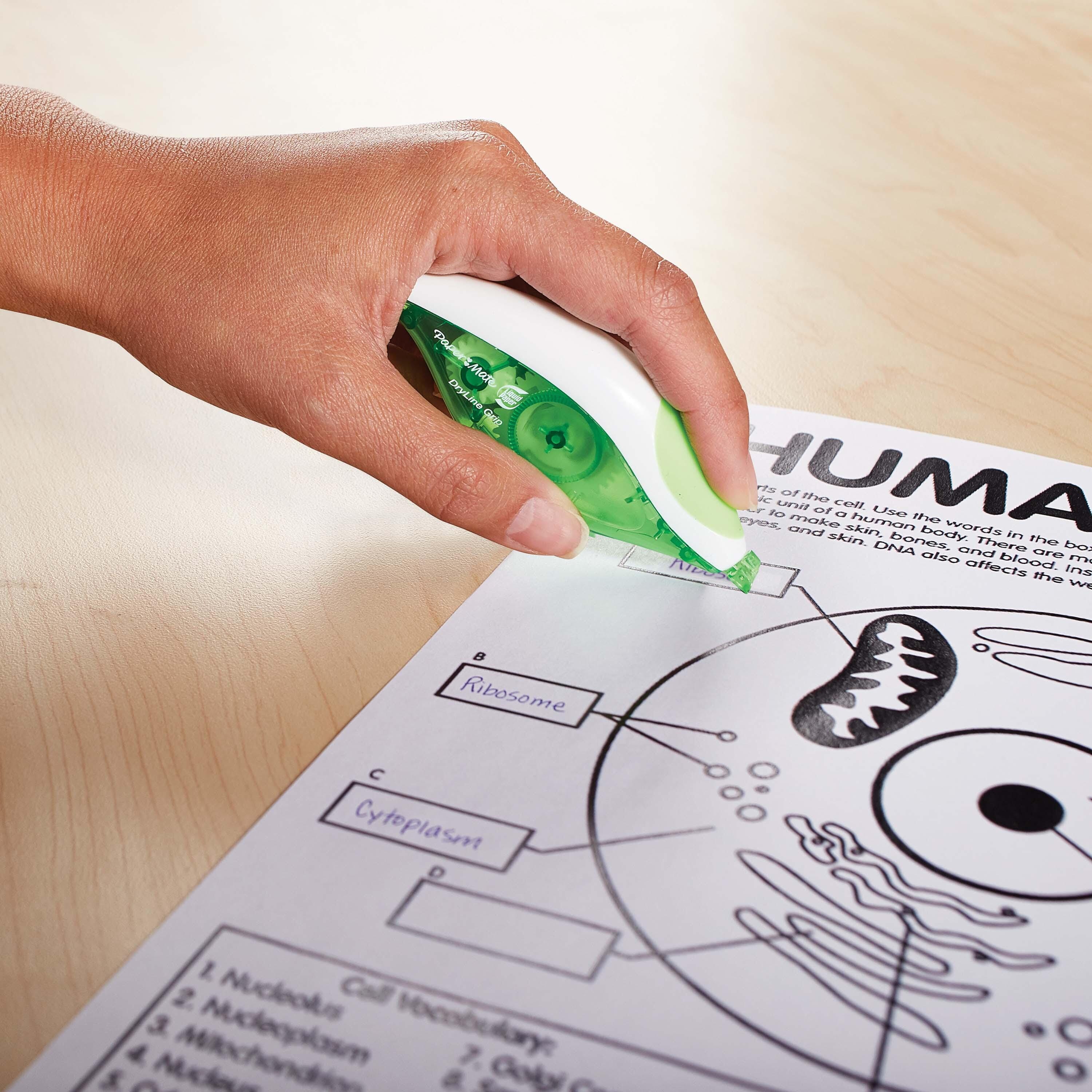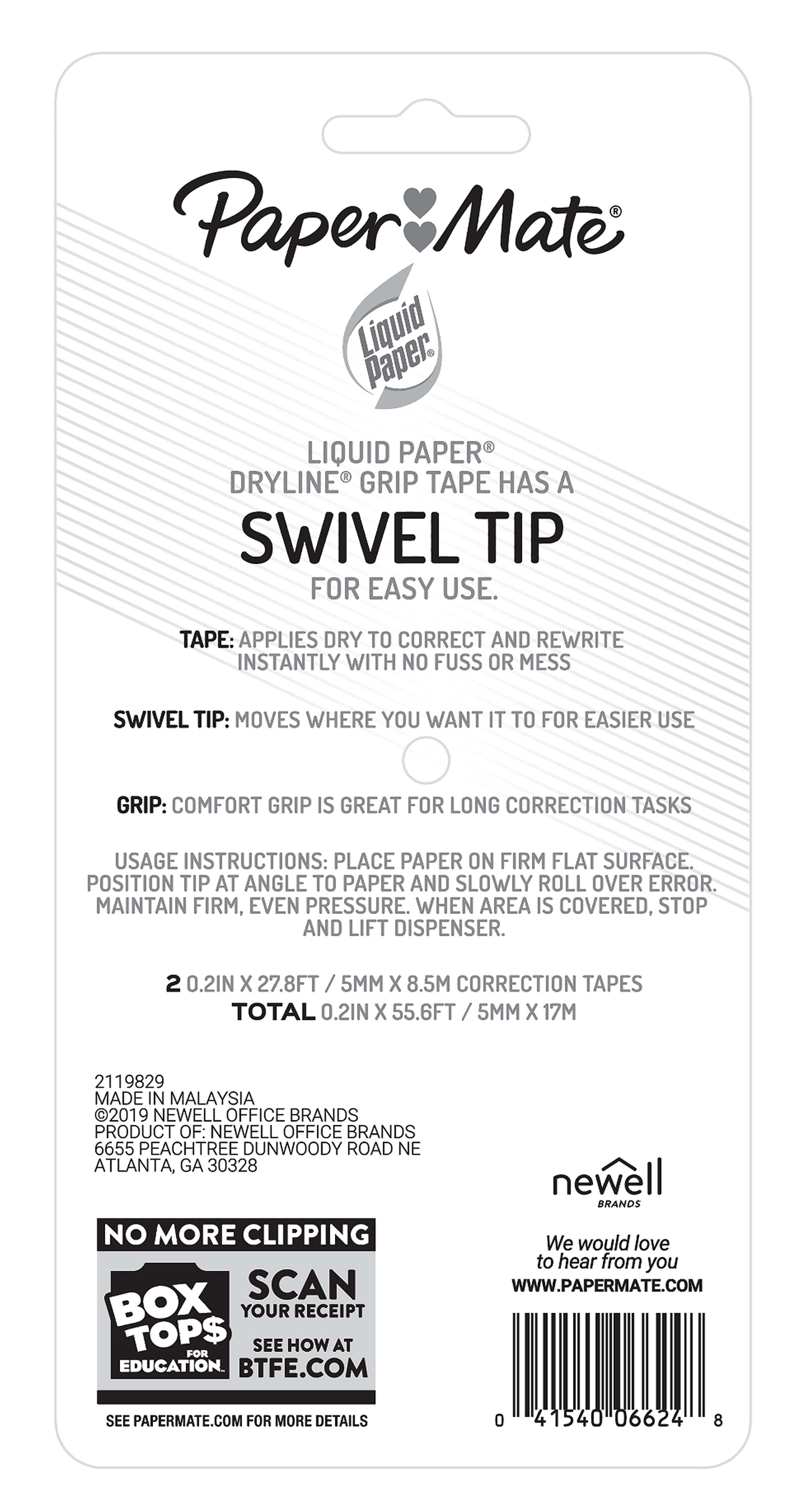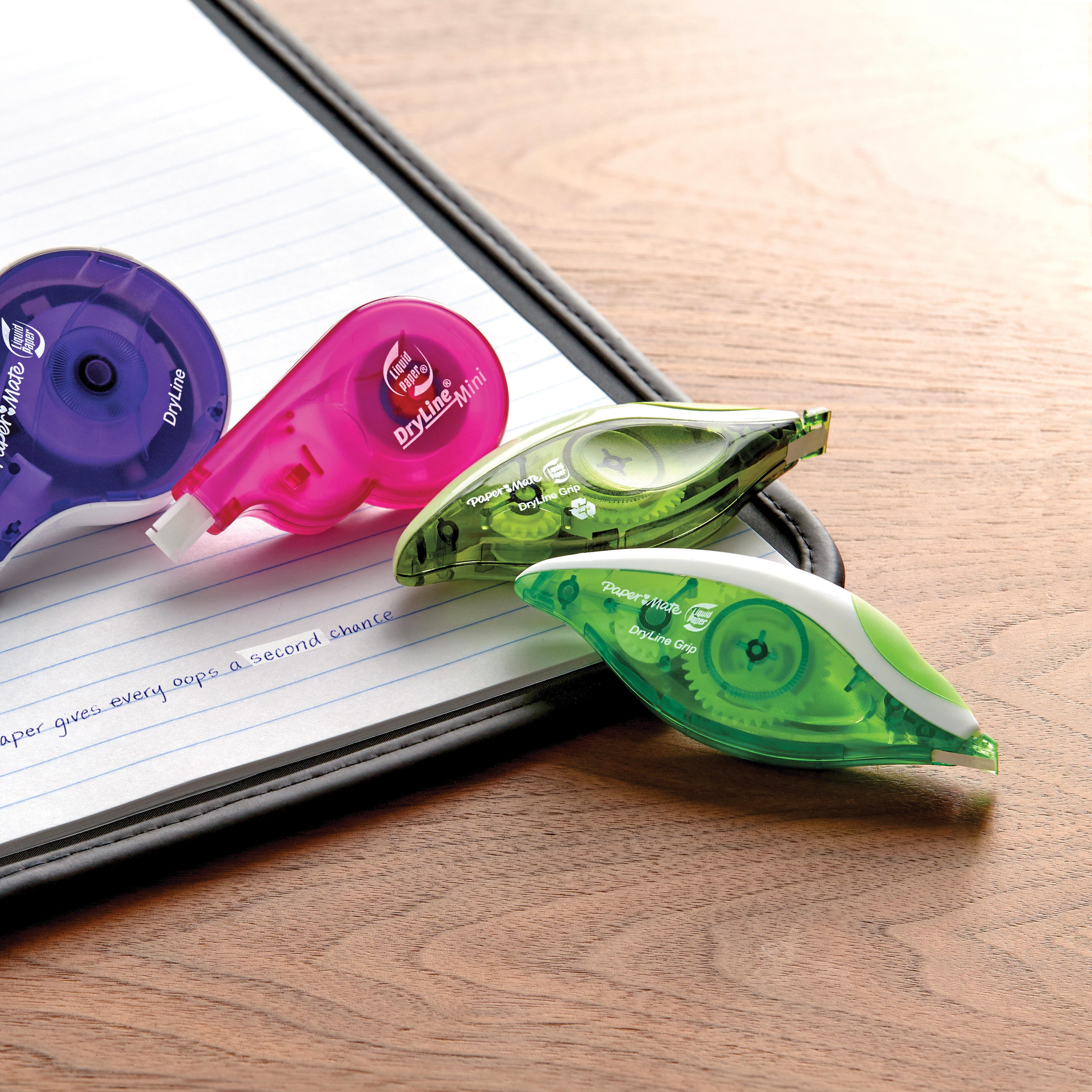Paper Mate Liquid Paper DryLine Correction Tape promises instant, mess-free corrections. Each of the dispensers has a sideways applicator for easy and complete correction and strong, tear-proof tape that applies dry so you don't have to wait to keep writing, typing, or copying. These dispensers are conveniently translucent so you can easily see how much tape you have left, and boast a unique turn-screw feature for easy rewinding in case of loops. The rolls of tape in the dispensers are 1/5 inch x 39-3/10 feet.