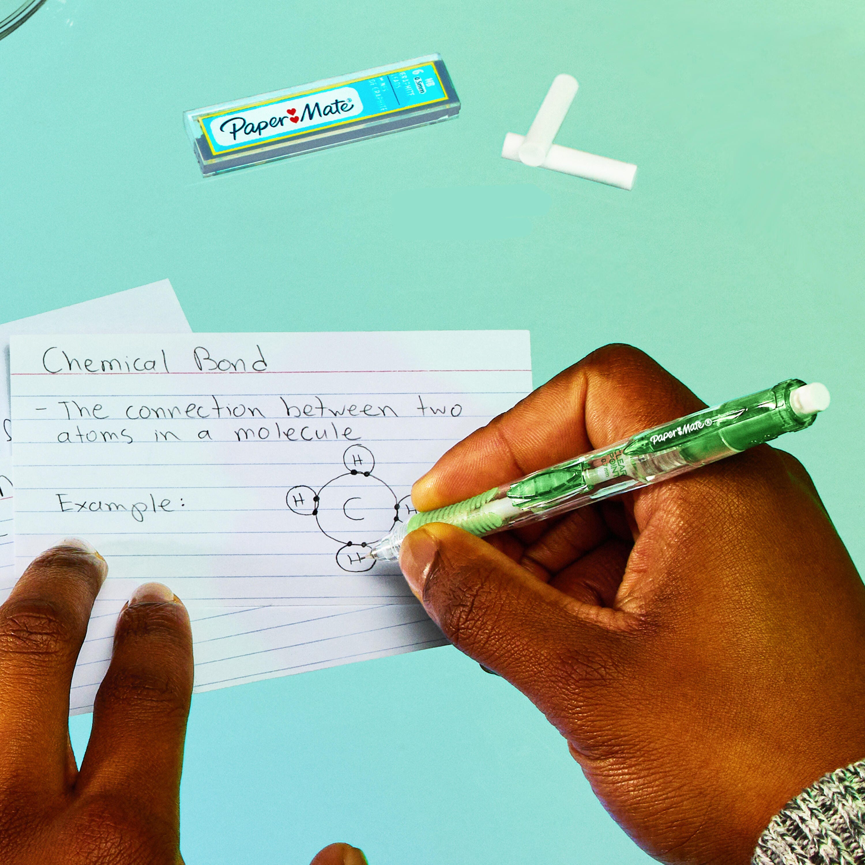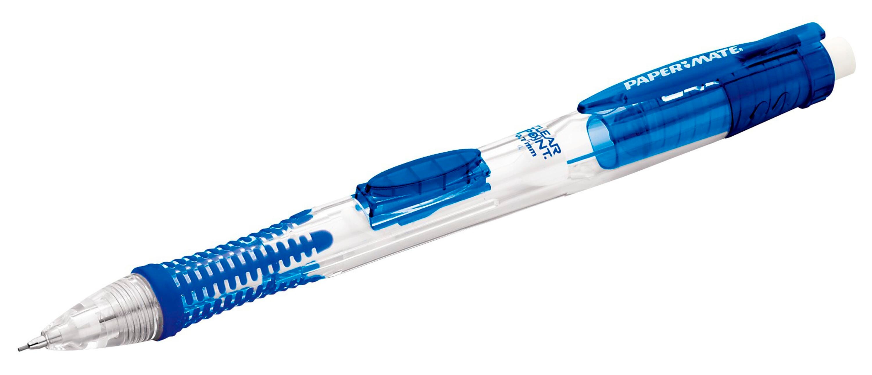 Trust the Paper Mate Clearpoint Mechanical Pencils for a precise, fully-featured writing instrument perfect for standardized tests, drafting, and homework. These pencils feature a convenient side-click advance mechanism on the barrel that advances the lead with just a click. The textured over-molded grip provides comfort and control during long writing sessions, while the jumbo twist-up eraser lets you easily correct mistakes without any smudges or tearing. Colors may vary. This set includes 2 pencils, 2 additional erasers, and 1 container of lead refills.