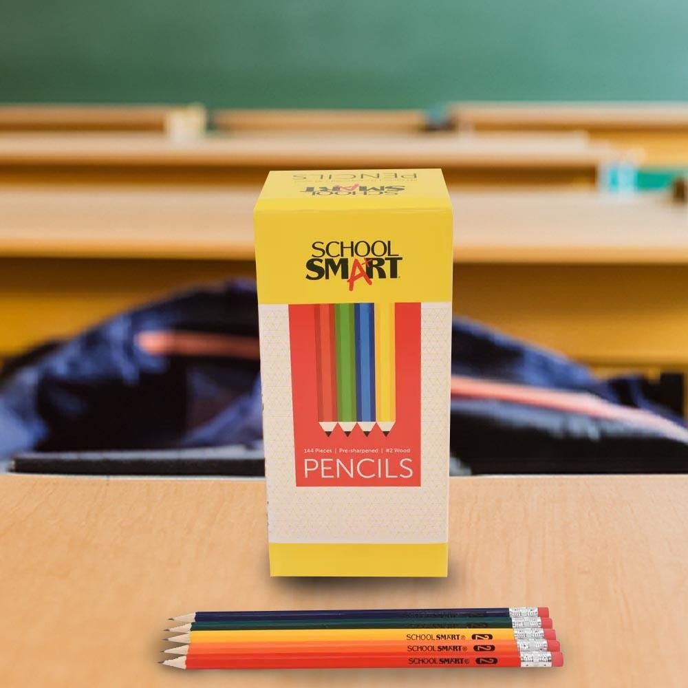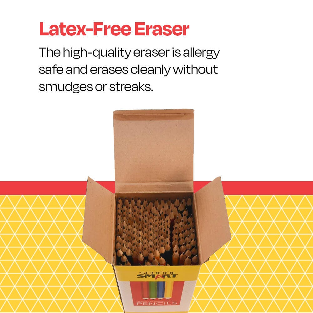 The School Smart assorted body color No 2 pencils bulk pack features pre-sharpened, hexagonal-shaped pencils for a better grip and roll-away resistance. Our classic pencils are made from basswood (comparable to cedar, but more economical) and the strong, lead-free graphite core provides smooth, visible writing. The non-toxic No 2 pencils allow for effortless sharpening and have a latex-free eraser attached. These traditional pencils come pre-sharpened and are sold as a pack of 144.