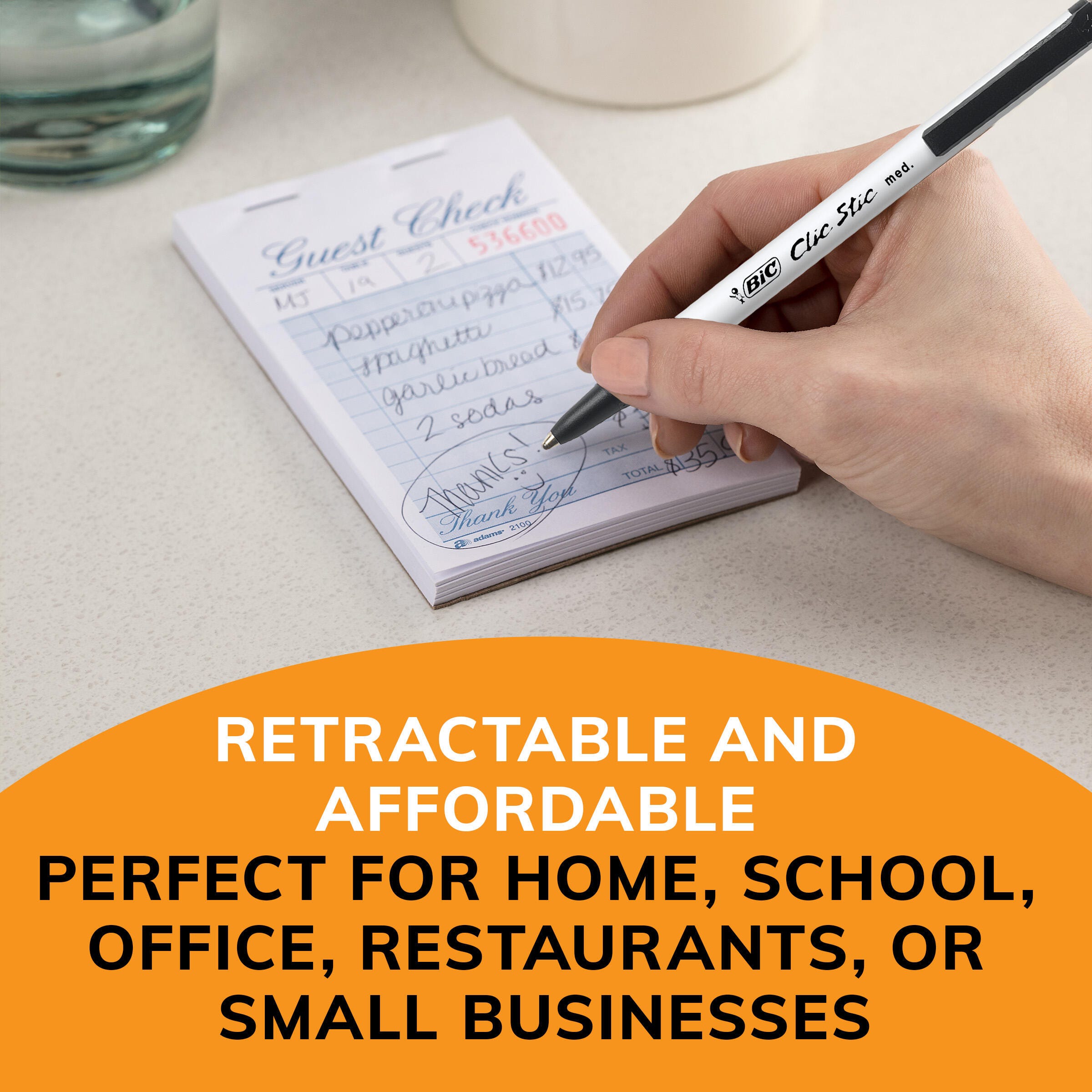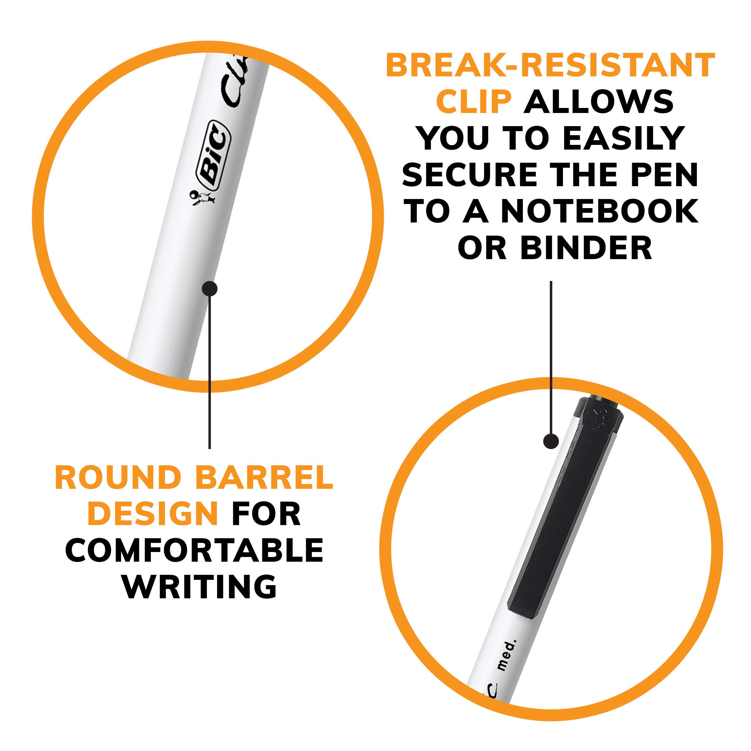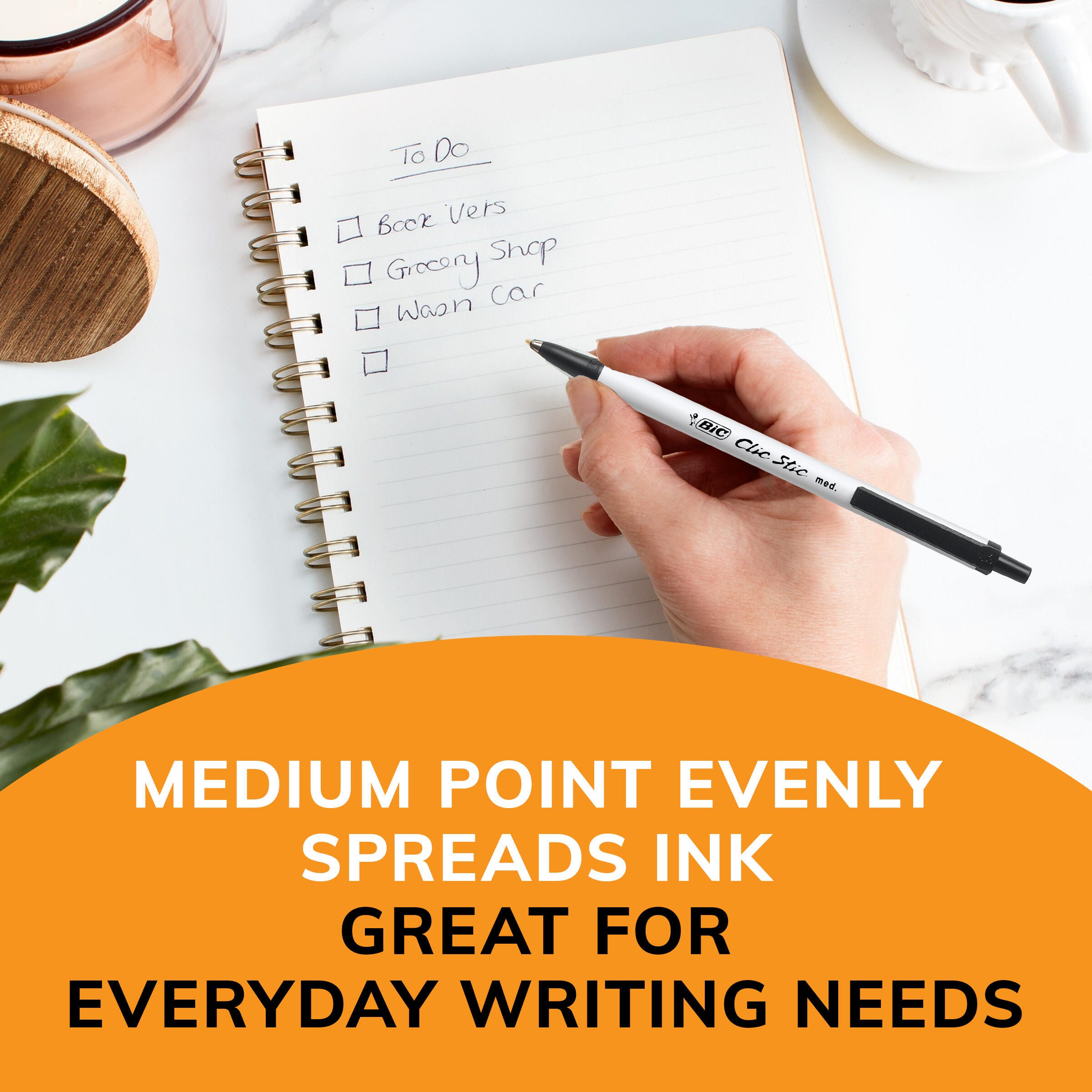 Description Retractable and affordable, the BIC Clic Stic Ballpoint Pens are an excellent choice for everyday writing in any setting. They feature a comfortable round barrel and a break-resistant pocket clip for convenient storage. The smooth black ink and 1.0mm medium ball tip glide over the page, laying consistent, crisp lines. This pack contains 12 black ballpoint pens.Features Smooth round barrel offers lasting comfort High-quality black ink flows onto the page for consistent and skip-free writing Sturdy pocket clip conveniently secures the pen on notebooks, pockets, or packets of paper Reliable ballpoint pens are excellent for taking notes, making to-do lists, journaling, completing paperwork, and more Pack provides great, long-lasting value for classrooms, offices, and homes Includes: 12 Retractable Ballpoint Pens
