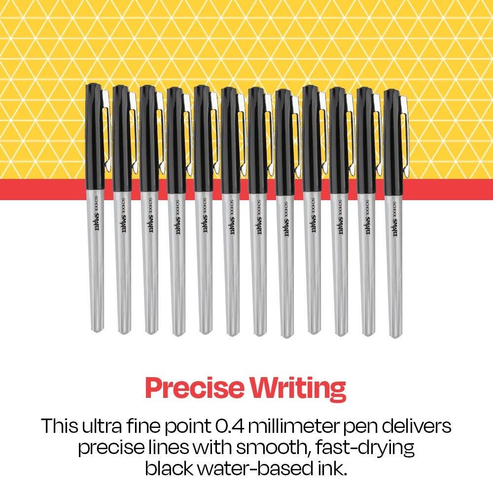 Description These School Smart Ultra Fineliner pens with liquid ink are great for art projects, letters, labeling, and more. The smooth ink flow system features a quick-drying black ink that allows smudge-free writing, drawing, and signing. Use these extra fine point pens with stencils and rulers for precise lines, or sketch freehand.Features Fine, 0.4 mm size is great for artwork, cards, labels, and more Water-based, odorless black ink is quick-drying for smudge-free use for right- and left-handed users Designed with high-quality, non-toxic materials for safety and long-lasting use Handy pocket clip ensures secure storage in clothing or bag pockets while on the go Large pack delivers quality and value to classrooms, offices, and homes