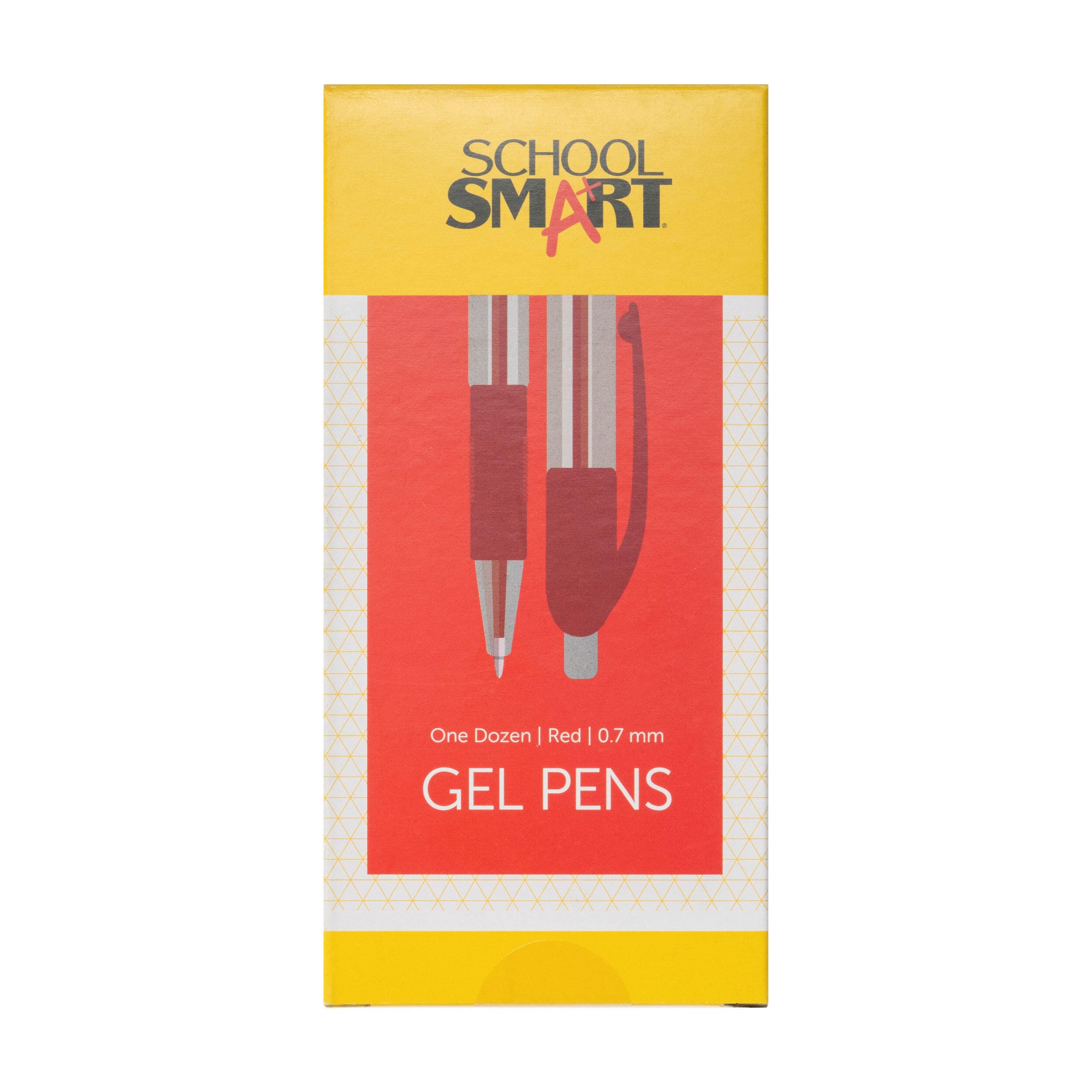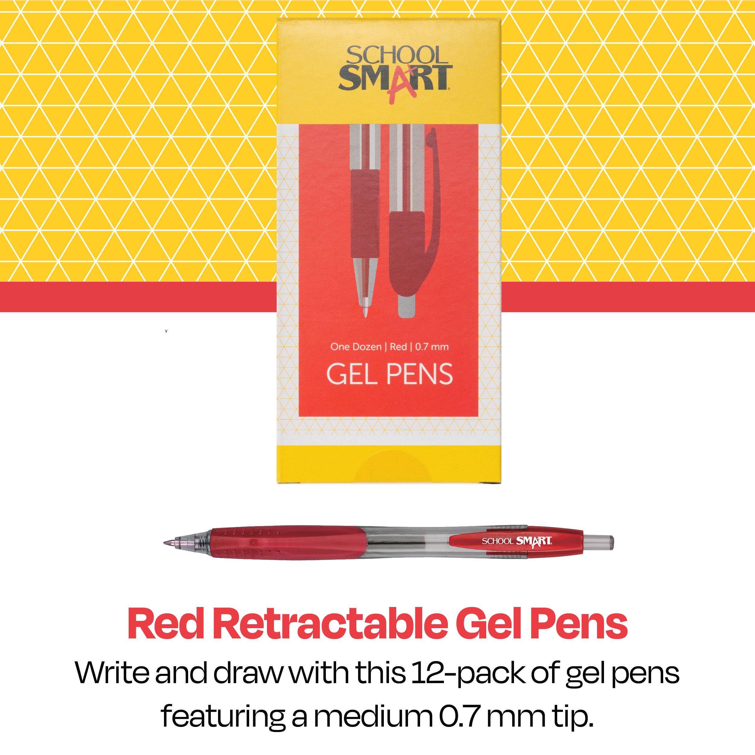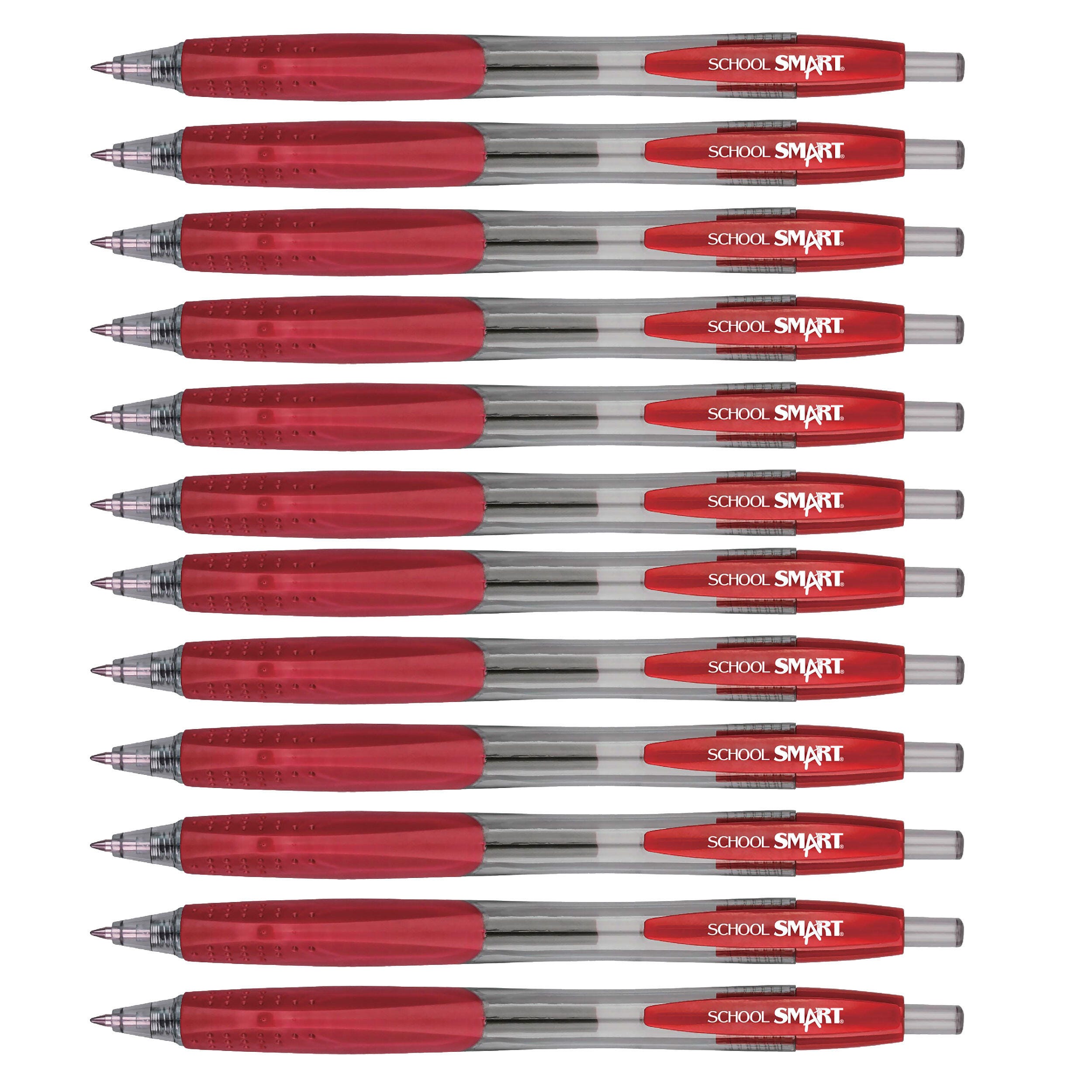 Description School Smart retractable gel pens provide effortless writing and added comfort with a tungsten carbide ball tip and smooth, supple rubber grip. The medium-sized nib is 0.7 mm for all-purpose writing. A spring-loaded ink cartridge retracts and extends outside its protective housing while the clear barrel allows you to see exactly how much ink is left. The value pack of 12 red pens lets you keep them in various locations or on hand for sharing in the office or classroom.Features Each red ink pen has a ballpoint for a smooth, exceptional glide without ink clots or skipping The cap-free retractable click-on/off style helps ensure the ink doesn’t fade or bleed through items when not in use A soft, elongated rubber grip provides reliable comfort and a sturdy hold for long or short note-taking The needle-point tip allows for precise, clean writing for both large and small spaces Our gel click pen pack is great for frequent use at the school, office, or home Includes: 12 Retractable Gel Ink Pens, Red