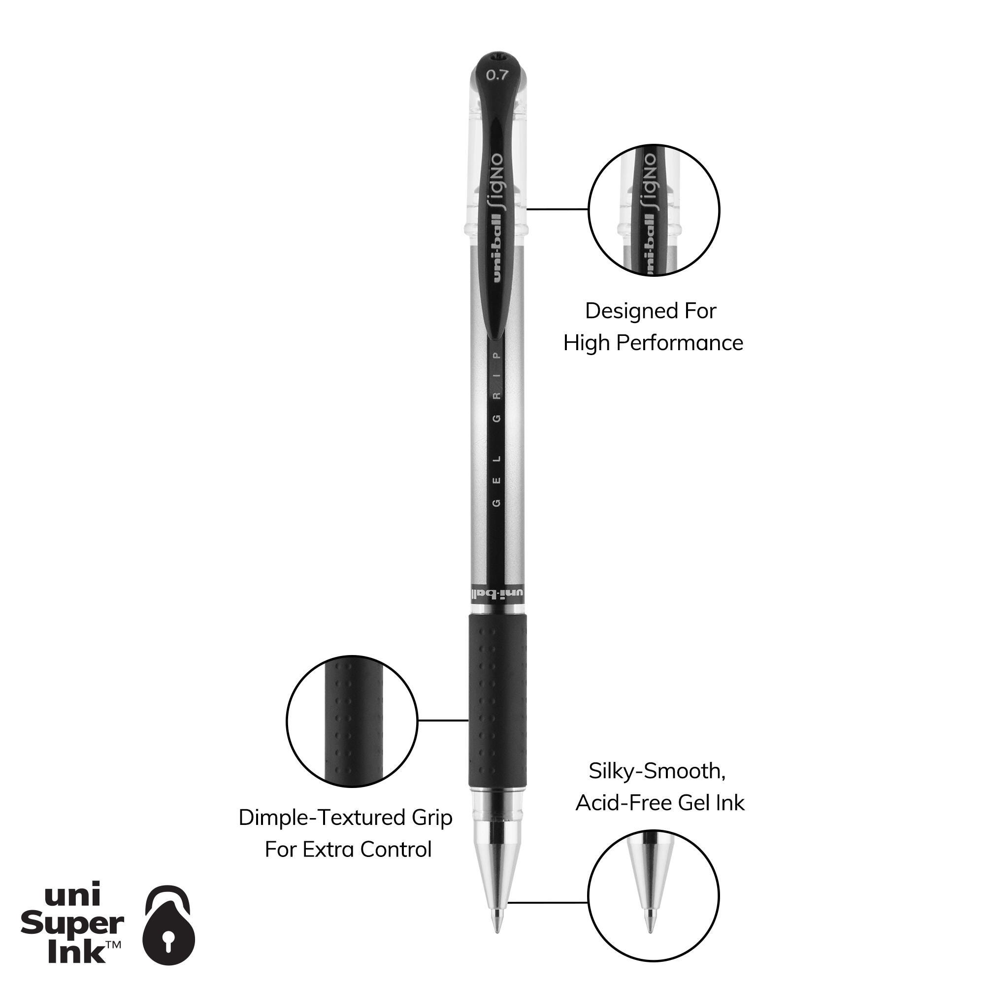 Description This gel pen features a smooth grip for writing comfort with a dimpled texture for gives better traction and control. With a consistent flow of vivid gel ink, this uniball™ pen combines bold lines with a smooth writing experience making it truly a pleasure to write with. You’ll be writing in style with this sleek, stylish design that features metallic accents. Like all uniball pens, it employs the uni Super Ink to protect against water, fading, and fraud.Features Unique, dimpled texture promotes better traction on the page Gel ink is vivid and writes consistently Exclusive pigment-based ink forms an indelible bond in paper for intense coloration and document security Modern look, with metallic accents and stainless steel tip