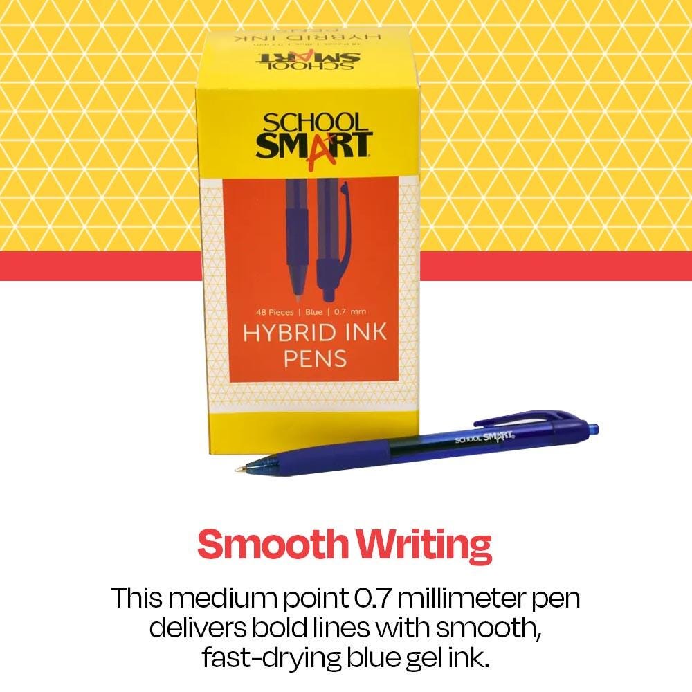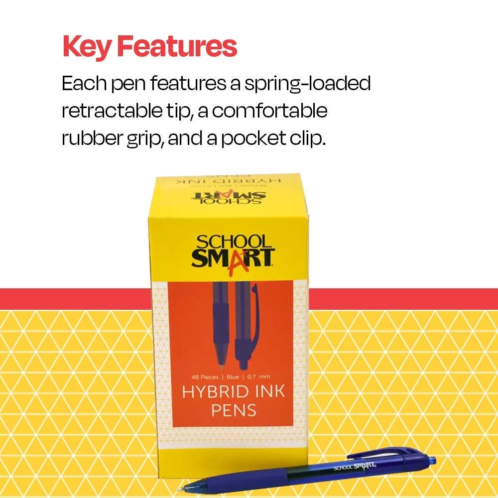 School Smart blue gel and ink pens have a hybrid design to give you the best writing experience. The retractable pens offer high-performance ink technology and a quick dry all in one convenient, comfortable design. Smear-proof and smudge-proof liquid gel ink dries rapidly, allowing you to close up notebooks or seal up letters instantly without worry. A medium-sized nib is 0.7 mm to allow for all-purpose writing. The spring-loaded ink cartridge retracts and extends outside a protective housing, and the clear barrel allows you to see exactly how much ink is left. Choose our hybrid gel ink pens for all of your writing needs.