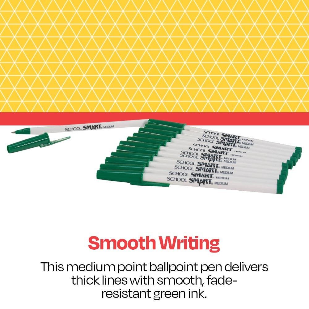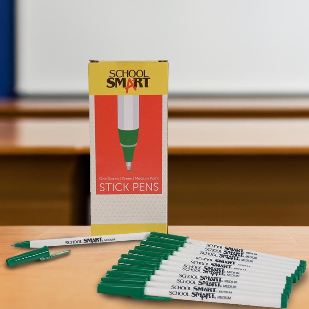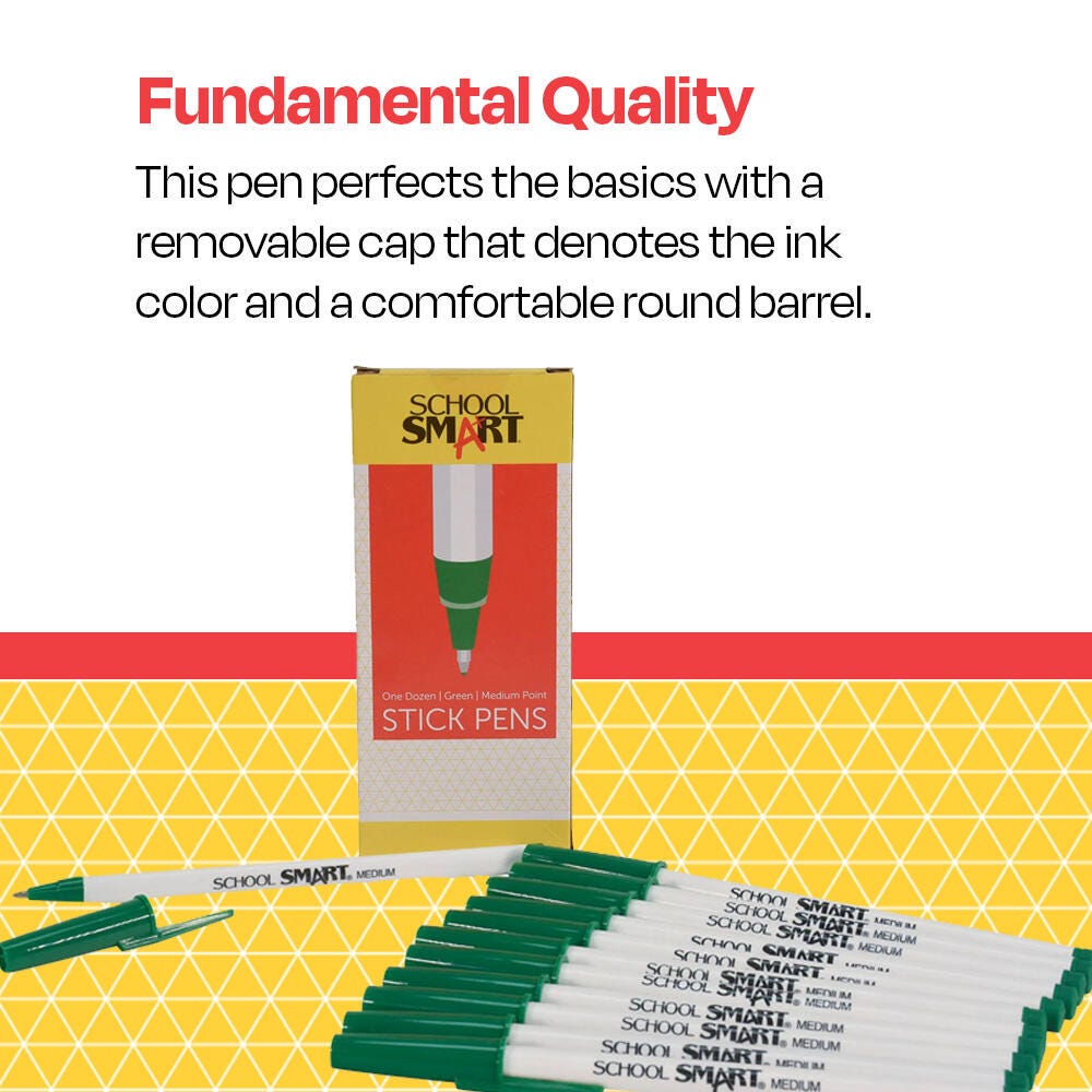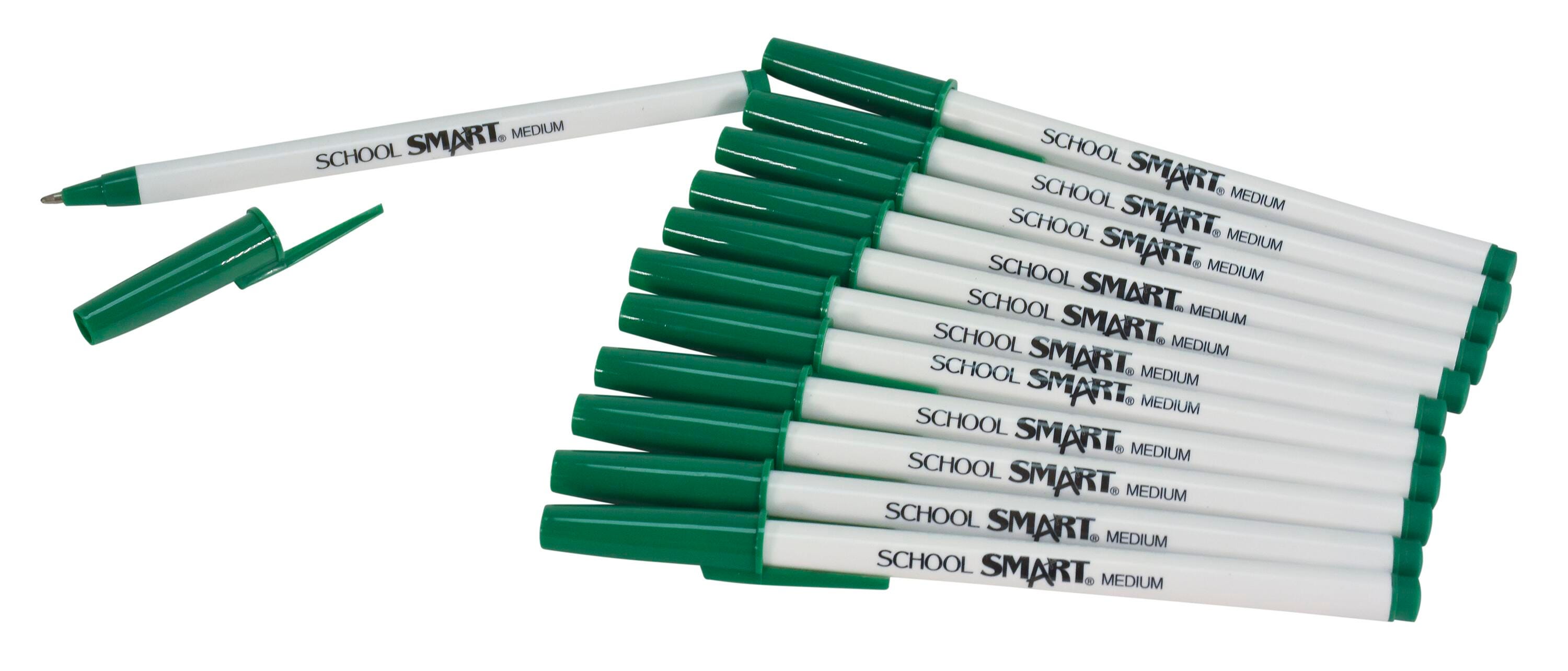 Description School Smart green round stick pens with caps give you the basics at an affordable price. Ideal for daily use, the classic pen is great for taking notes, making lists, creating lesson plans, and more. A green cap matches the color of the ink for easy identification and the closeable design makes it easy to travel with a pen in your pocket or bag. This medium tip pen offers a smooth writing experience wherever you go, whether it’s the classroom, office, or home.Features This value set comes with 12 green pens with caps The pocket-clip cap matches the green ink color A medium tip provides thick, noticeable lines and is great for larger handwriting Enjoy reliable performance with our affordable, high-quality pens Includes: 12 Round Stick Green Pens