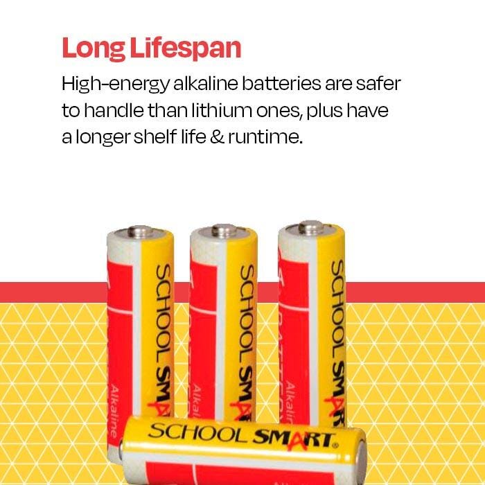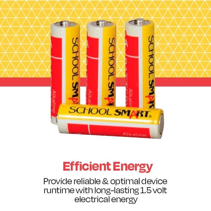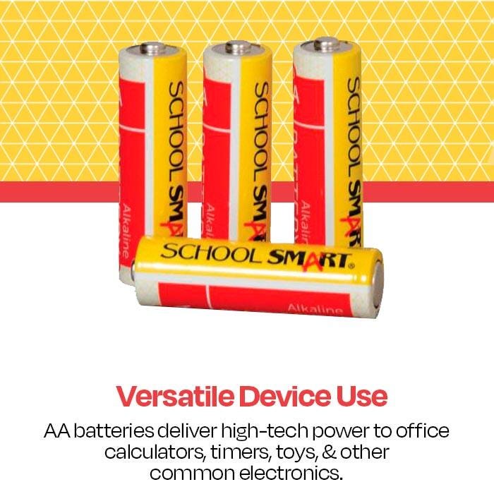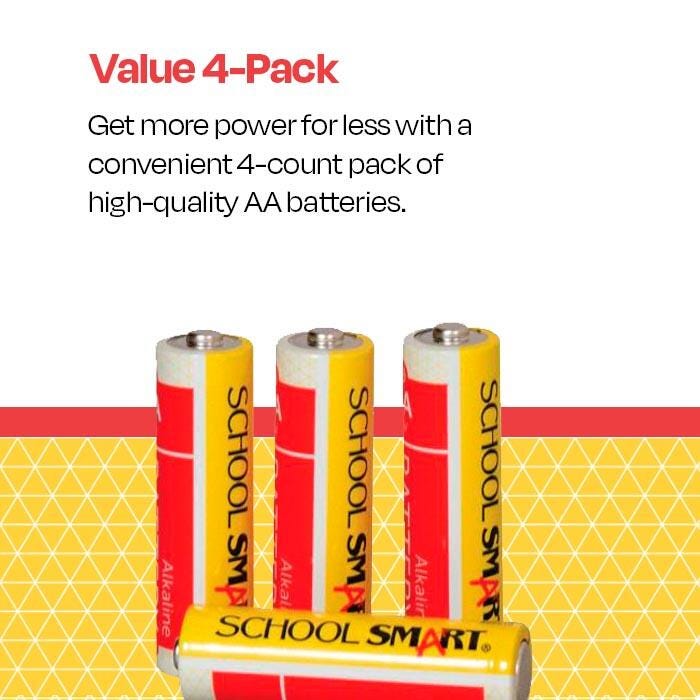 School Smart Alkaline Battery of AA size is built to last for extended use and is priced with the teachers in mind. This long-lasting, high-quality alkaline battery is ideal for everyday use. Provides reliable power for electronics, remote controls, toys, games, flashlights, and battery-operated office equipment. Sold in a pack of 4 batteries.