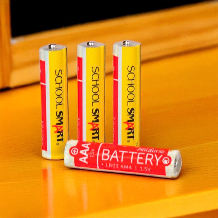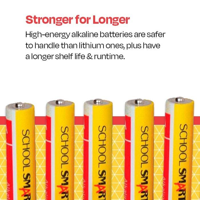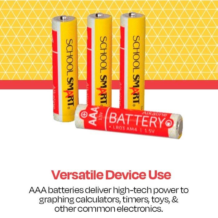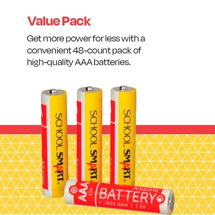 Description School Smart Alkaline Batteries, AAA size, stand up to the rigors of the classroom and are priced with the teacher in mind. This long-lasting, high-quality alkaline battery is ideal for everyday use. Provides reliable power for electronics, remote controls, toys, games, flashlights, and battery-operated office equipment. Sold in a pack of 48 batteries.Features Ideal for game controllers, toys, flashlights, digital cameras, clocks, and more Delivers reliable power with 1.5 volts of energy Safer with a longer life span than lithium batteries These batteries are NOT rechargeable