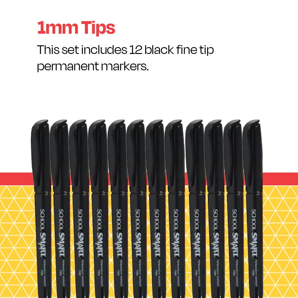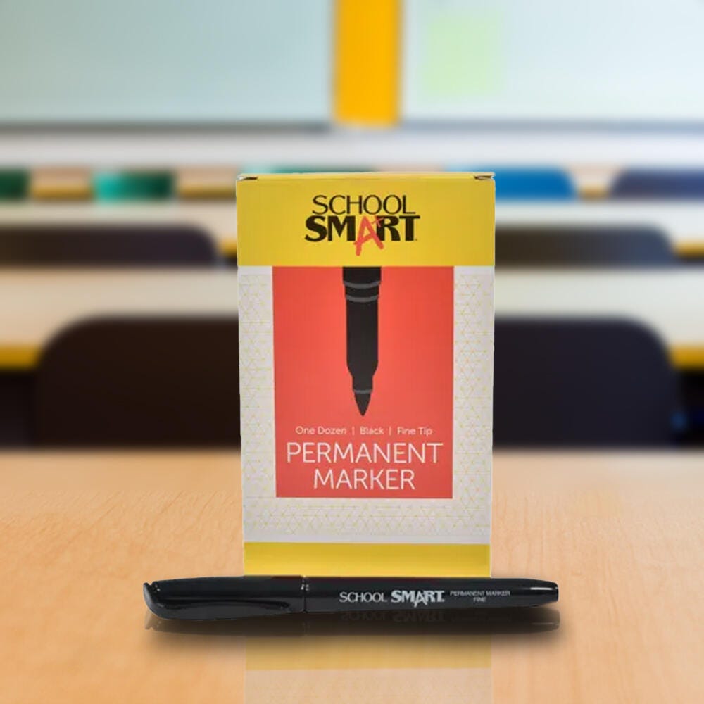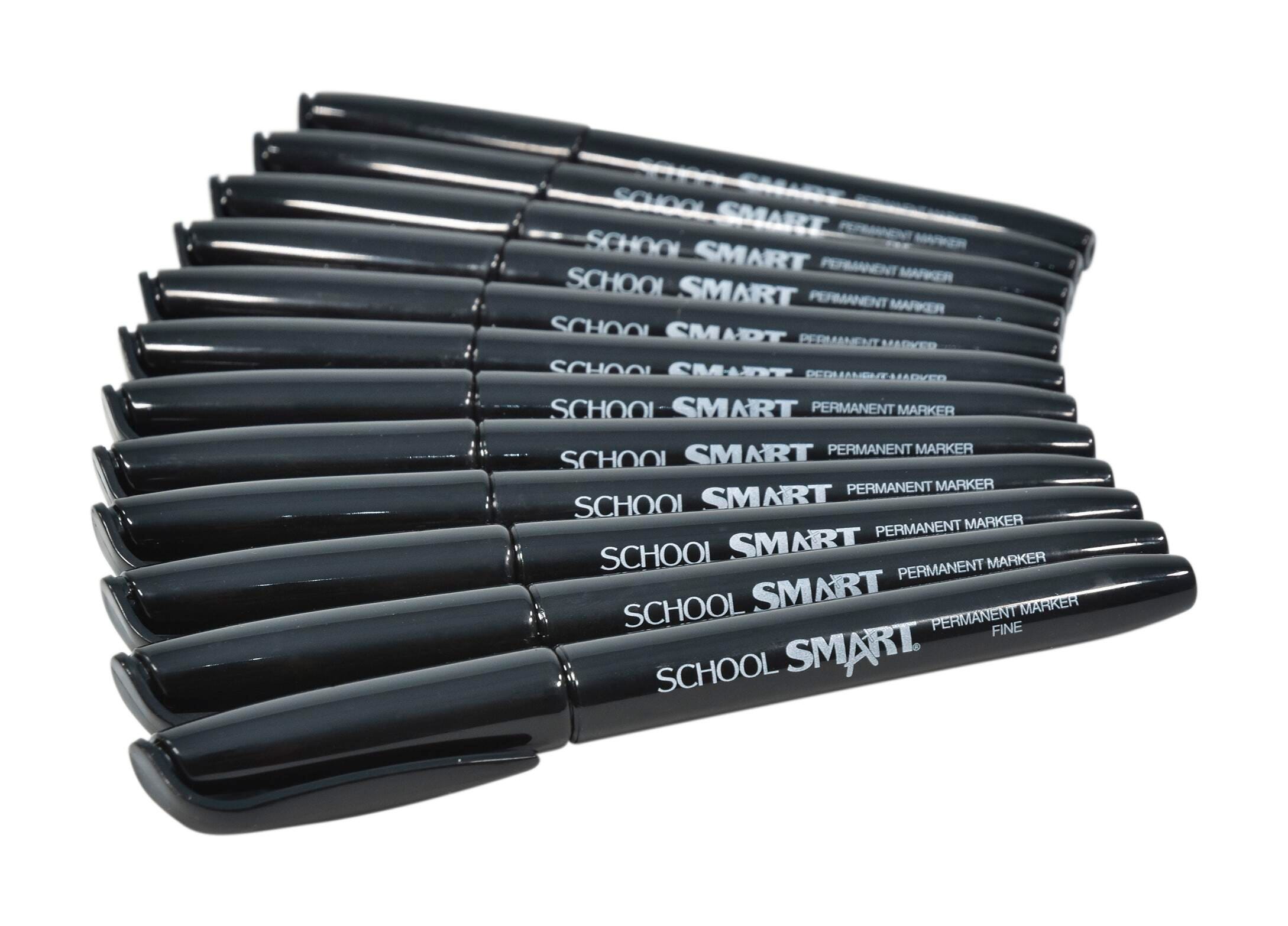 Description School Smart black fine tip permanent markers leave a lasting impression. The quick-drying ink is resistant towards heat, water, and smearing. Our fine line markers are made of high-quality materials with 1 mm fine tips and non-toxic permanent ink. You can use the black marker pens for labeling on most surfaces like acetate films, plastic, ceramic, and glass.Features This fine permanent marker set comes in a value 12 pack The 1 mm tips create smooth, neat lines for personal and professional projects Sturdy marker tips provide precise drawing, color, and writing use and reuse Our precise permanent markers have a water-resistant formula that won't smear or run The high-quality marker pens are non-toxic, quick-drying, and water-resistant This dozen pack of black fine tip markers is great for school, office, and home use Includes: 12 Fine Tip Markers, Black