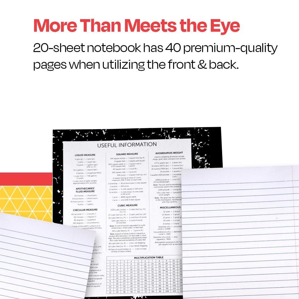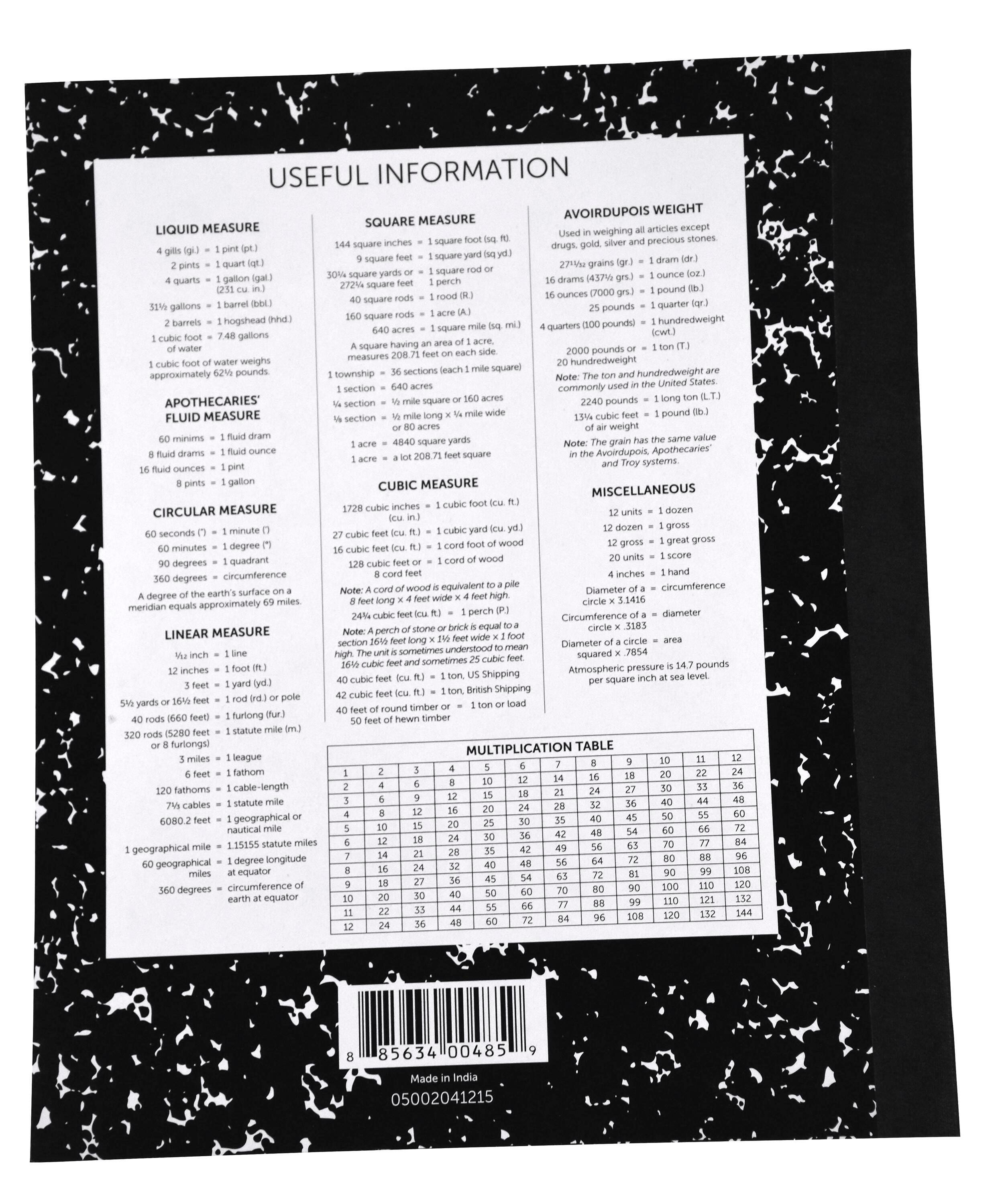 Popular black marble pattern covers are taped and sewn to 15 lb white sulphite paper. Created with 20 sheets 40 pages that have a 3/8 inch wide rule with red margin lines. Covers have space where students can write their name, school, and grade. Useful weights and measures information is printed on the back cover.
