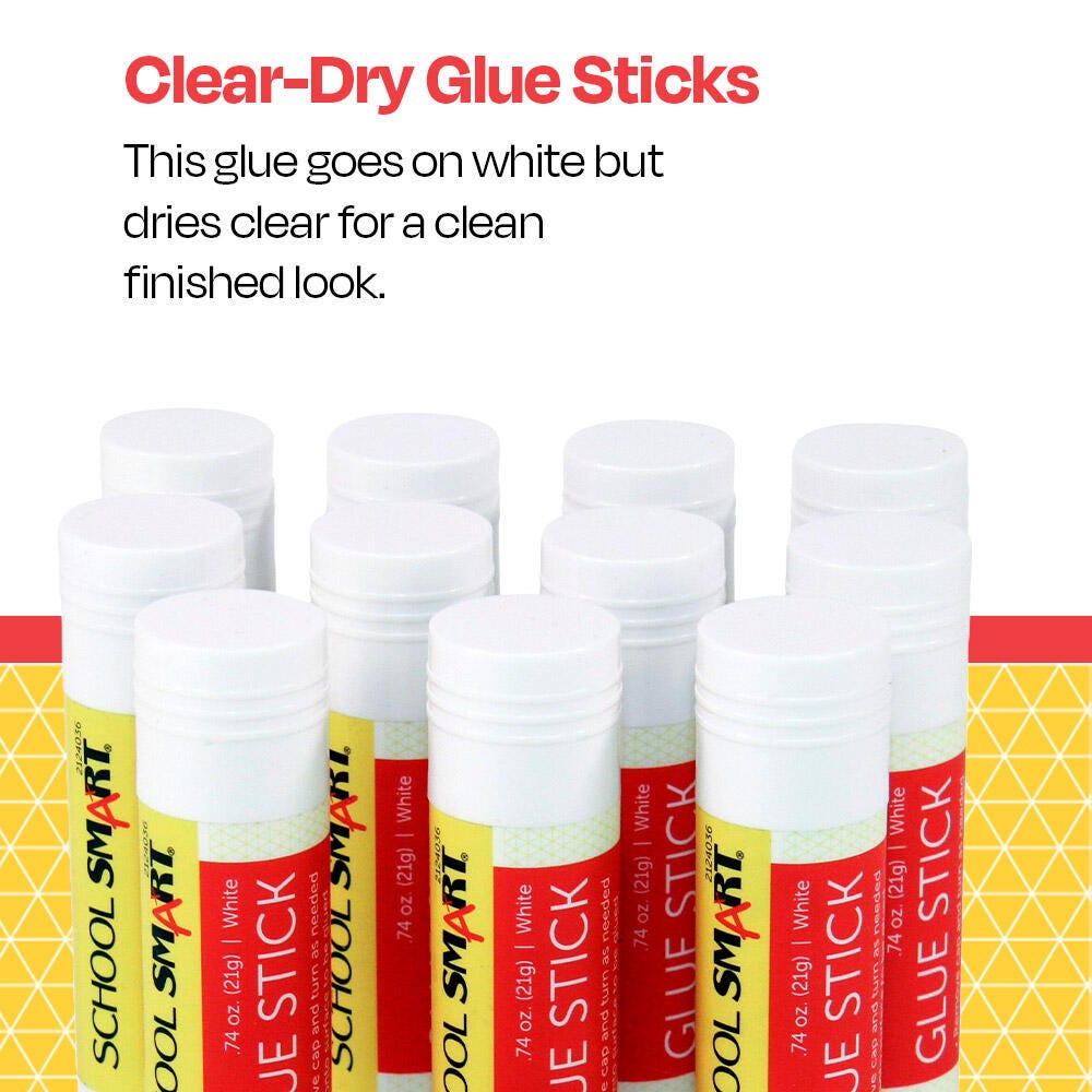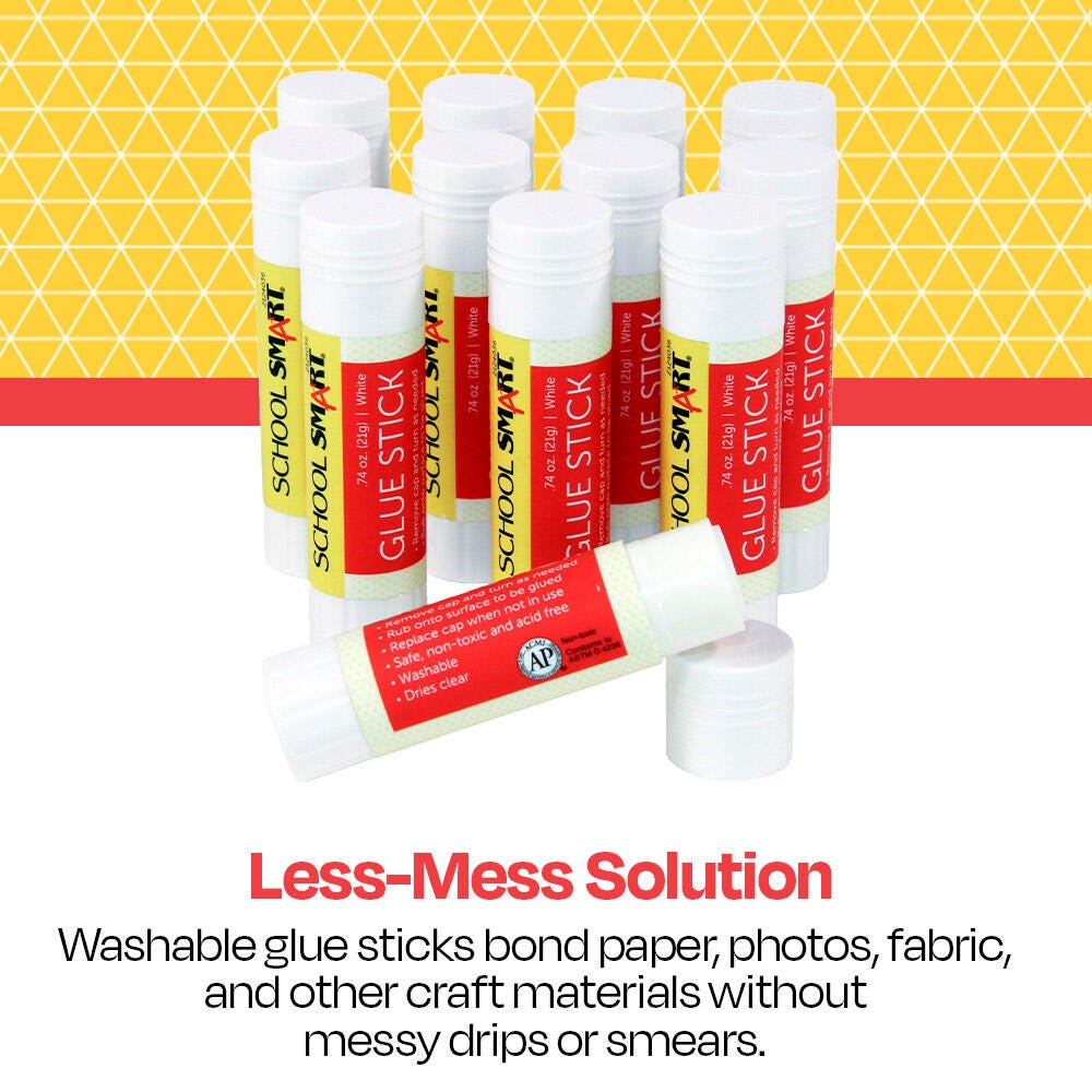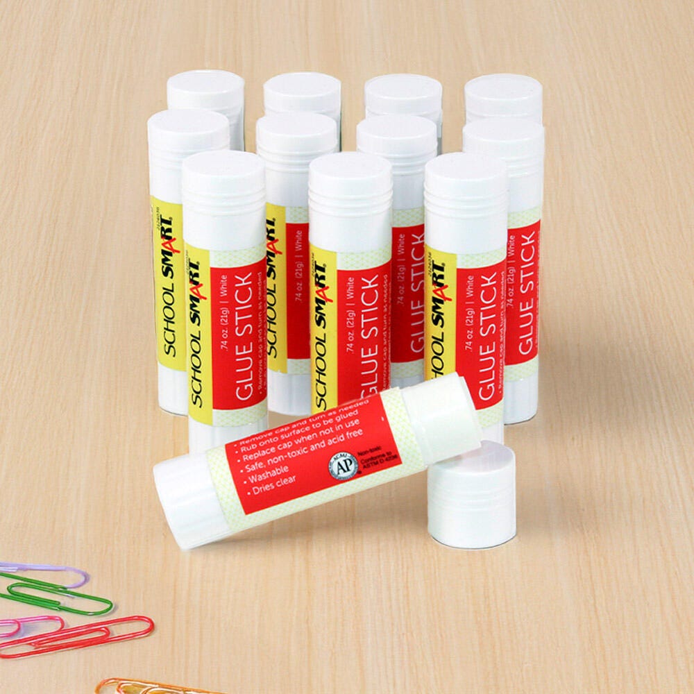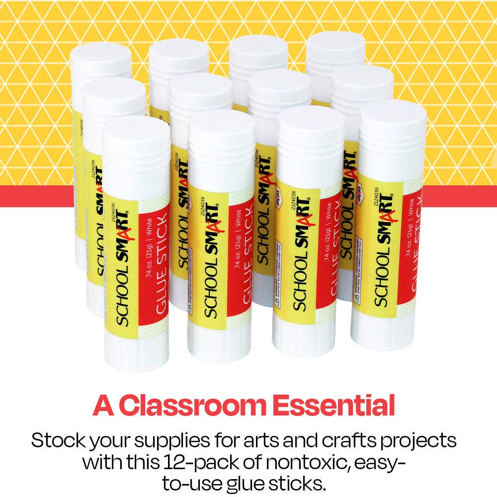 Description School Smart delivers this pack of large glue sticks for crafting and creativity in the classroom, office, or home. These quality glue sticks have a screw and twist-up applicator to bond pieces of paper, photos, fabric, cardboard, and more. The glue applies white and dries to a clear, non-visible translucent color. Its formula is nontoxic, acid-free, gluten-free, photo-safe, and has a long shelf life of up to 2 years. AP certified by ACMI. Recommended for ages 3 and up.Features Acid-free glue sticks are a mess-free bonding choice for scrapbook and craft projects Simple stick format and twist-up applicator are great for beginners and young crafters Large sticks provide more glue to stock your supplies Drip-free glue rubs on to surfaces easily, smoothly, and completely White glue is visibly easy to track yet dries clear for a clean, crisp look Dozen pack of glue sticks provides quality and value for classroom, office, or home projects