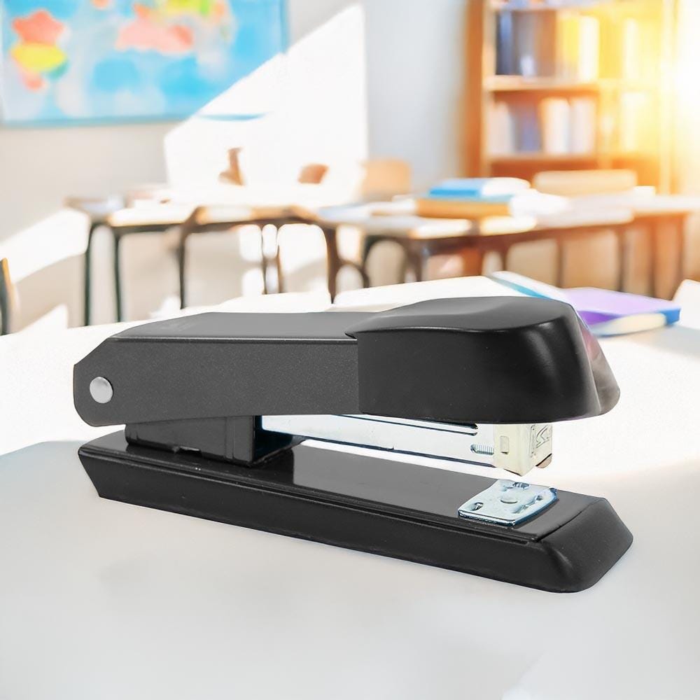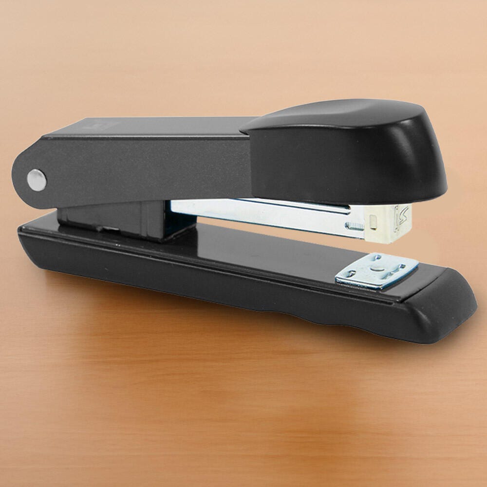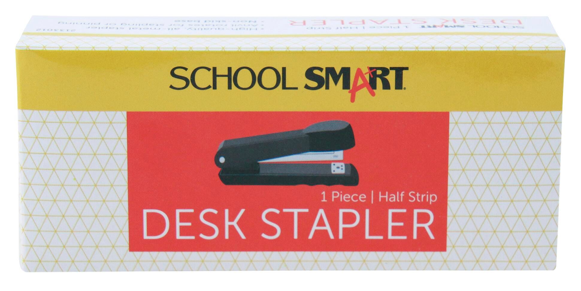 Description Keep your papers organized with School Smart’s Half Strip Stapler. It fastens up to 10 sheets of 20 lb basis weight paper and features a no-jam inner channel that keeps staples aligned. This stapler has an open channel design that makes it easy to load with standard staples. Made of durable metal, it also features an anvil that rotates for stapling or pinning and a full non-skid rubber pad for handling comfort.Features Compact design with half-strip capacity helps to save space on small desks or shelves Designed with an all-metal construction for long-lasting durability and reliability Versatile rotating anvil allows for standard stapling or for pinning when a less permanent fasten is desired or needed Full-length rubber pad on the bottom provides a comfortable grip and keeps the stapler secure when used on desk tops or tables Helpful tool for schools, offices, homes, or arts and crafts projects