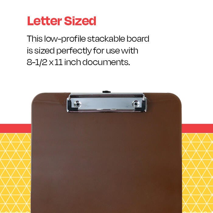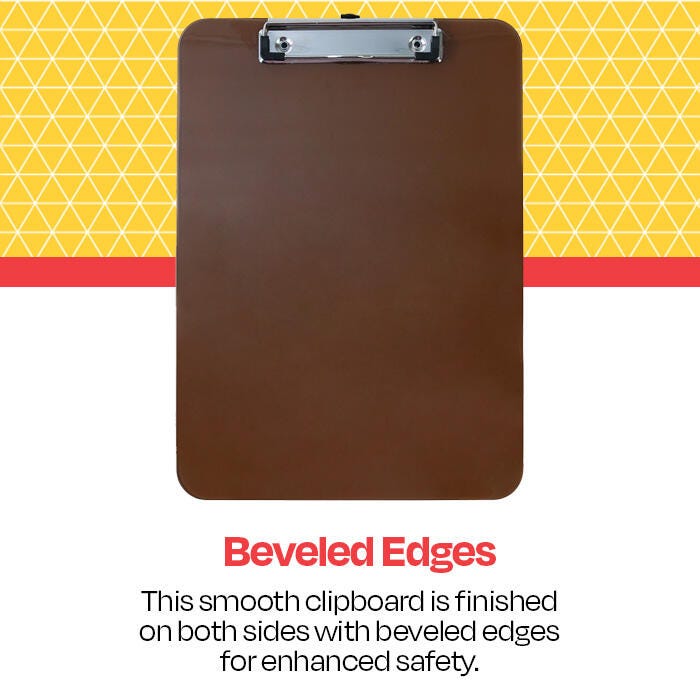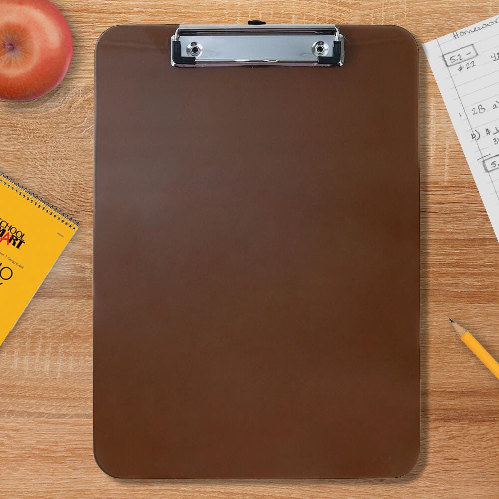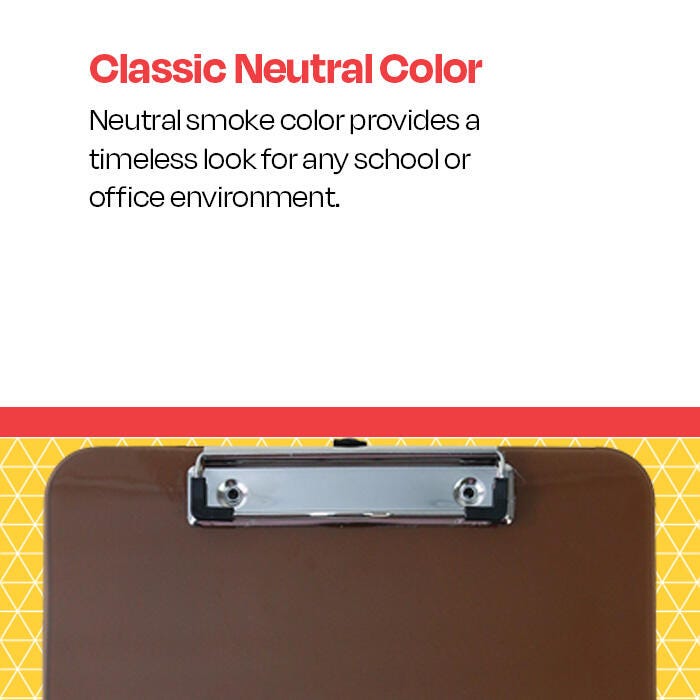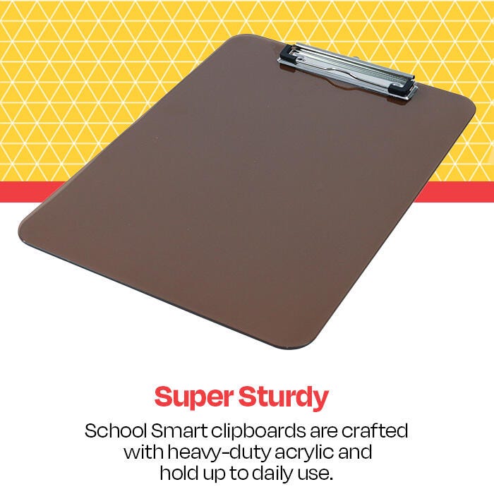 Description Keep notes, papers, and lists handy wherever you are with School Smart’s Low-Profile Clipboard. This clipboard, measuring 12-3/8 x 8-7/8 x 5/8 inches, is made of translucent plastic in a neutral smoke color and features holes for easy hanging. Stackable and letter-sized, it has a smooth edge that adds an elegant look and is an ideal addition to your office supplies.Features Sturdy metal clip with corner grips holds papers and notepads securely Neutral smoke color provides a timeless look for any school or office environment Durable acrylic board stands up to the wear and tear of daily use