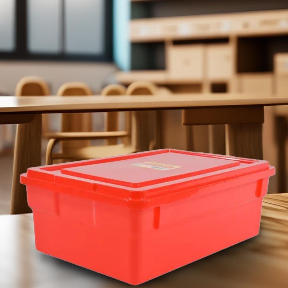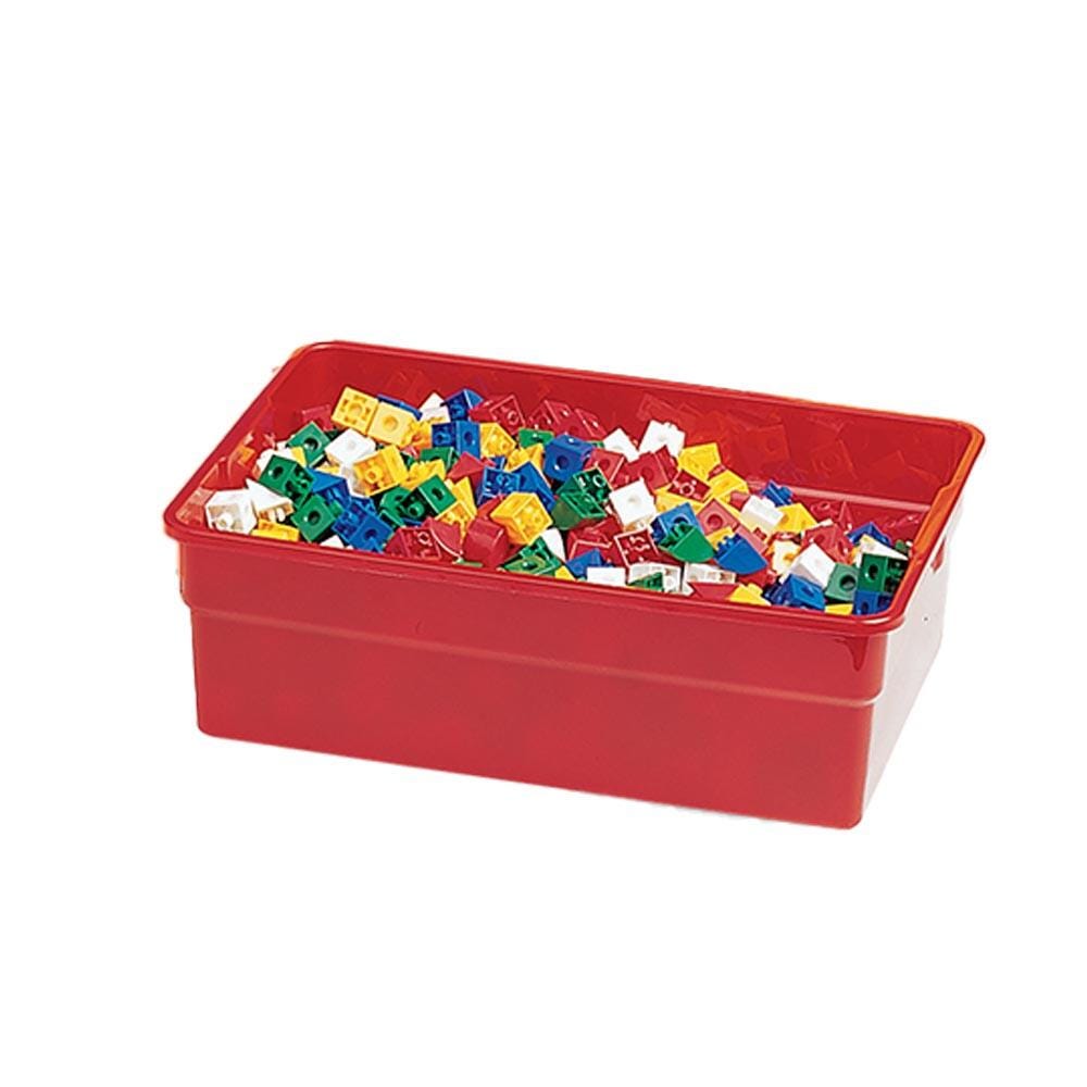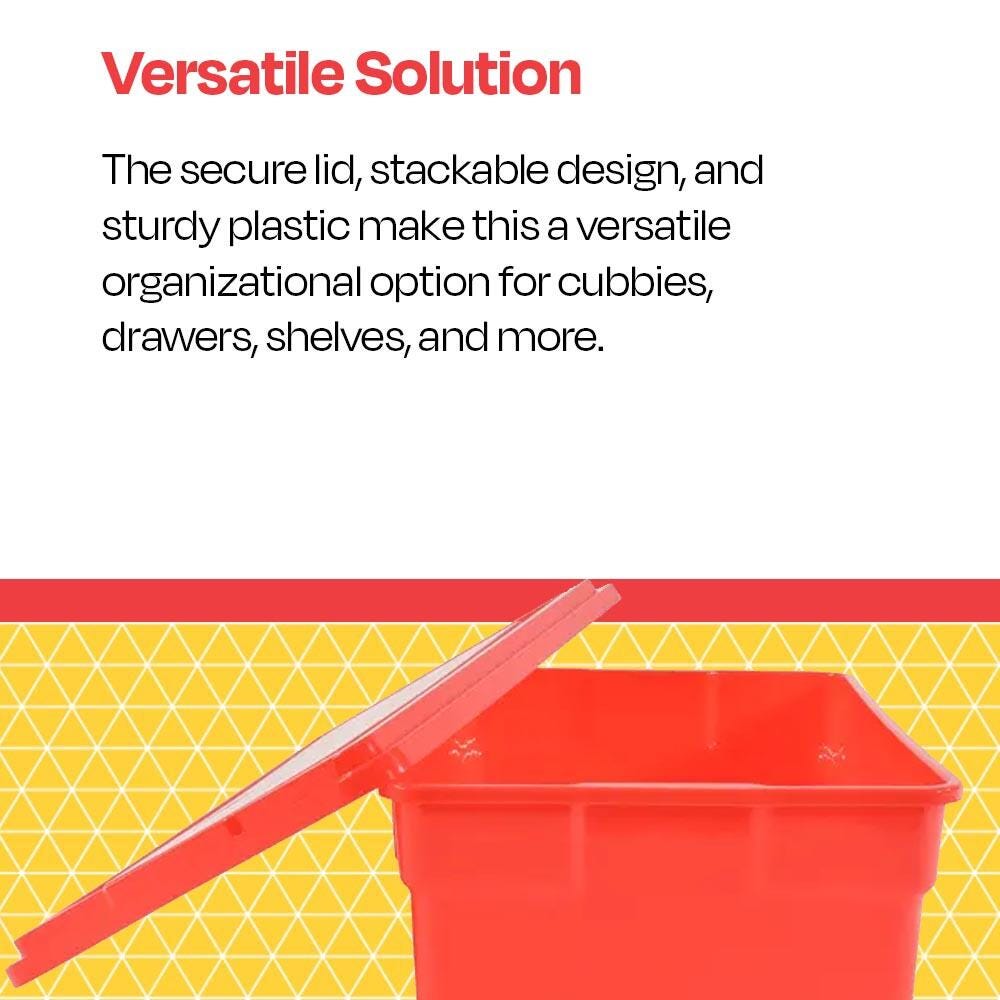 The School Smart red plastic cubby bin with lid can store school supplies, arts and crafts materials, toys, blocks, and more. Our versatile, stackable storage container can be used alone, stored within deeper drawers, or compiled into other storage containers. The included lid secures down firmly on top to help prevent young children from taking items out of the storage tub.