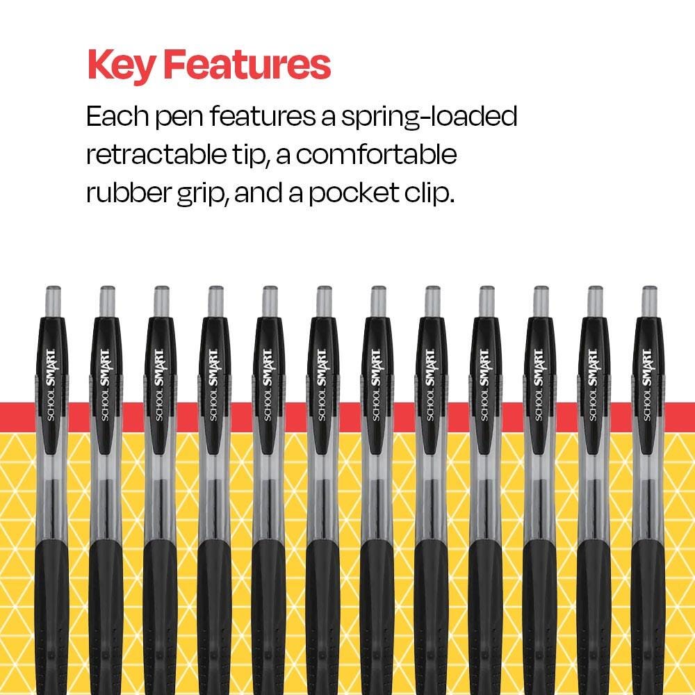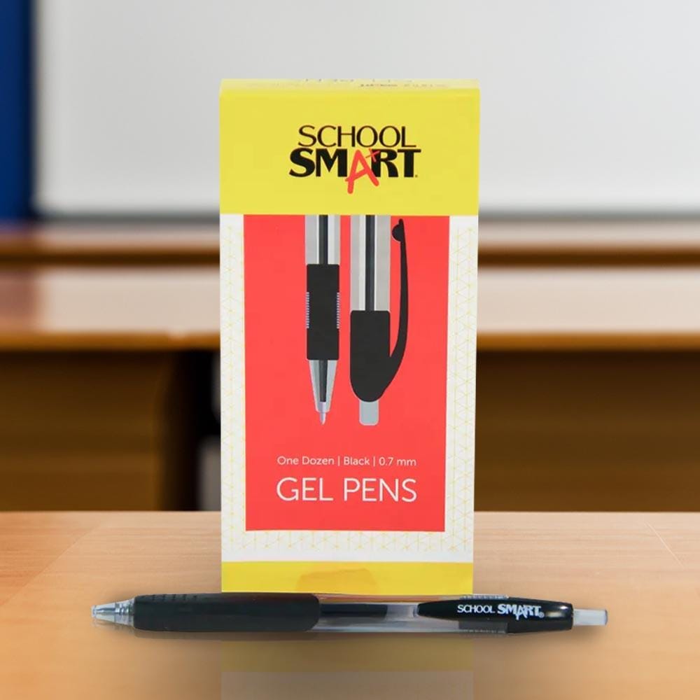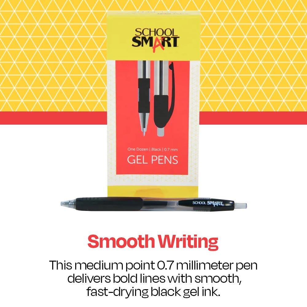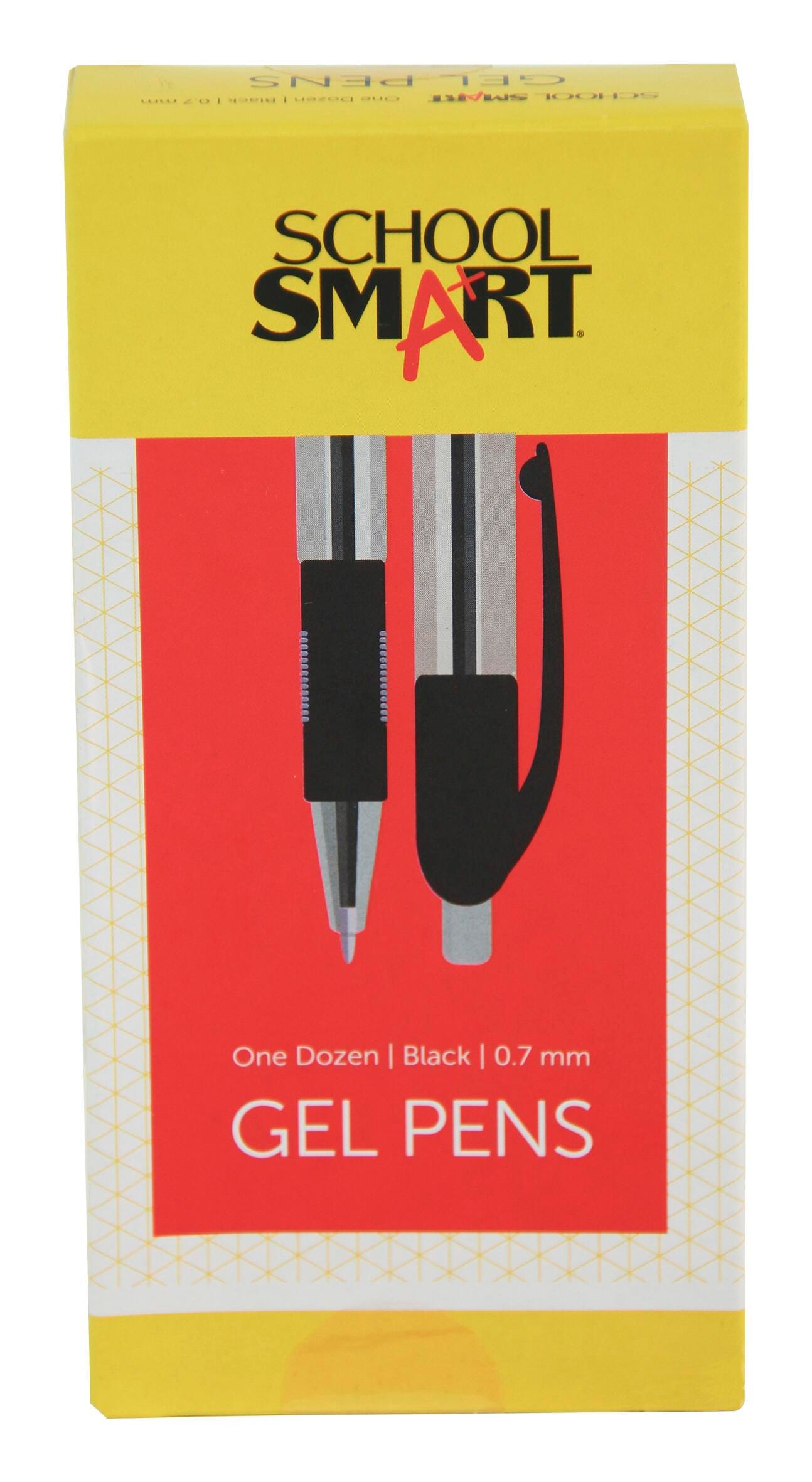 Description School Smart retractable gel pens provide effortless writing and added comfort with a tungsten carbide ball tip and smooth, supple rubber grip. The medium-sized nib is 0.7 mm for all-purpose writing. A spring-loaded ink cartridge retracts and extends outside its protective housing while the clear barrel allows you to see exactly how much ink is left. The value pack of 12 black pens lets you keep them in various locations or on hand for sharing in the office or classroom.Features Each black ink pen has a ballpoint for a smooth, exceptional glide without ink clots or skipping The cap-free retractable click-on/off style helps ensure the ink doesn’t fade or bleed through items when not in use A soft, elongated rubber grip provides reliable comfort and a sturdy hold for long or short note-taking The needle-point tip allows for precise, clean writing for both large and small spaces Our gel click pen pack is great for frequent use at the school, office, or home Includes: 12 Retractable Gel Ink Pens, Black