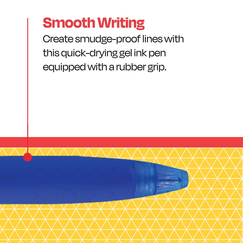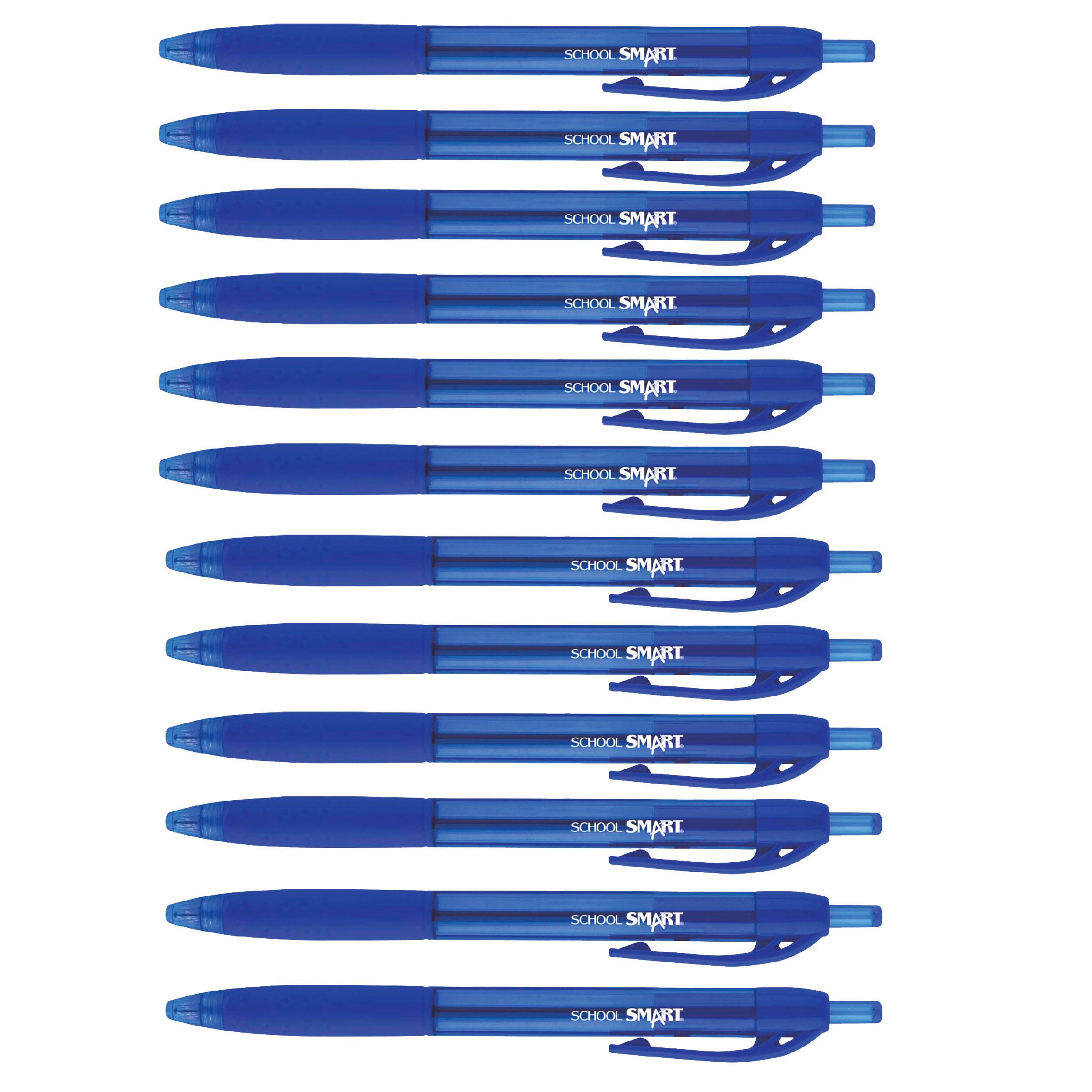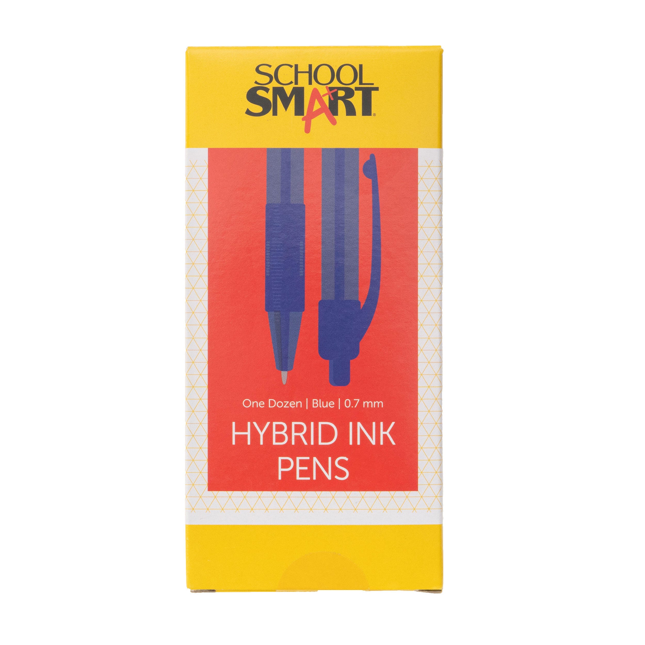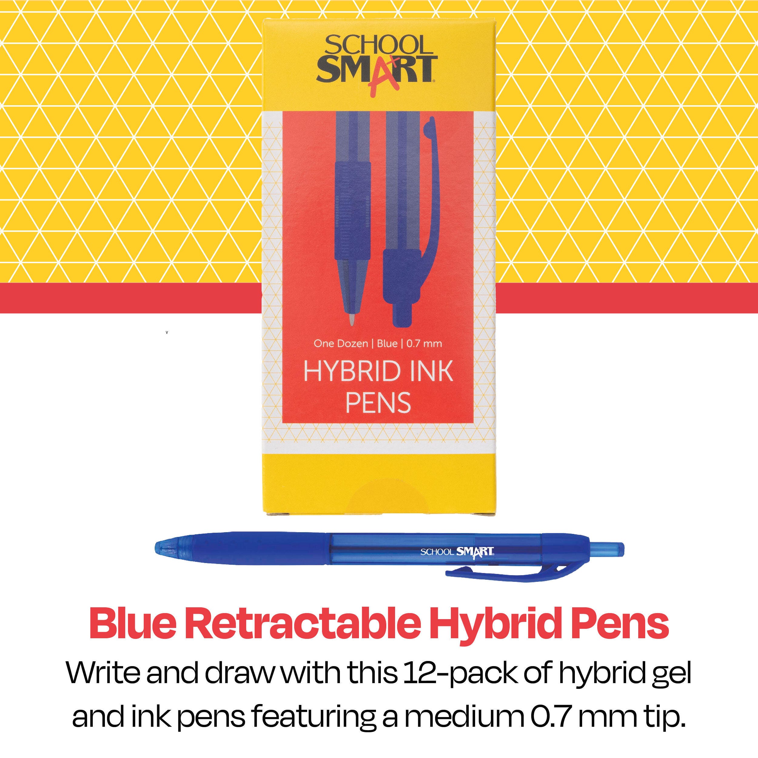 School Smart blue gel and ink pens have a hybrid design to give you the best writing experience. The retractable pens offer high-performance ink technology and a quick dry all in one convenient, comfortable design. Smear-proof and smudge-proof liquid gel ink dries rapidly, allowing you to close up notebooks or seal up letters instantly without worry. A medium-sized nib is 0.7 mm to allow for all-purpose writing. The spring-loaded ink cartridge retracts and extends outside a protective housing, and the clear barrel allows you to see exactly how much ink is left. Choose our hybrid gel ink pens for all of your writing needs.
