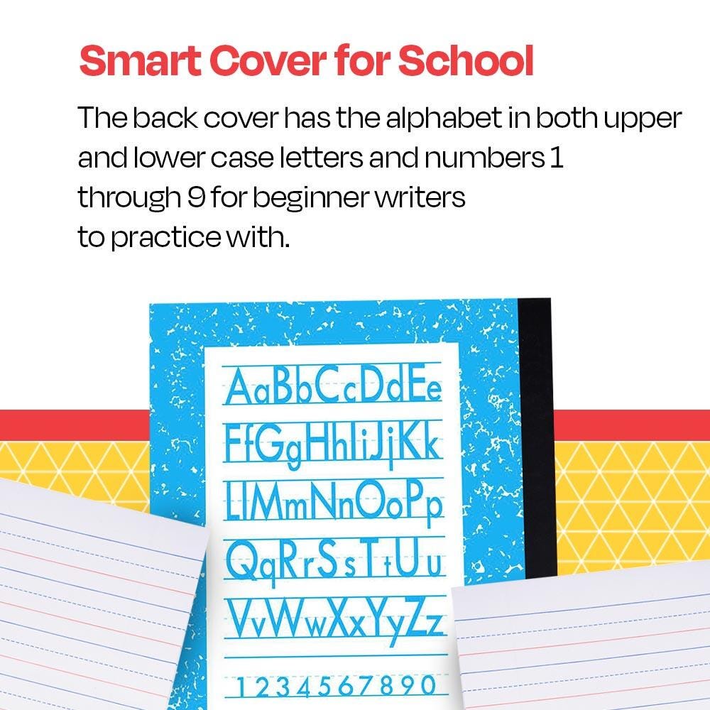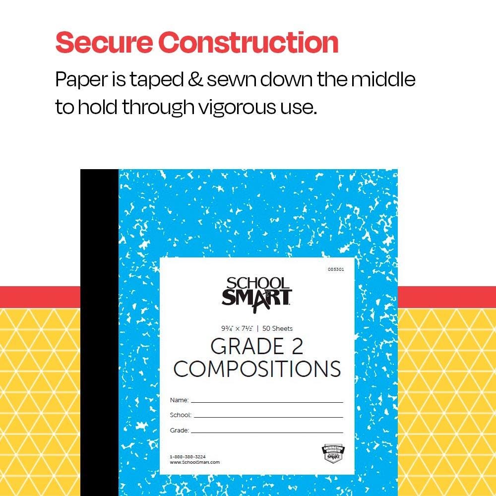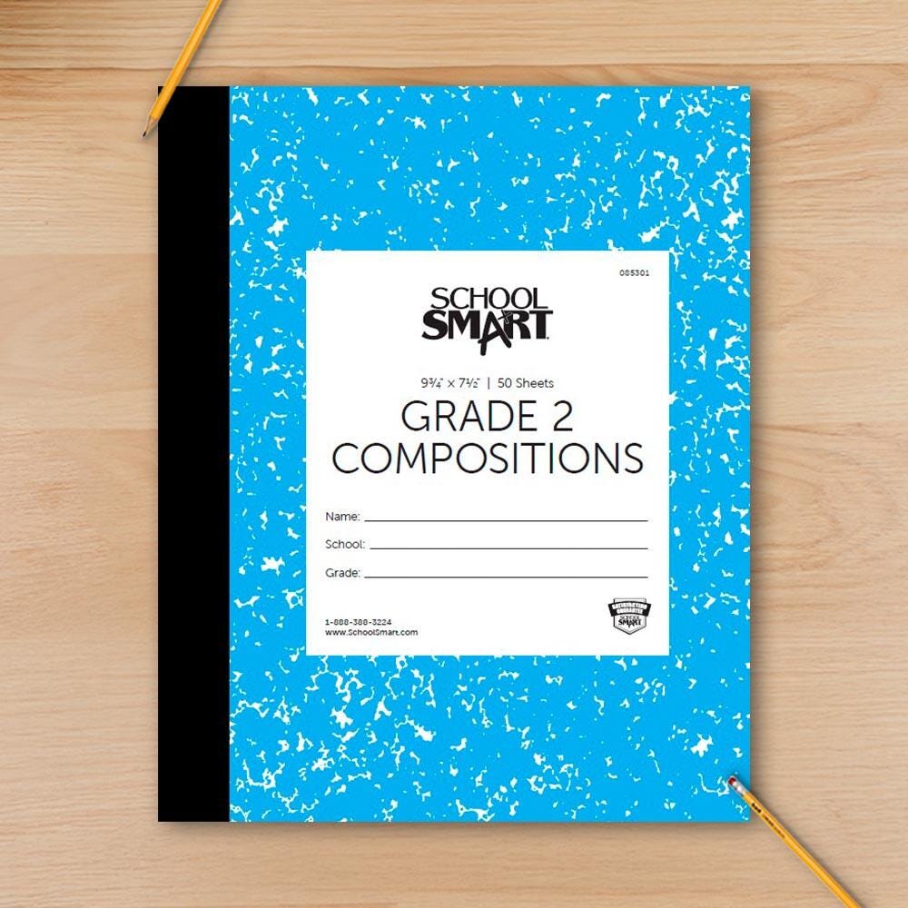 Grade 2 Composition Books measure 9-3/4 x 7-1/2 inches and have a flexible blue marble pattern cover. Books contain 50 sheets of 100 pages with 3/4 inch ruling a 3/8 inch red margin and a skip space that offers room for beginning writers.