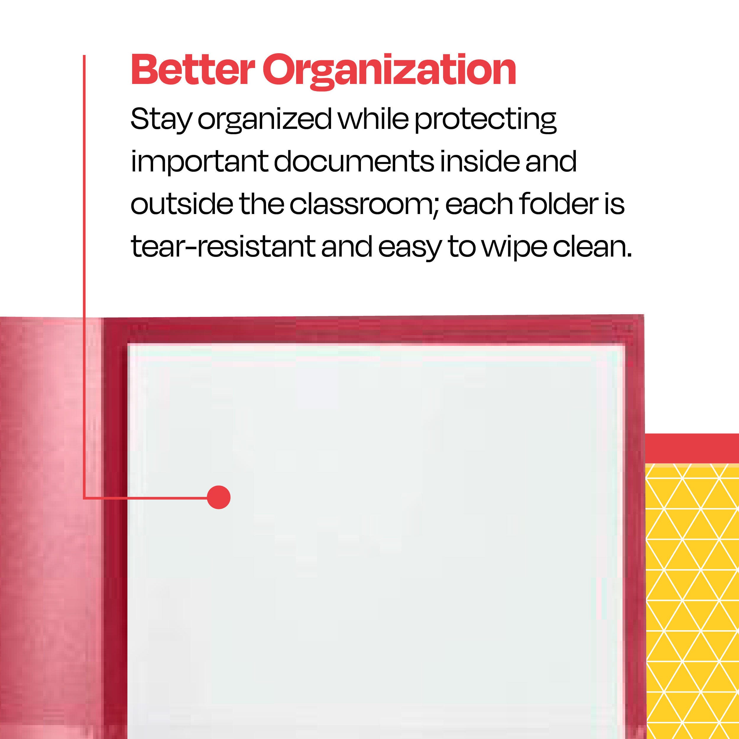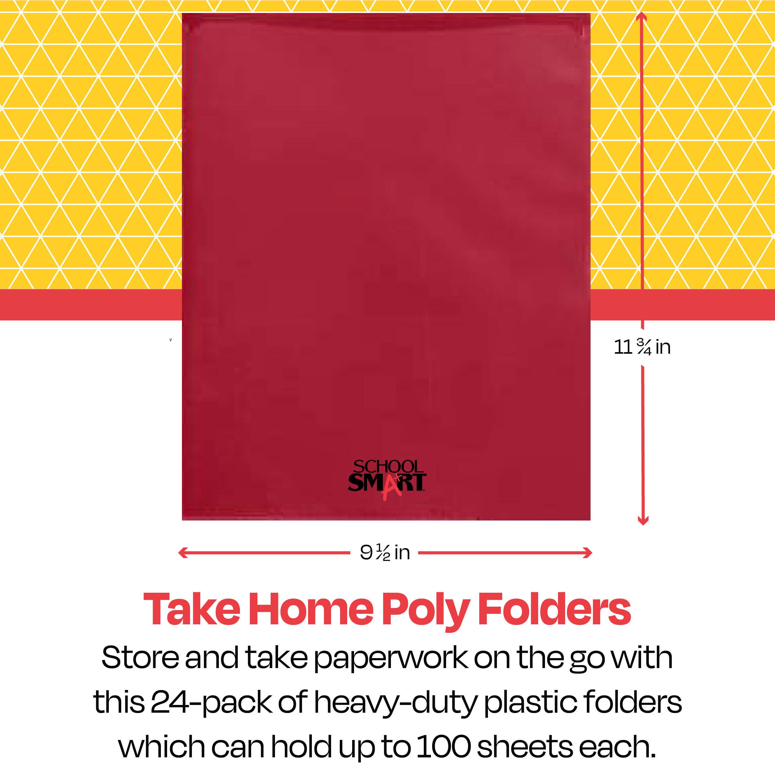 Description School Smart red take home folders provide maximum protection and a fun, sleek appearance. The construction is made of durable grained polypropylene with an embossed, clear border for viewing and placing your most important documents or notecards. Our 2-pocket folders with clear border slips include a left pocket with business card holder slot and "Return to School" bilingual text indications. Each plastic take home folder for students holds up to 100 sheets of paper.Features These heavy-duty folders are a smart choice for homework, bill keeping, office projects, sheet music, and more High-quality construction is easy to wipe down and sanitize without any damage or crinkling of the exterior or interior Tear-resistant materials also help deter dirt and humidity to keep your folders looking new A timeless style is suitable for both students, teachers, and professionals The interior business card slot keeps smaller items in a safe place without getting bent or ruined Includes: 24 Heavy-Duty Folders, Red