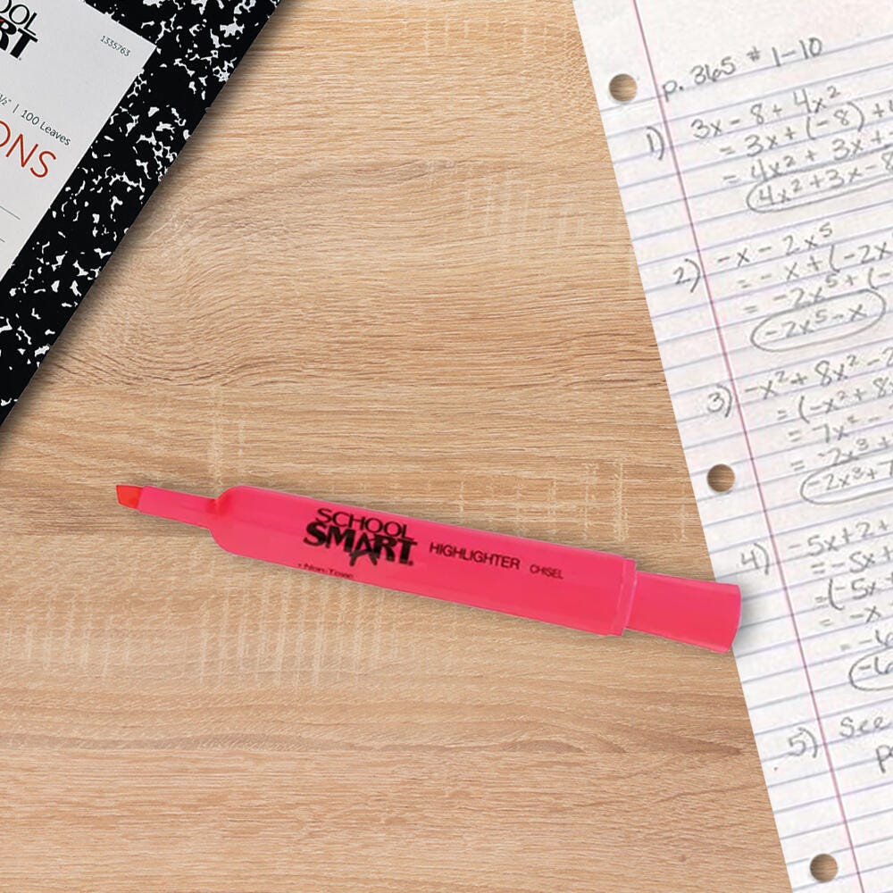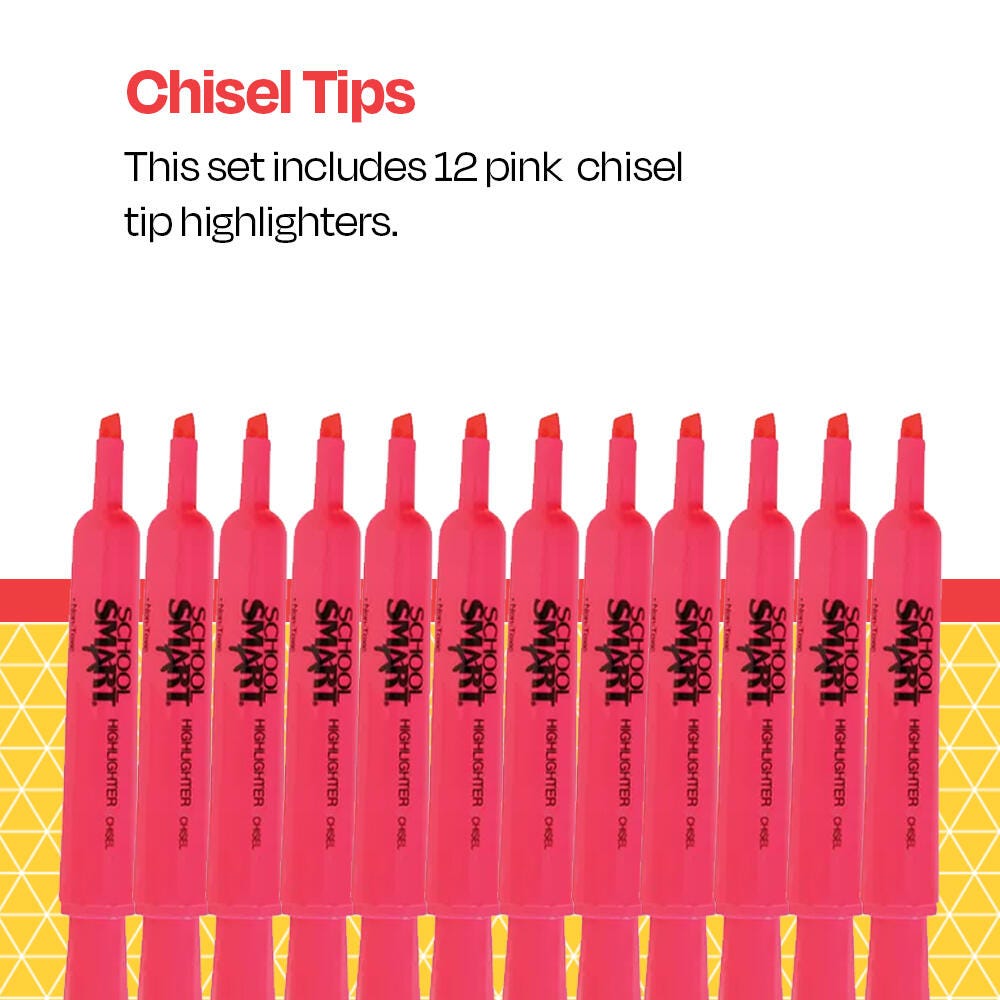 Description Mark up your notes in style with School Smart neon pink highlighters. Our tank highlighters are comfortable to hold and have a broad line tip for more highlighting options. Students, teachers, and office professionals love the easy-to-hold large barrel. The chisel tip highlighters allow for wide or fine highlighting while the see-through ink is bright and noticeable.Features Versatile chisel tips offer wide or fine highlighting Thick tank body makes this the best highlighter for a firm grip and fatigue-free hand comfort See-through pink ink is bold and bright while still allowing you to view media underneath Vivid color stands out immediately on paper and instantly dry to the touch Highlighting markers are a great study tool for elementary, middle, high school, and college students Multipack is economically priced to fit classroom budgets School Smart non-toxic writing utensils conform to ASTMD-4236 standards for art supplies