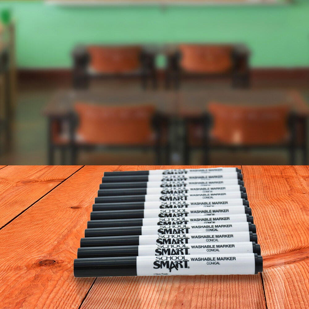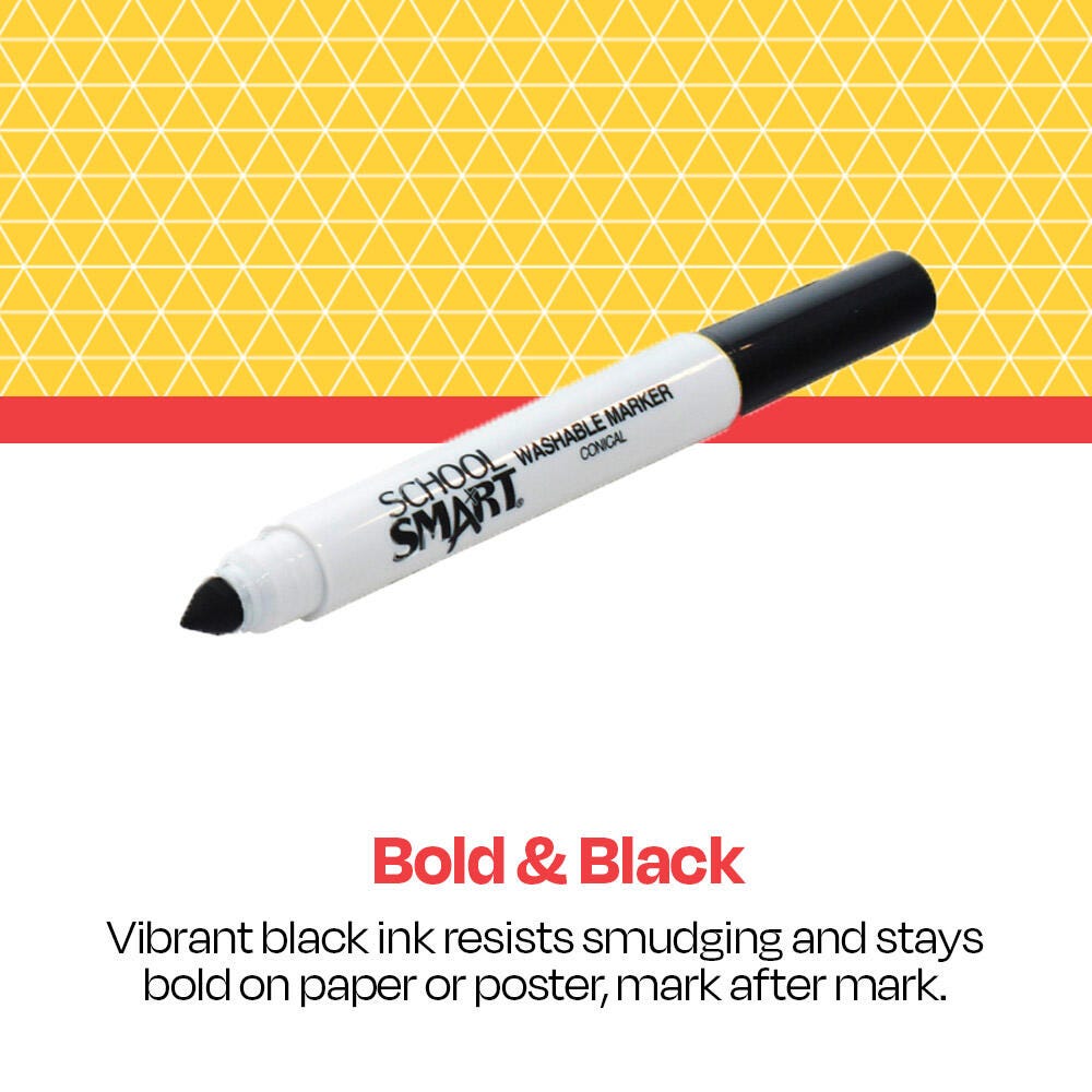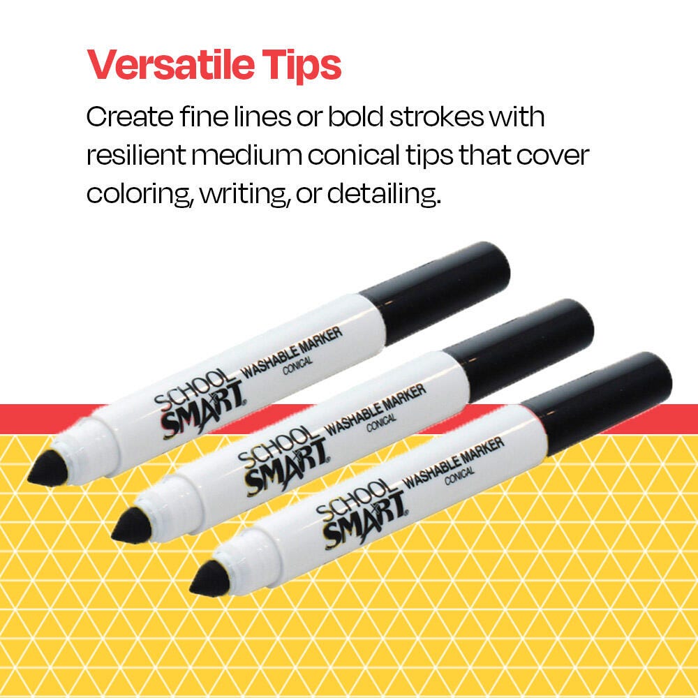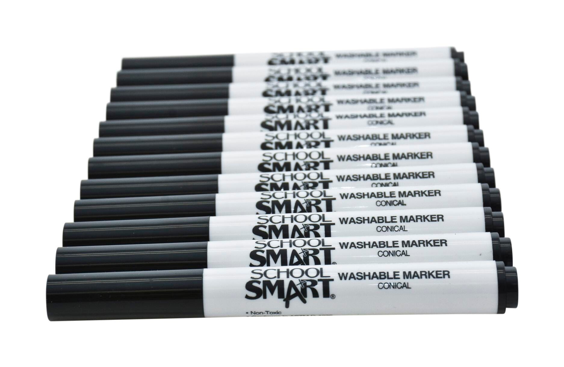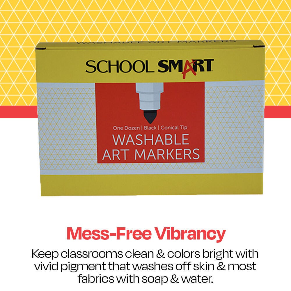 School Smart Art Markers take art to an effortless level with a vivid black color and durable conical shaped nibs. They are designed for making smudge-resistant medium lines, broad strokes, or allover thorough coverage. These markers glide smoothly across any type of paper with tips that hold up to daily use without wearing down. Great for young classrooms, these washable markers feature a formula that comes off hands and most fabrics with soapy water. Non-toxic.