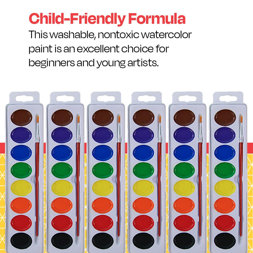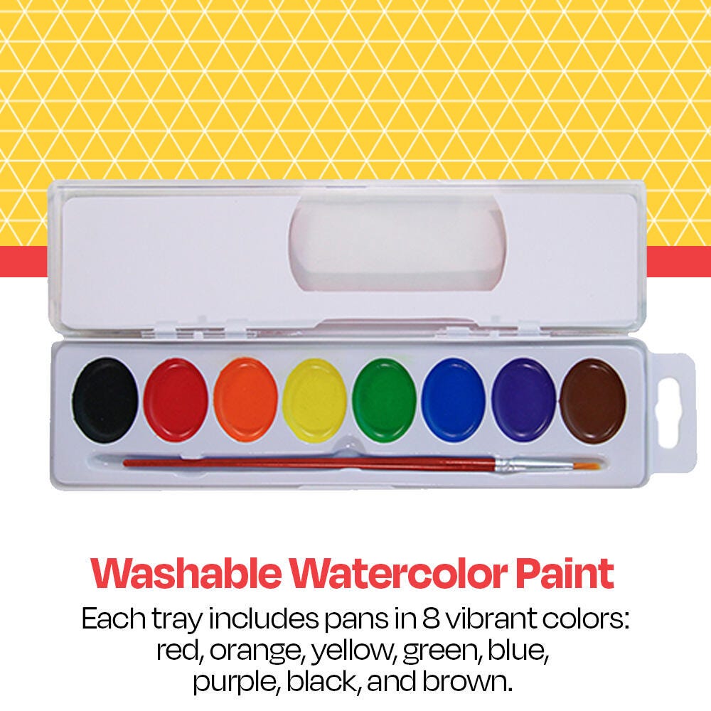 This classroom pack from School Smart delivers high-quality watercolor paints for the entire class to express their creativity! This watercolor paint is an excellent choice for beginners or young artists, as the paint washes easily from skin and most fabrics. The semi-moist paint offers smooth application from brush to paper or canvas when water is added. Each set includes a brush, a hard plastic case for easy storage, and non-toxic paint in red, yellow, orange, green, blue, purple, brown, and black. The paint may pop out of the pans in transit. Simply pop them back in, re-wet, and paint away. This class pack contains 36 watercolor paint sets.