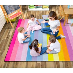 This pastel rainbow classroom rug design is created to add a pop of color to your space while still being a soothing solution to your reading corner, playroom, preschool, classroom, or childcare center. Perfect for spaces that need a place for children to relax no matter their age, this floor covering is designed to be durable for high-traffic areas yet soft to stand up to the highest quality seating carpets out there. For a colorful accent to your educational space, look no further than Schoolgirl Style. This rectangular carpet is available in several sizes. Please select the size that best fits your space when placing your order.Features