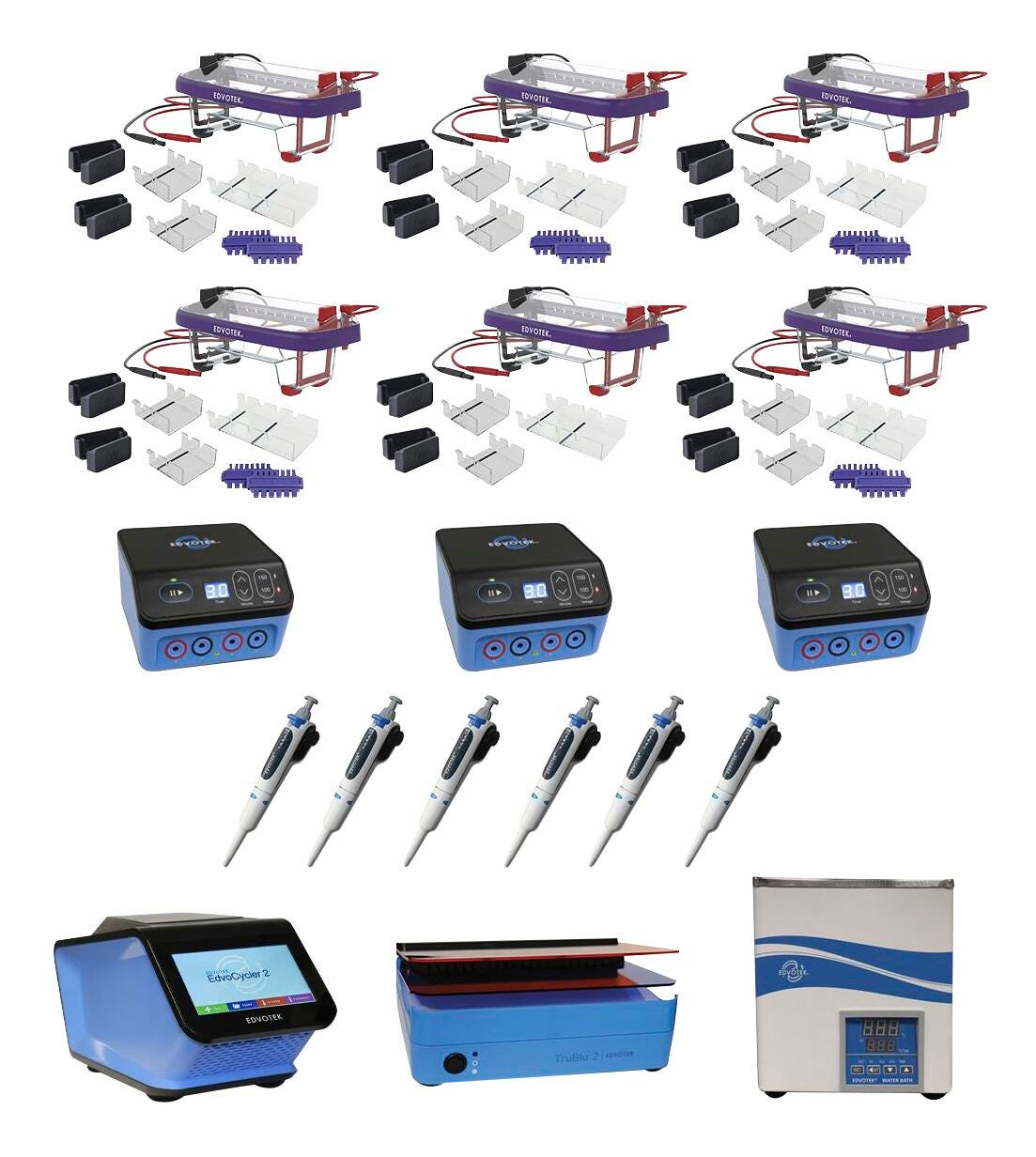 The Classroom PCR LabStation for 25 students contains 6 M12 electrophoresis apparatus tray sized 7 cm x 14 cm (1) and 7 x 7 cm (22), 3 DuoSource 70/150 V power supplies used for 1 or 2 units, 6 variable micropipettes of 5 - 50 micro liter capacity, 1 Edvocycler 2 sized 48 mL x 0.2 mL, 1 TruBlu 2 Blue/White Light transilluminator with 27 x 15 cm filter and a 3 liter water bath.