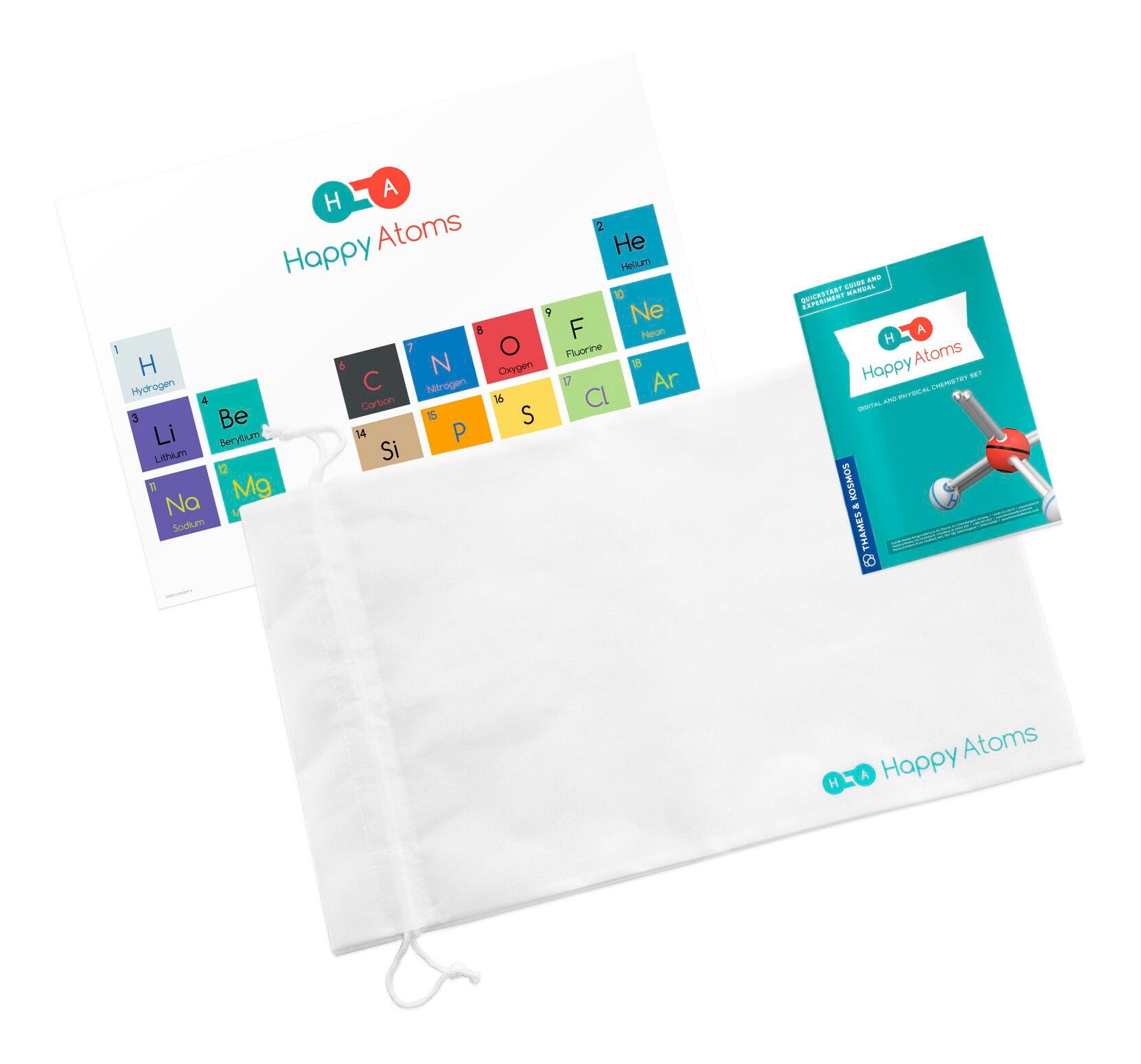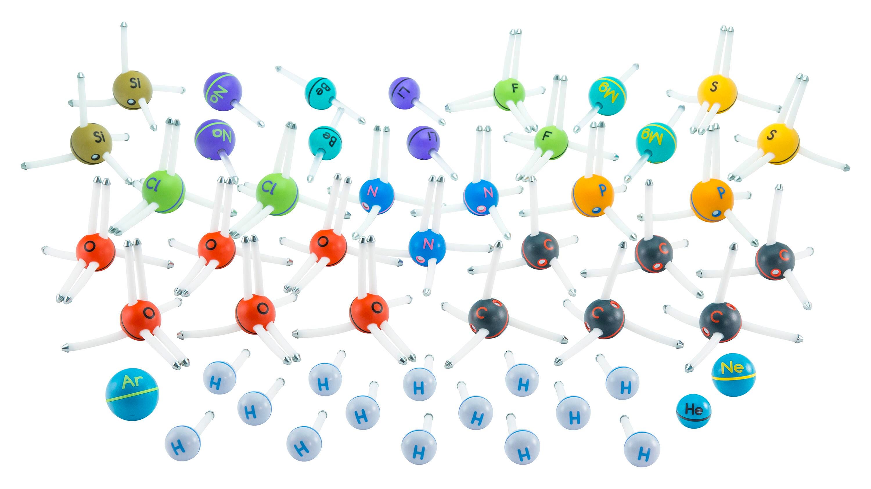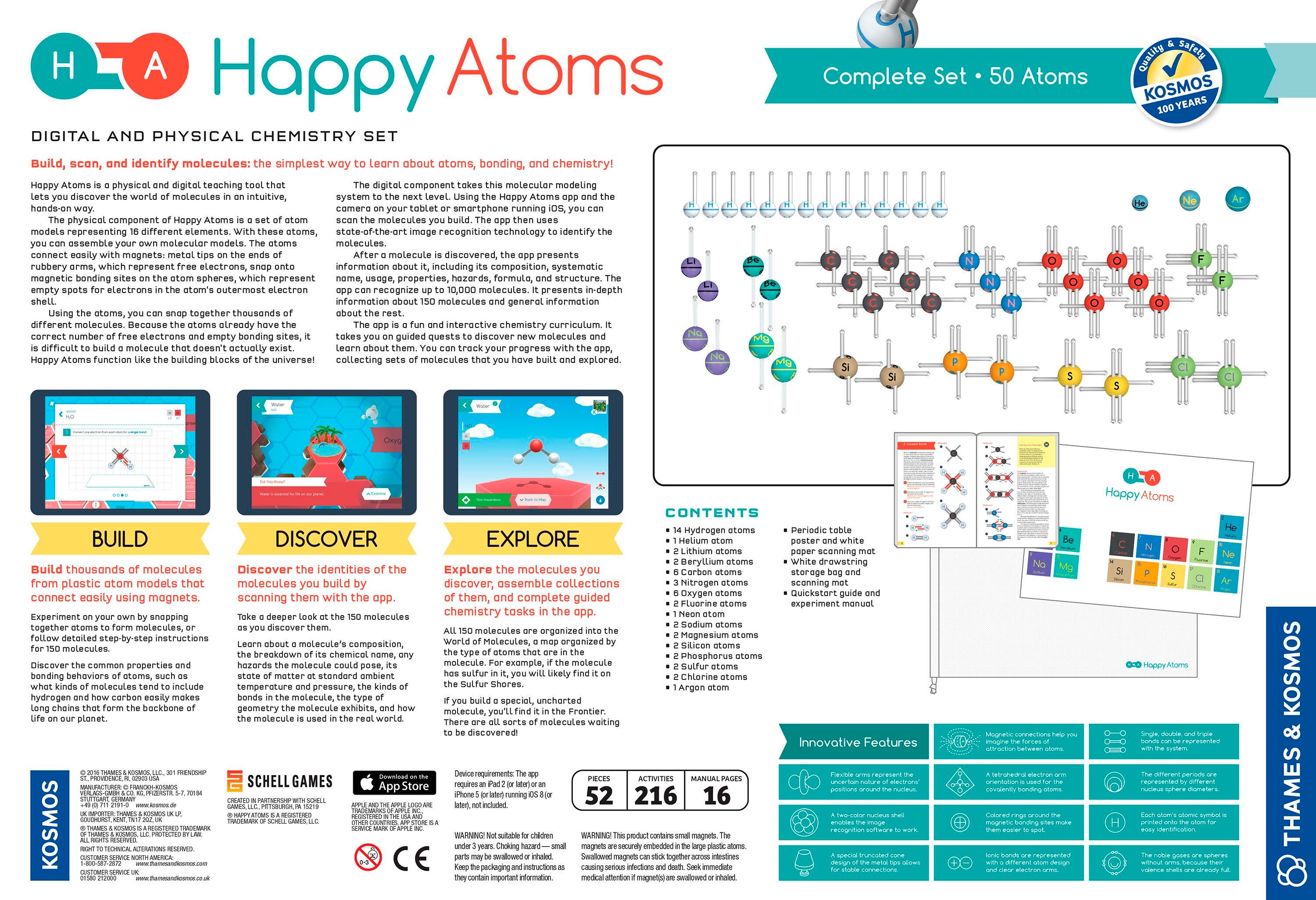 Description With this revolutionary approach to teaching chemistry, you can make your own happy atoms! This physical and digital kit lets you discover the world of molecules. Using a set of 50 atom models representing 16 different elements, you can assemble your own molecular models. The atoms stick together easily with magnets: metal tips on the ends of rubbery arms, which represent free electrons, snap onto magnetic bonding sites on the atom spheres, which represent empty spots for electrons in the atom’s outermost electron shell. Snap its picture and the included app uses state-of-the-art image recognition technology to identify the molecule. The app recognizes tens of thousands of molecules and presents detailed information about 150 of the most important molecules. You can track your progress with the app, collecting sets of molecules that you have built and explored. Requires a tablet or smartphone running iOS 8 (or later) or Android 4.4 (or later, with 1 GB RAM, dual-core processor, and built-in camera).