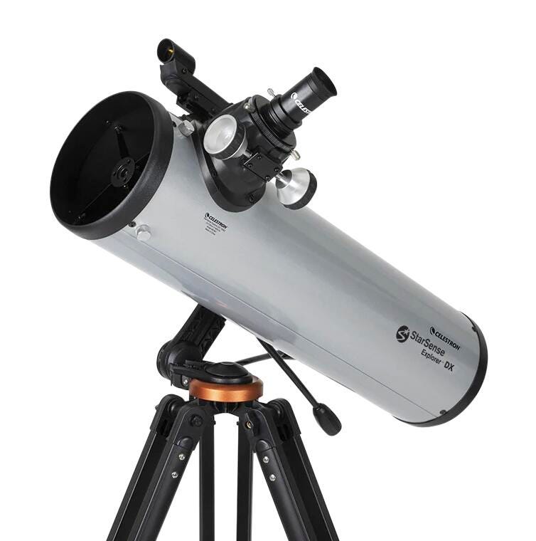 Description Celestron has reinvented the manual telescope with the StarSense Explorer, the first telescope that uses your smartphone to analyze the night sky and calculate its position in real time. StarSense Explorer is ideal for beginners thanks to the app’s user friendly interface and detailed tutorials. The StarSense Explorer app automatically generates a list of objects currently visible. View planets, brighter nebulae and galaxies, star clusters, and double stars from the city or take your telescope to darker skies to view faint, deep sky objects.Features For use with the StarSense app on your Android or iPhone Appropriate for novice and experienced star gazers Features 307x magnification Includes: 1 Celestron StarSense Explorer Newtonian Reflector Telescope and accessories