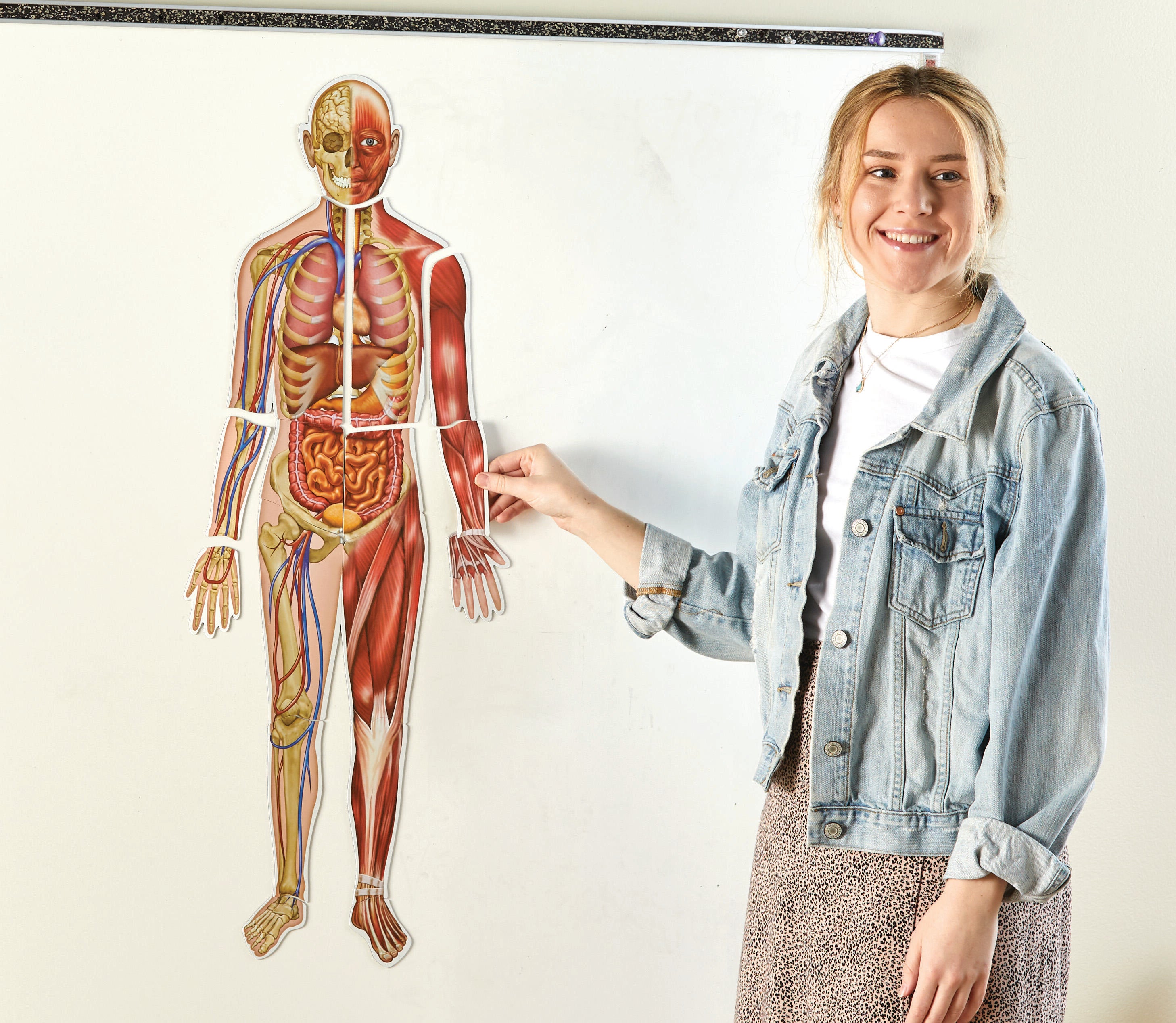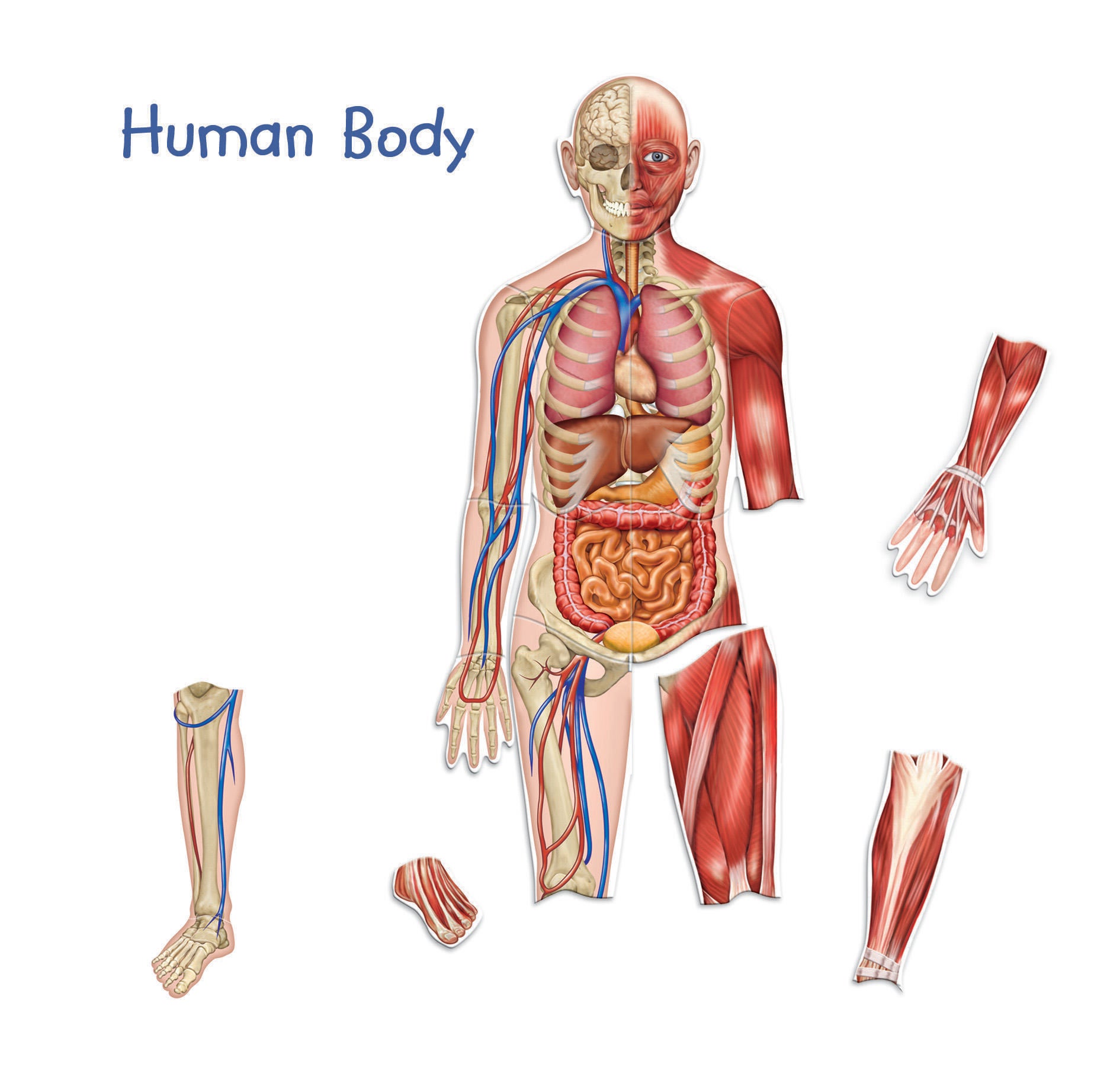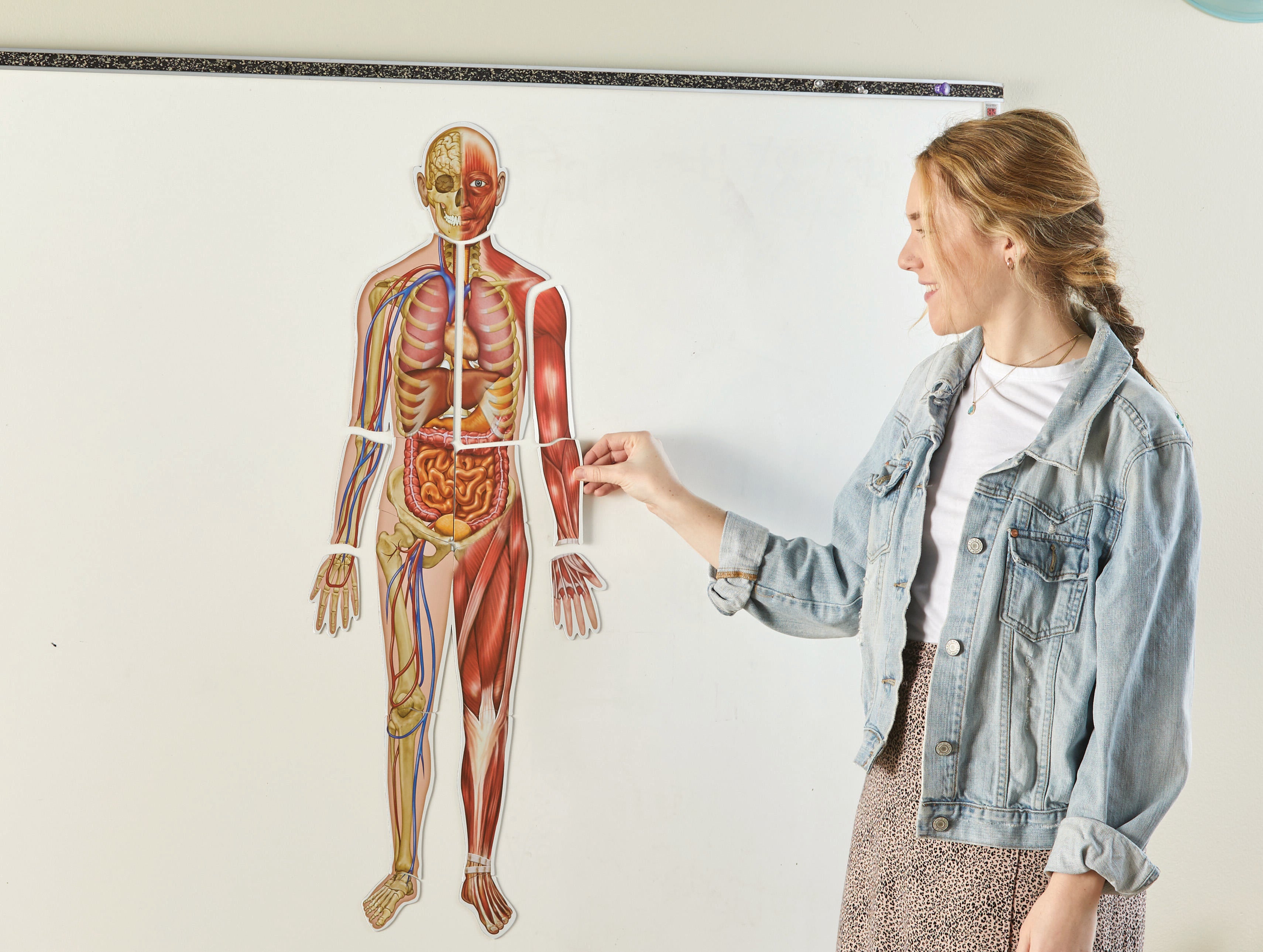 Learning Resources Magnetic Human Body features double-sided magnetic pieces and is designed for grades pre-K and above. Side A shows the skeletal system, and side B shows major organs and other key body concepts. Perfect for teaching both separately, or for explaining how both interact with eachother. When fully assembled, this magnetic 2D model measures just over 3 H feet.