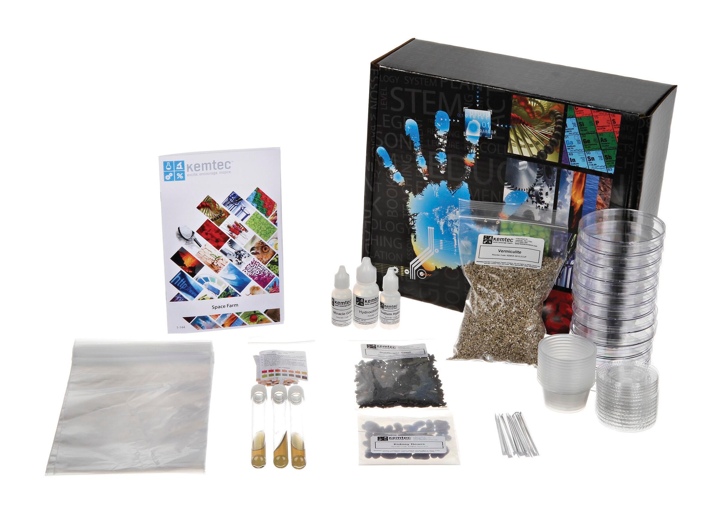 Description Kemtec Space Farm Kit is designed to illustrate how we might grow our food in an environment other than earth, the experiments allows young scientist to produce germinating tissue in an artificial soil. After the initial germination occurs, the student may then transfer the sprouted materials to the real world environment.Features Sold as an Each Shows students how we might grow our food in an environment other than earth Optimal tool for inspiration and education in classrooms Perfect for large or small groups of students An ideal complement to any science classroom