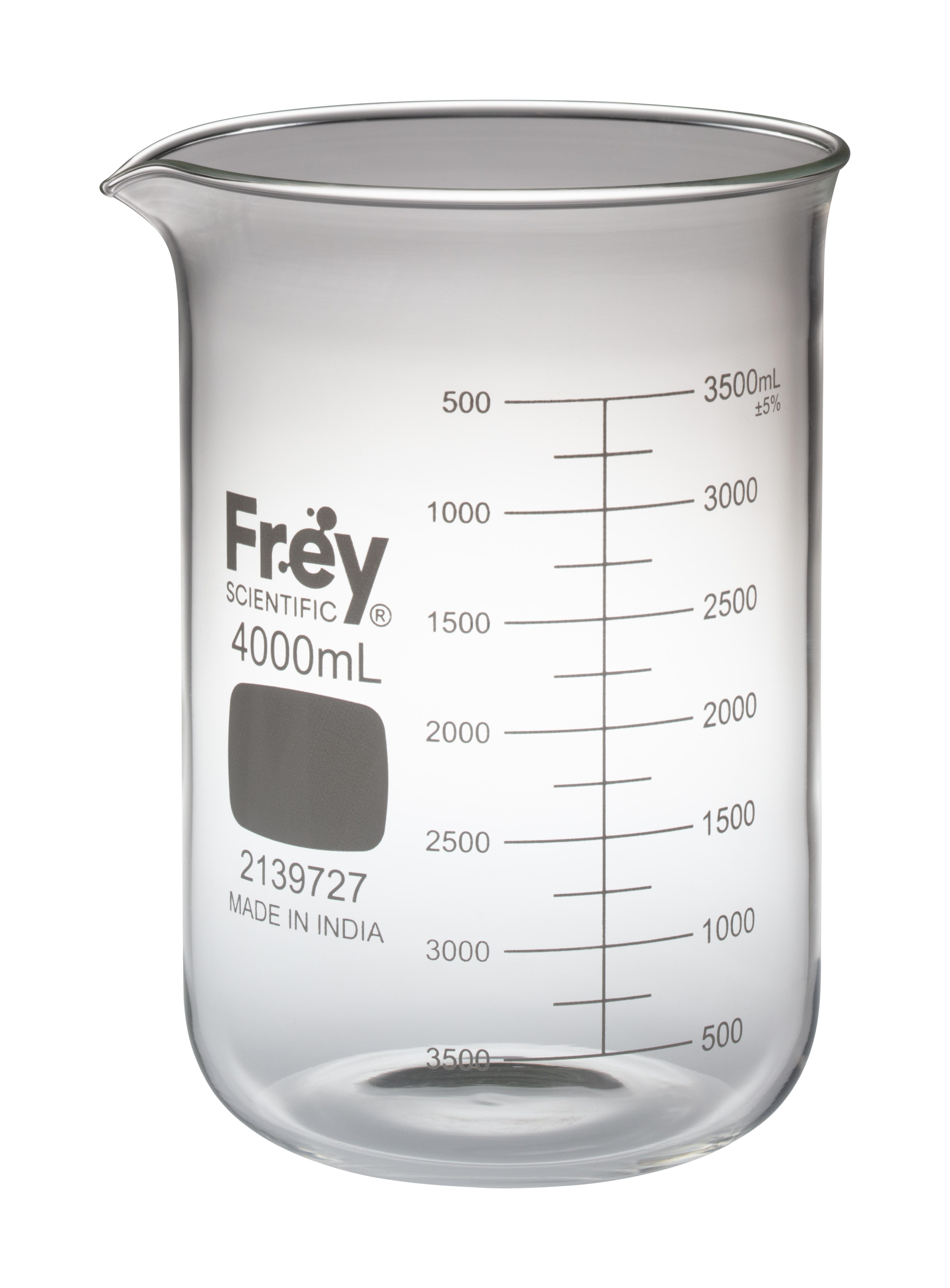 Frey Scientific delivers high-quality glass labware for experiments and research in classrooms and labs. Beakers are excellent for measuring, pouring, and holding liquids. This beaker features heavy and uniform wall thickness, a spout for pouring, and a beaded rim. It has a capacity of 4000 mL with 500 mL graduations.