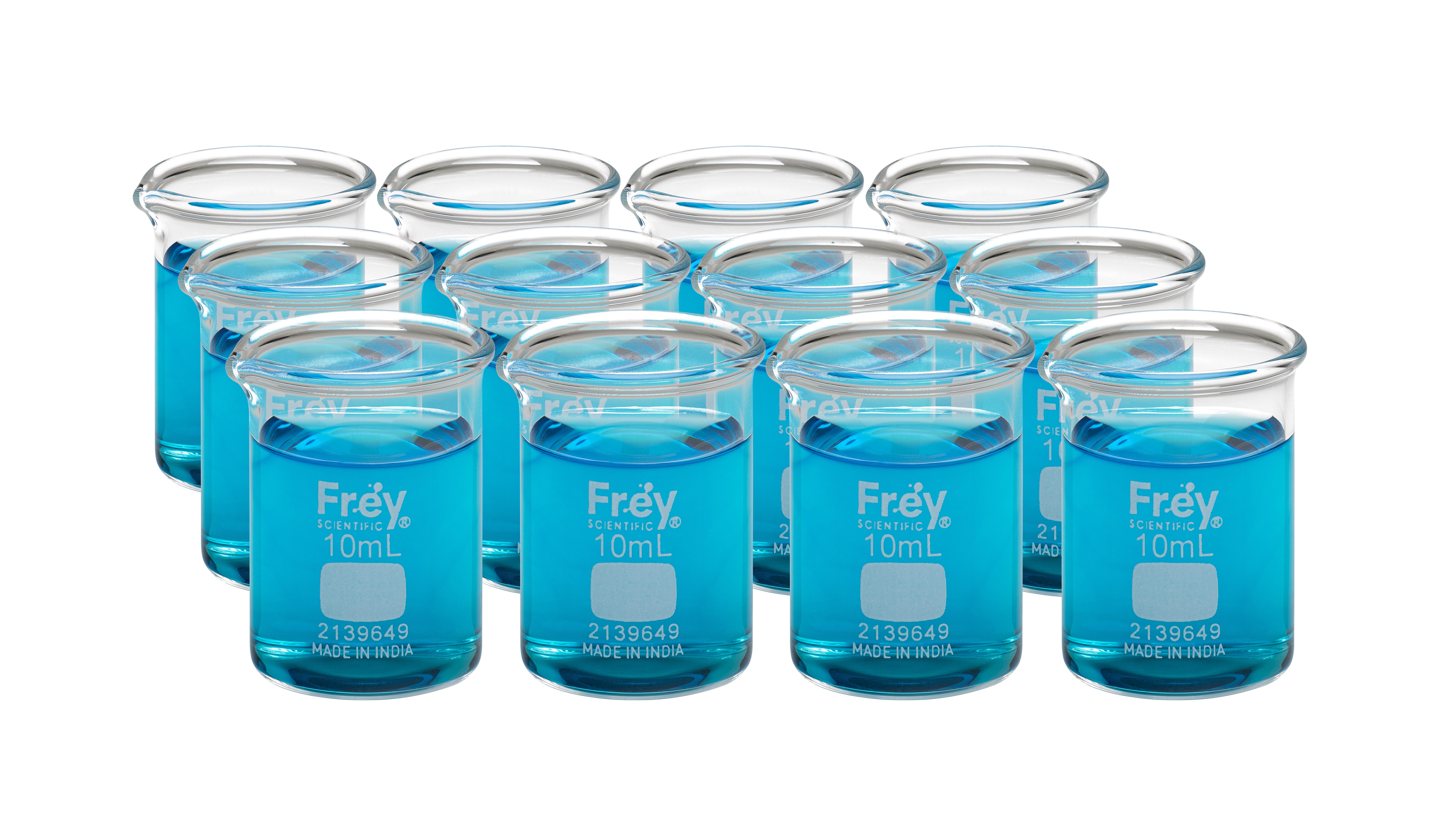 Frey Scientific delivers high-quality glass labware for experiments and research in classrooms and labs. They are excellent for measuring, pouring, and holding liquids. These beakers feature heavy and uniform wall thickness, spouts for pouring, and beaded tops. Each beaker has a capacity of 10mL. This pack contains 12 beakers.