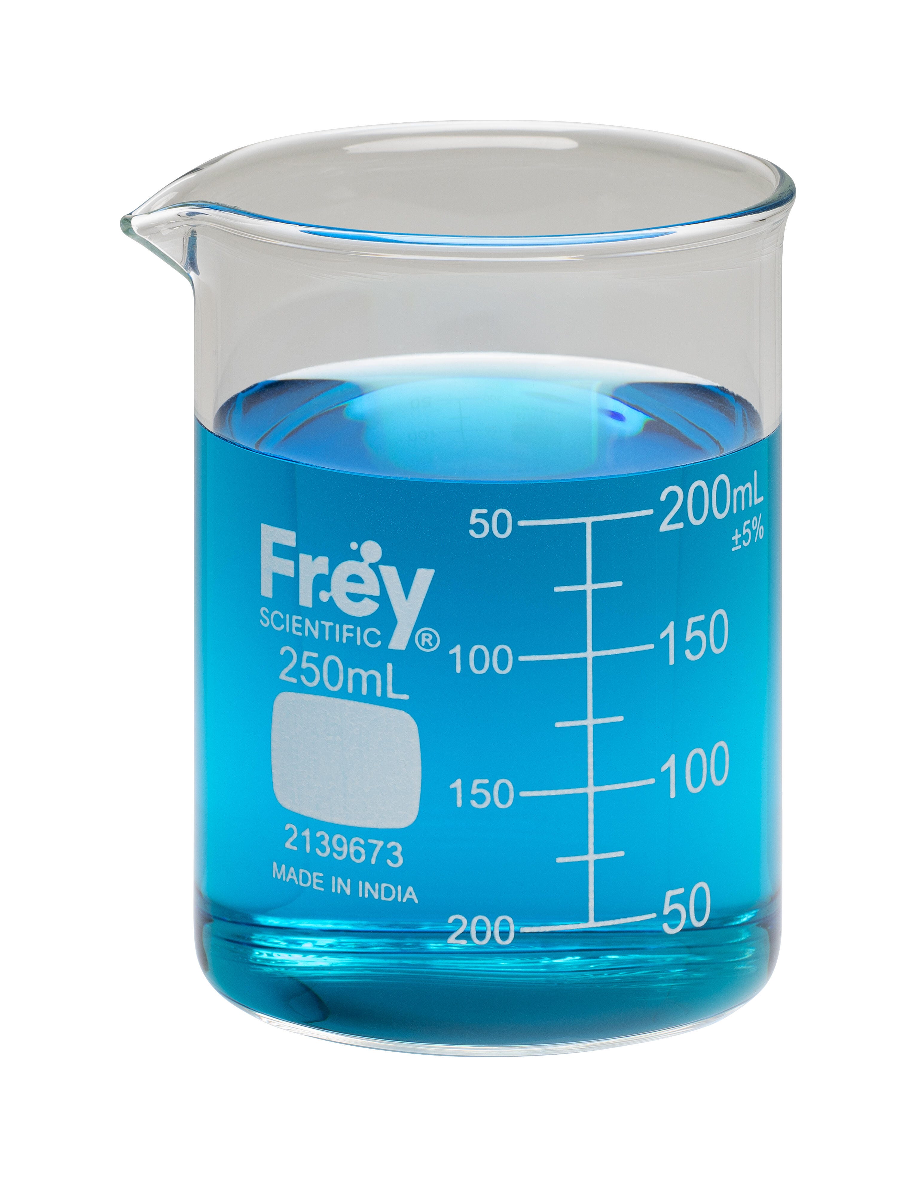 Frey Scientific delivers high-quality glass labware for experiments and research in classrooms and labs. These beakers are excellent for measuring, pouring, and holding liquids. Each beaker features a heavy and uniform wall thickness, a pouring spout, and a beaded rim. The beakers have a 250 mL capacity with 25 mL graduations. This pack contains 12 beakers.