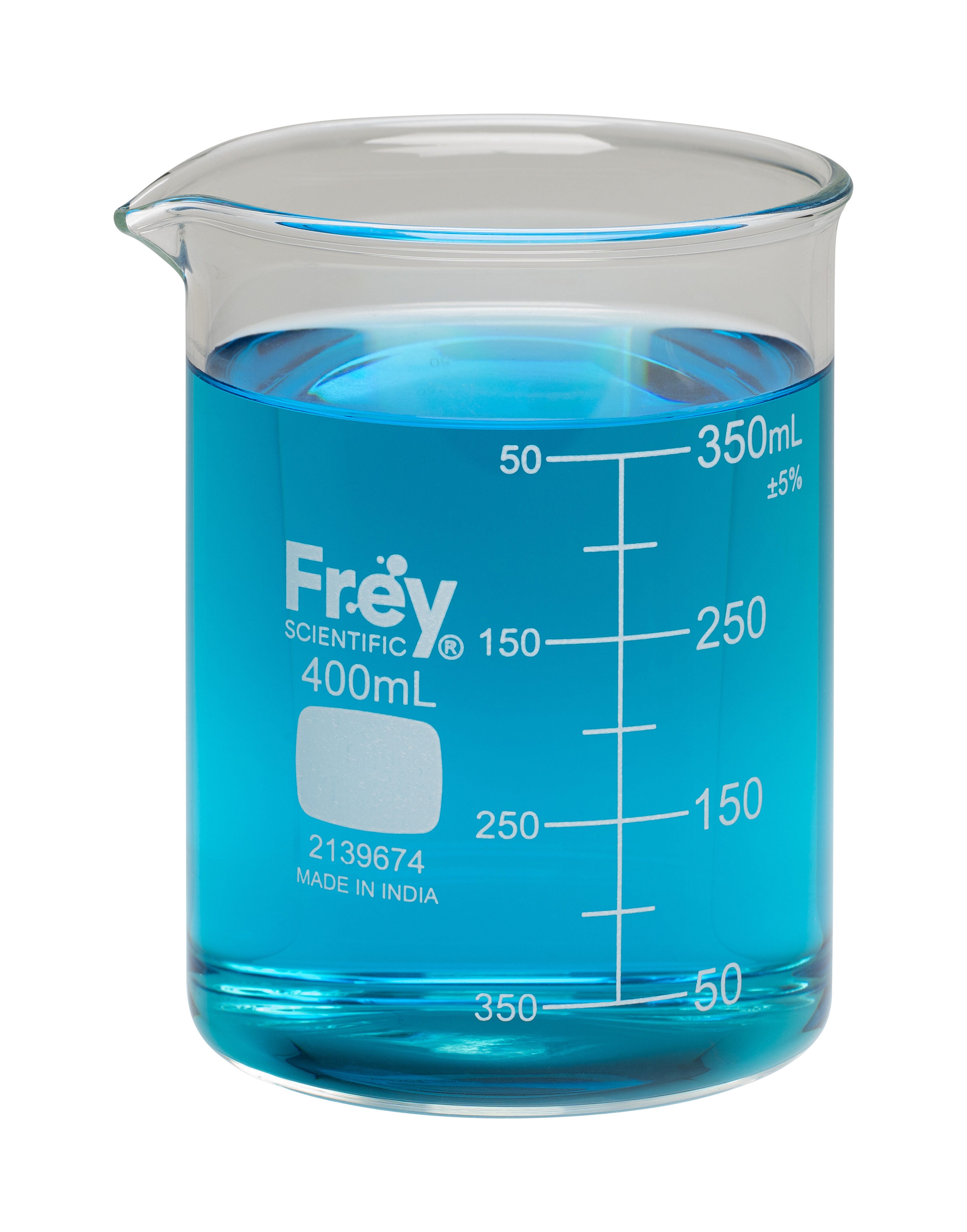 Frey Scientific delivers high-quality glass labware for experiments and research in classrooms and labs. These beakers are excellent for measuring, pouring, and holding liquids. They feature heavy and uniform wall thickness, spouts for pouring, and beaded rims. Each beaker has a capacity of 400 mL with graduations of 25 mL. This pack contains 12 beakers.