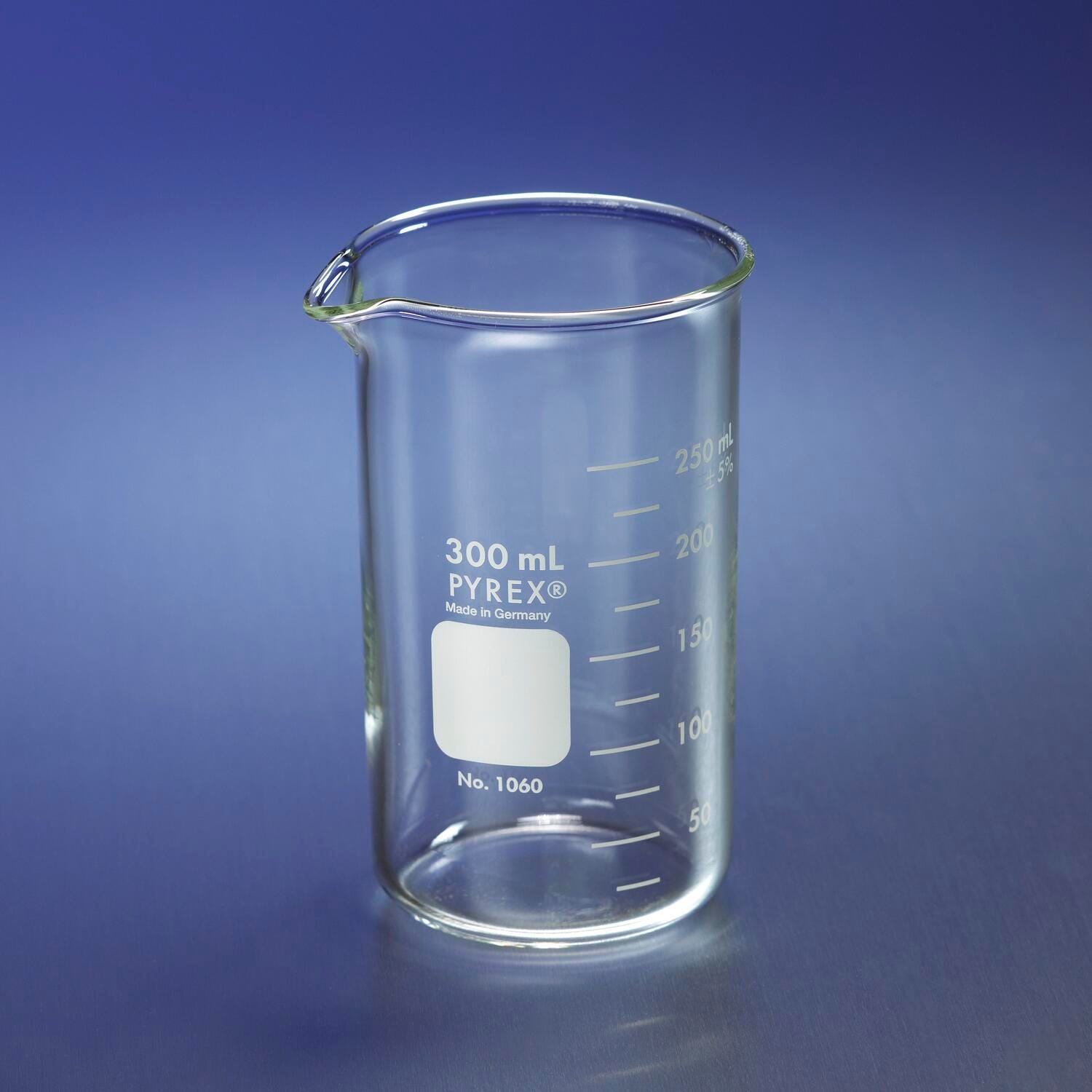 Pyrex Berzelius Tall Form Beaker with a capacity of 200 ml features spouts that offer easy pouring and graduated to indicate their approximate content. Beaker with thick reinforcing beads protect the slightly flared tops and sold as 12 per pack.