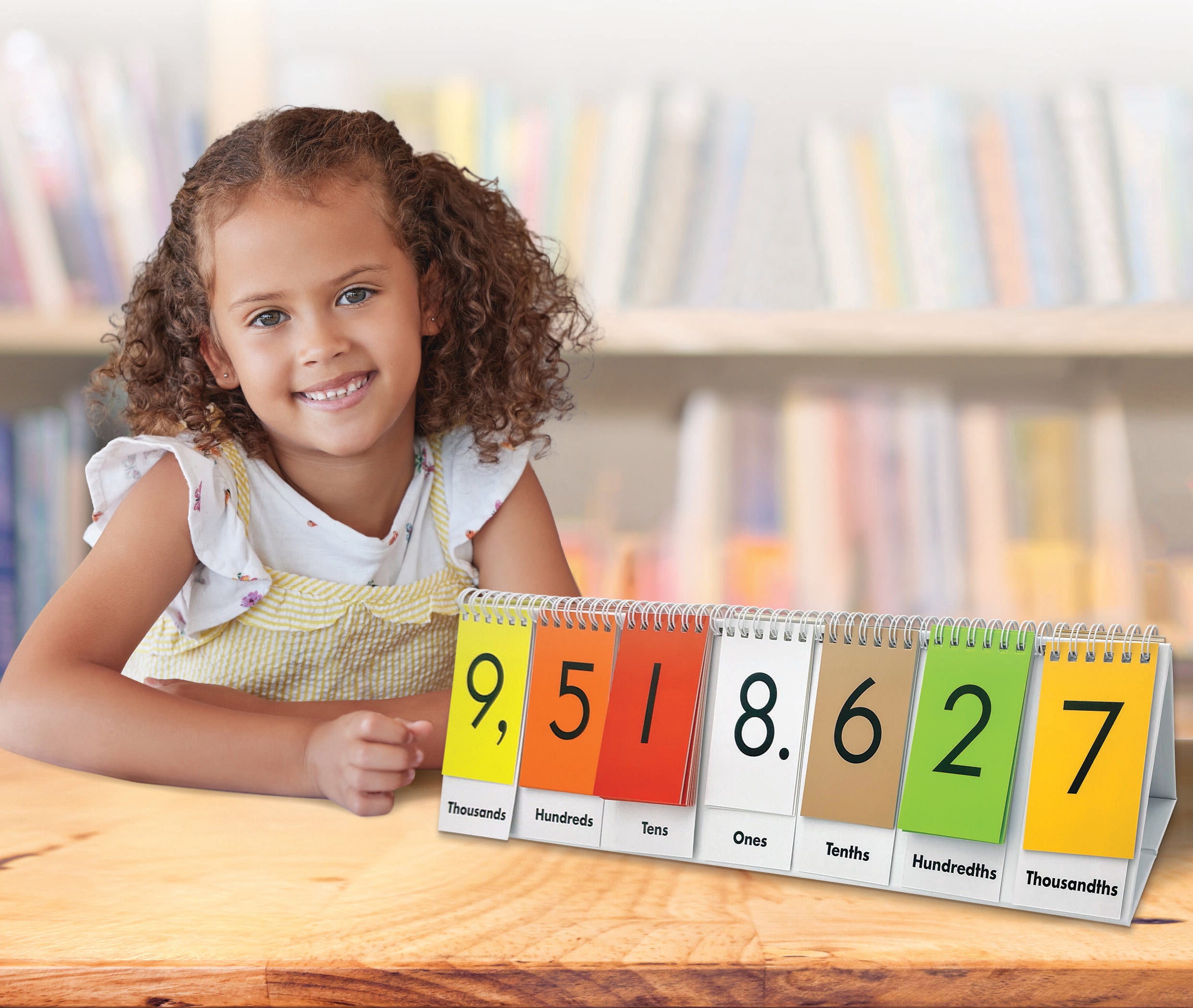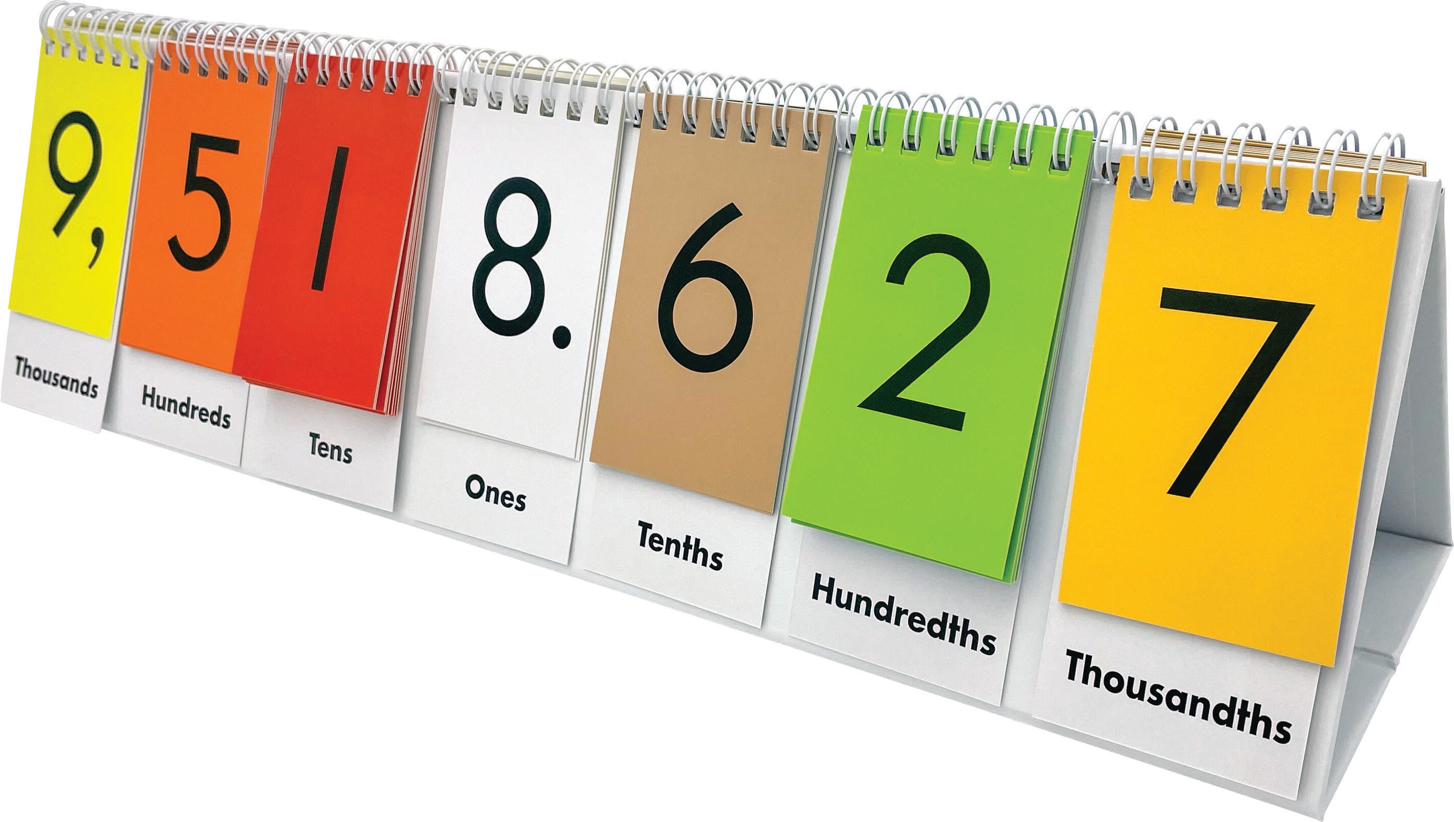 Description This handy Place Value Flip Stand helps young learners practice counting and place-value relationships from Thousandths to Millions! This two-sided flip stand offers engaging hands-on learning with whole numbers and decimals. The flip cards on both sides of the stand can be arranged in three different ways: column with the place value label only, column with the place value label and a number, or a blank column without a place value label or number. This allows educators to modify the flip stand to meet the needs of each child or learning objective. The stand measures 16-1/2 L x 4-1/8 W x 4-1/2 H inches and folds flat for easy storage!Features Colorful design with bold type is engaging and easy to read Spiral bound design makes each card easy to flip and ensures lasting performance Sturdy plastic cards stand up to regular handling Versatile chart can be used for a range of activities, age groups, and ability levels Excellent for individual or group instruction Includes