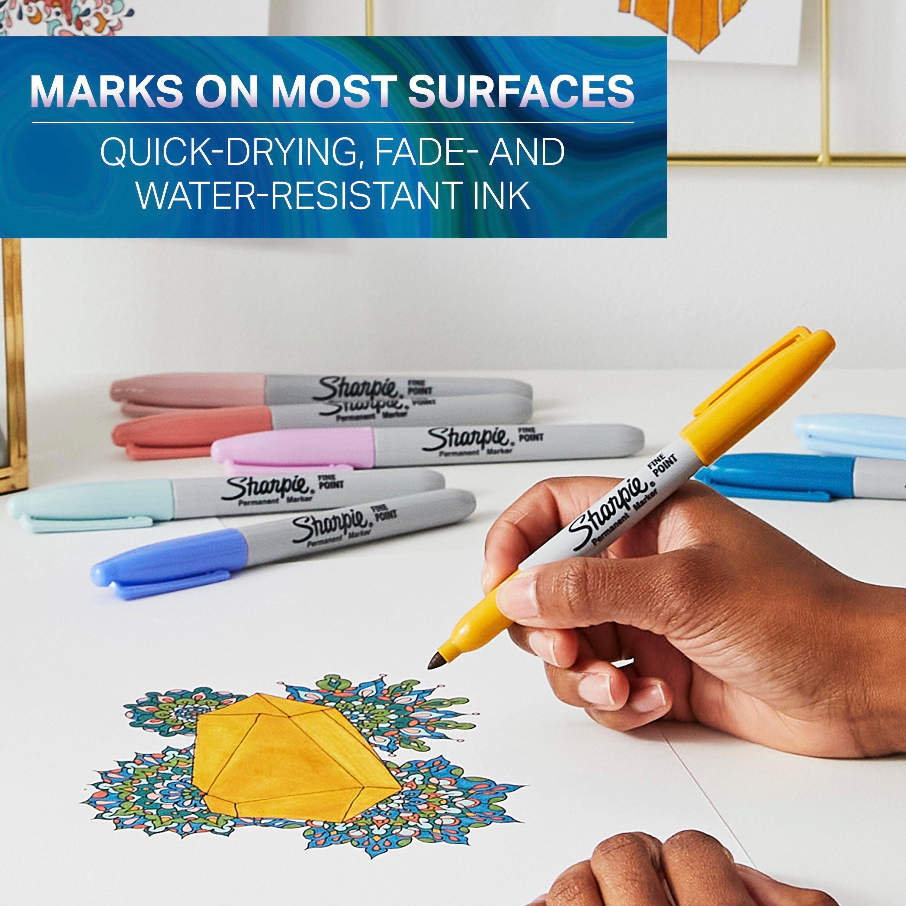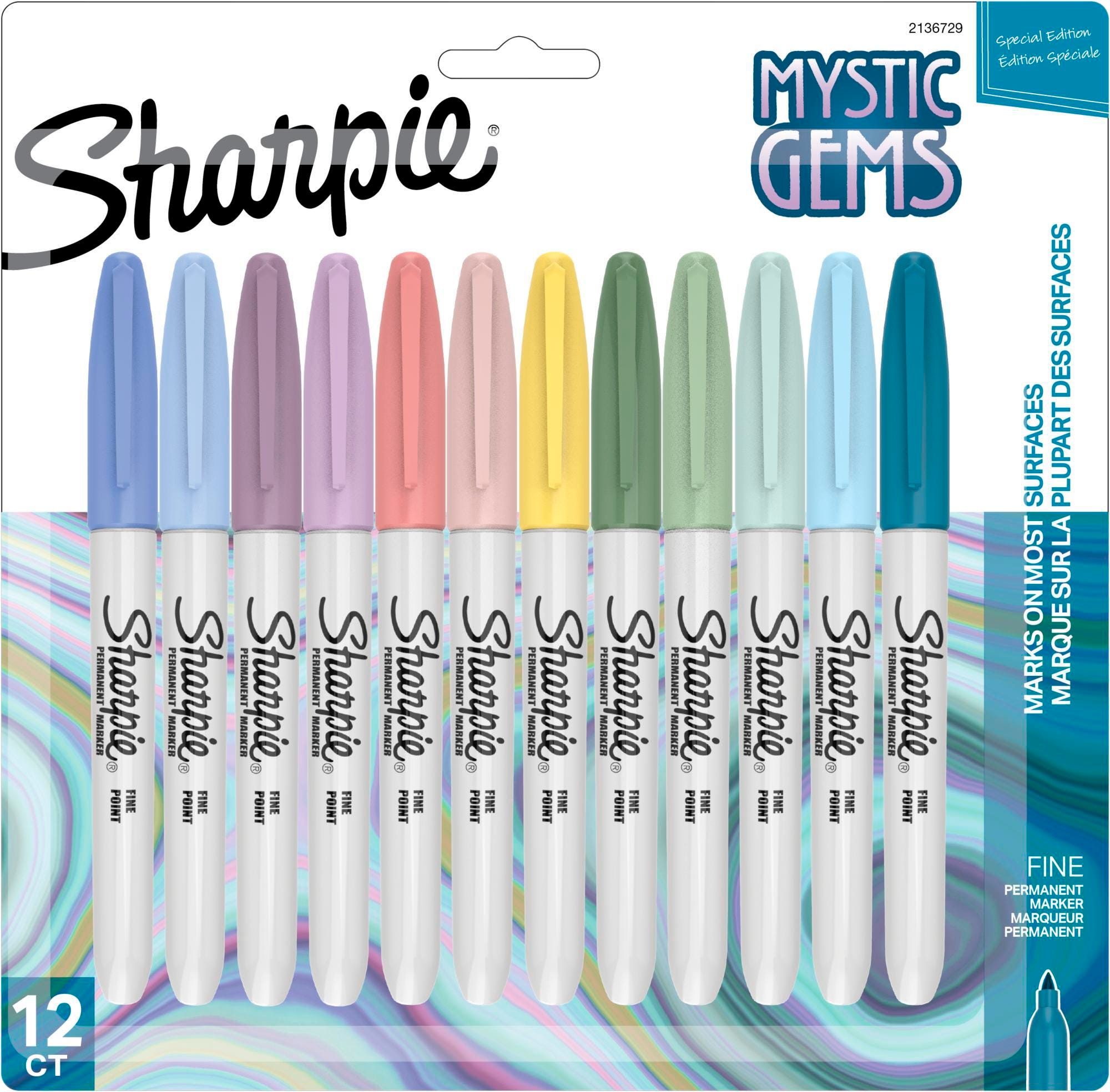 These Sharpie Permanent Markers are designed to mark almost anywhere so you can transform ordinary surfaces into colorful creative statements. Each Sharpie features a durable fine point that delivers the iconic quick-drying ink that resists both water and fading. This pack of 12 permanent markers includes Mystic Gem colors inspired by the vibrant energy of gemstones.