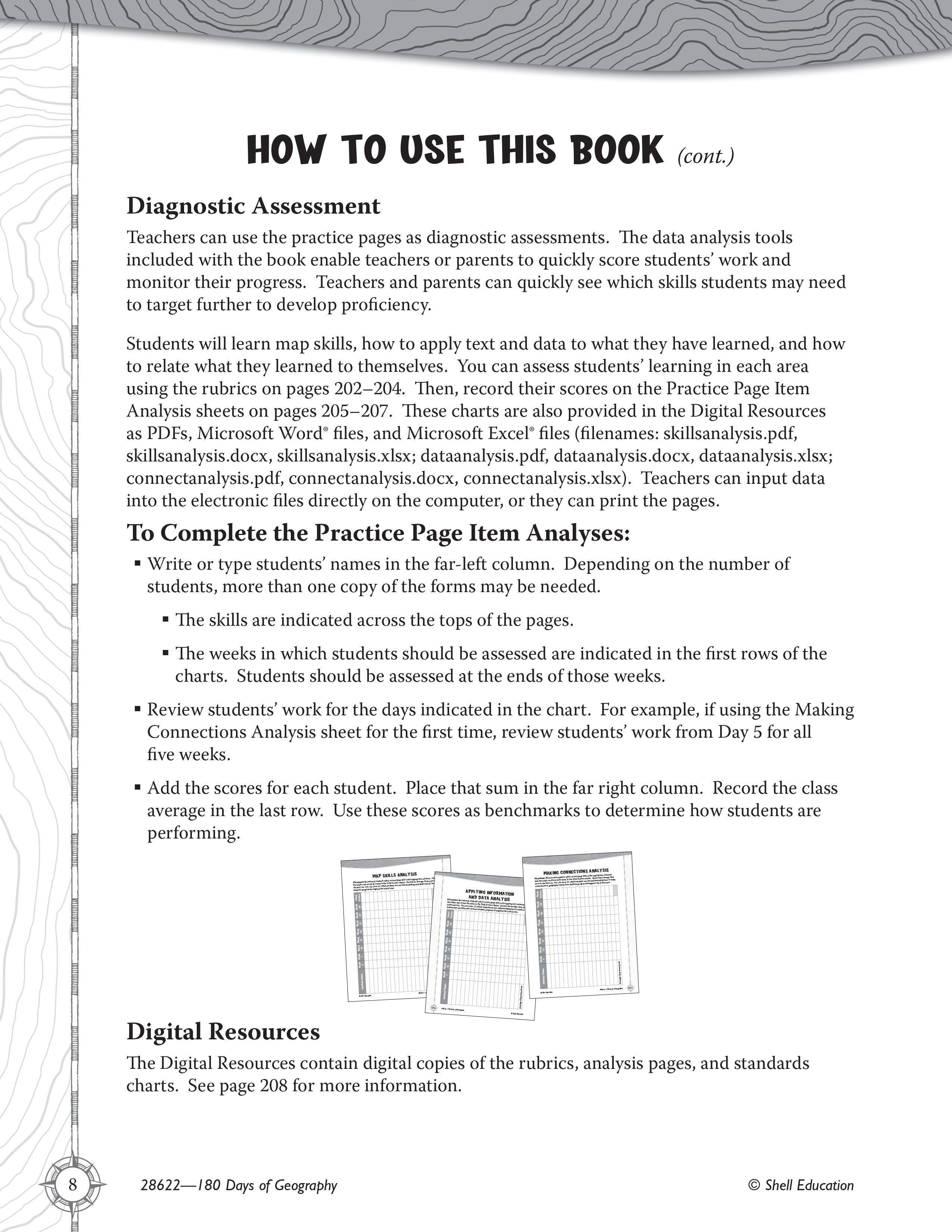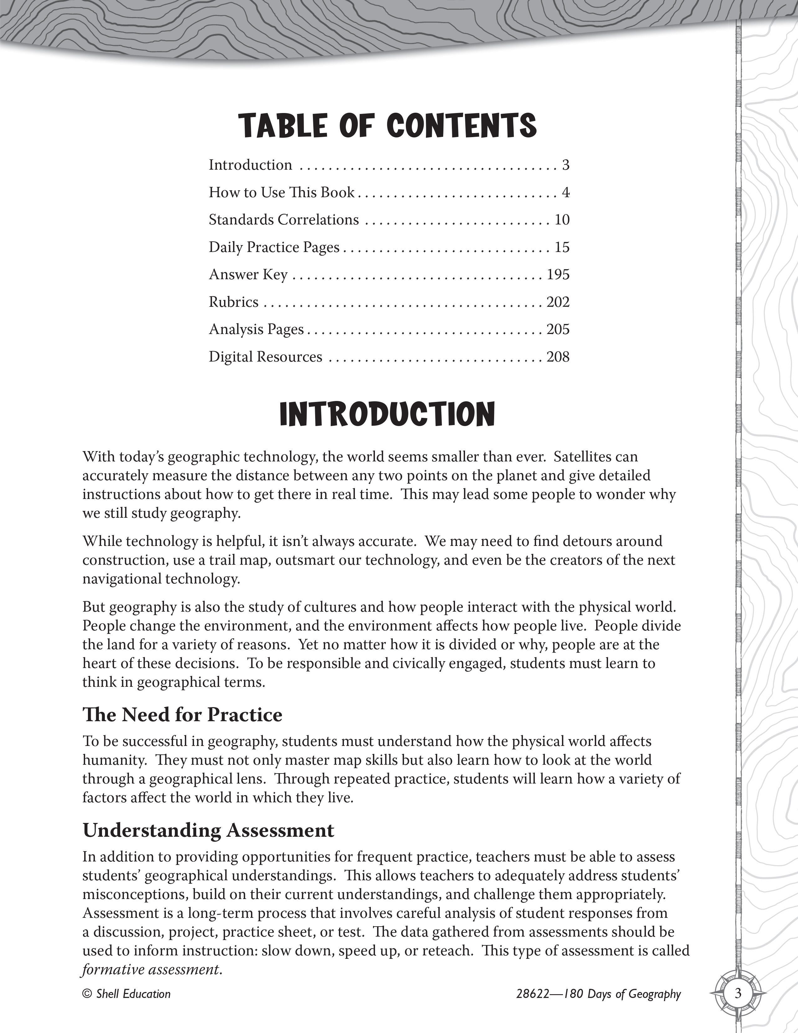 Through these weekly units in 180 Days of Geography, students will improve their geographic background knowledge, critical thinking and reasoning skills, map and spatial skills, and answer photo and text dependent questions. This essential social studies resource provides teachers with the tools they need to provide detailed instruction on map skills, key geographical concepts, and the five themes of geography: location, place, human environment/interaction, movement, and region. With the world becoming more connected, learning about different places through a geographic lens will equip 21st century students with the skills they need to better understand diverse cultures and regions in an increasingly interdependent world. An introductory two-week unit focuses on teaching the map skills that students will use throughout the rest of the book. Subsequent units will introduce students to a new place or a type of map, and will explore the relationship between geography and culture.