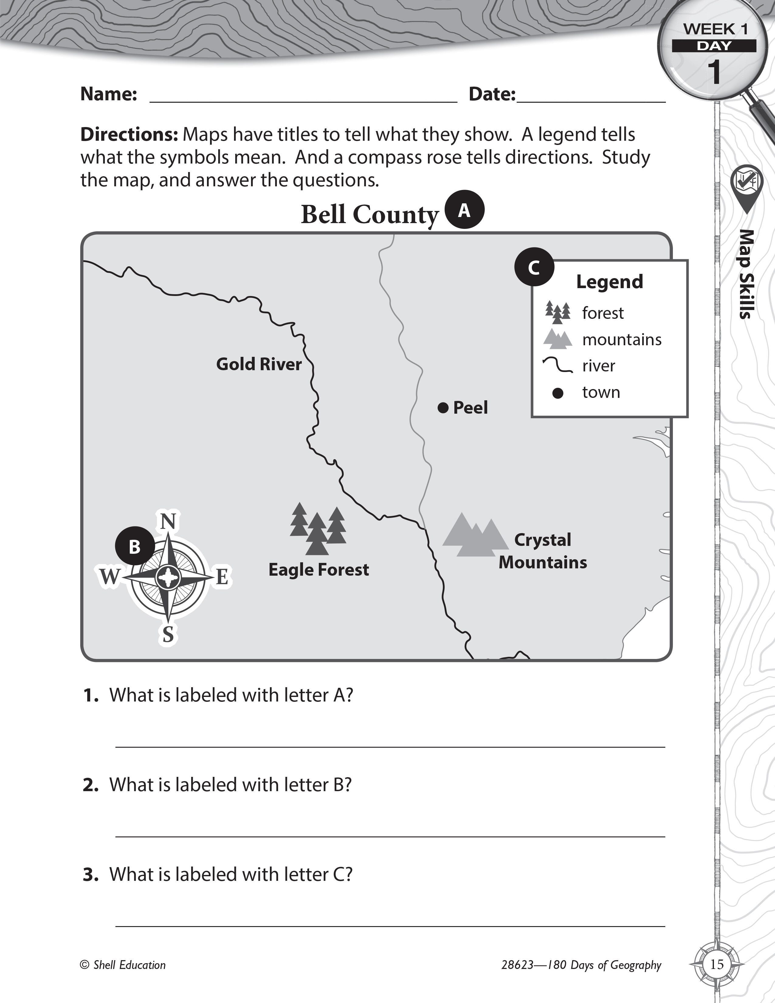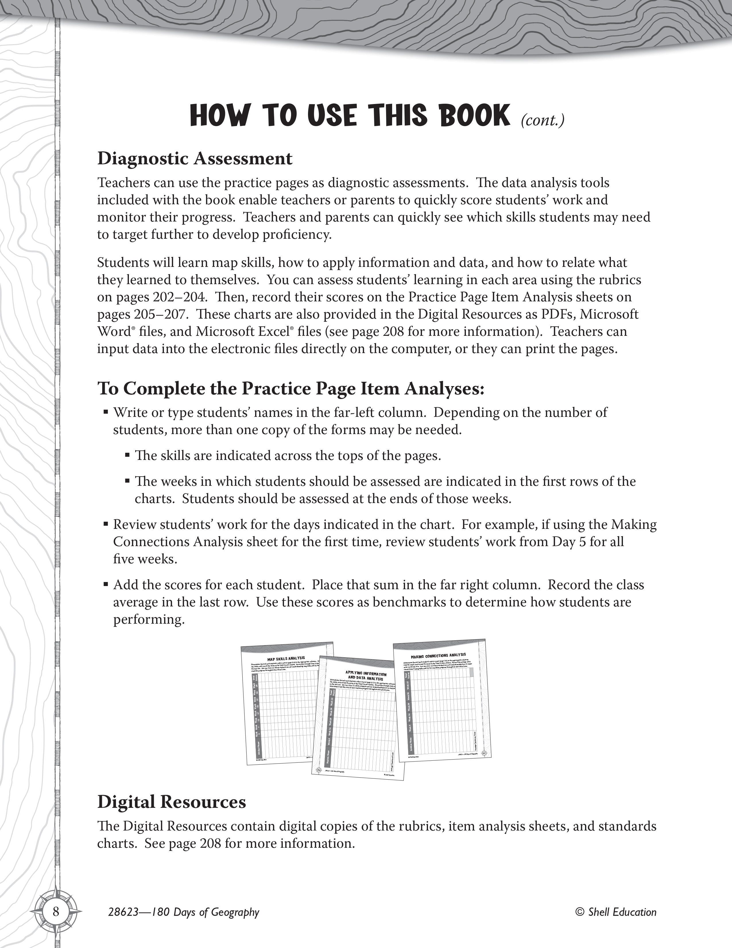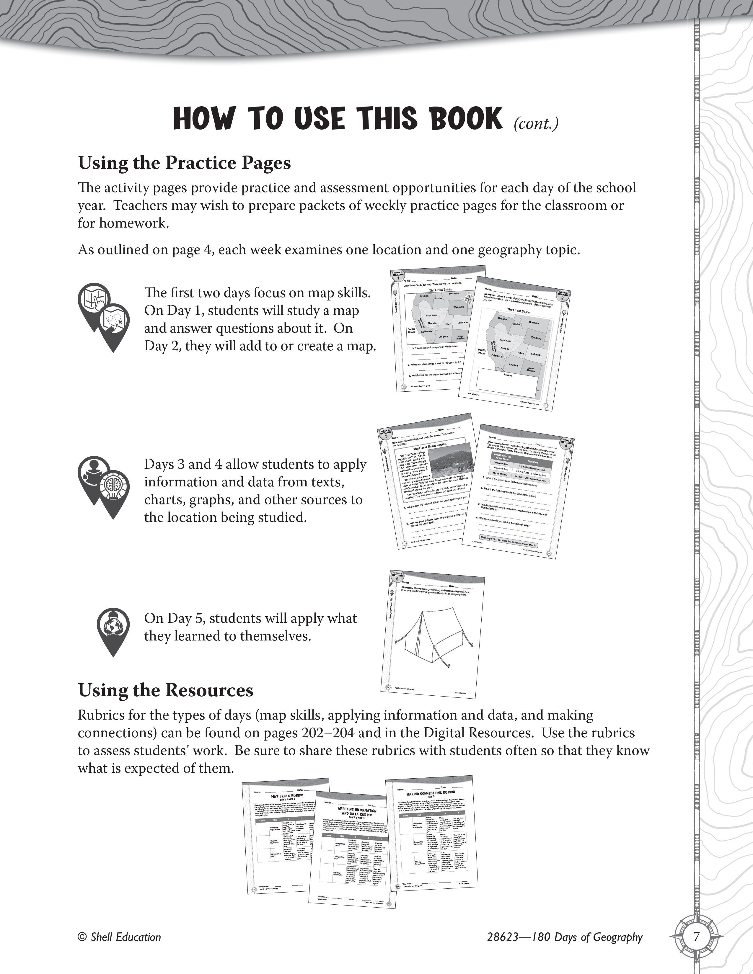 Through these weekly units in 180 Days of Geography, students will improve their geographic background knowledge, critical thinking and reasoning skills, map and spatial skills, and answer photo and text dependent questions. This essential social studies resource provides teachers with the tools they need to provide detailed instruction on map skills, key geographical concepts, and the five themes of geography: location, place, human environment/interaction, movement, and region. With the world becoming more connected, learning about different places through a geographic lens will equip 21st century students with the skills they need to better understand diverse cultures and regions in an increasingly interdependent world. An introductory two-week unit focuses on teaching the map skills that students will use throughout the rest of the book. Subsequent units will introduce students to a new place or a type of map, and will explore the relationship between geography and culture.