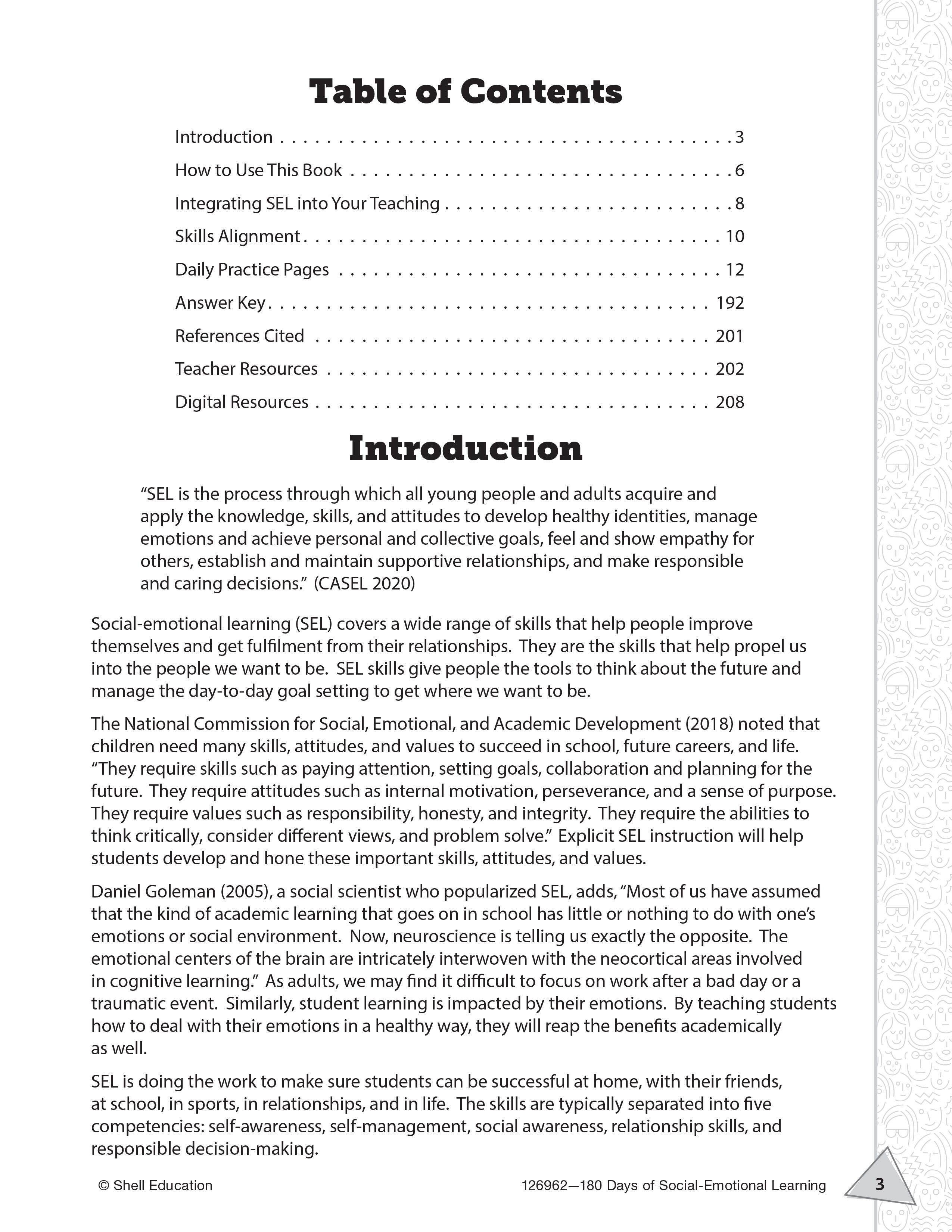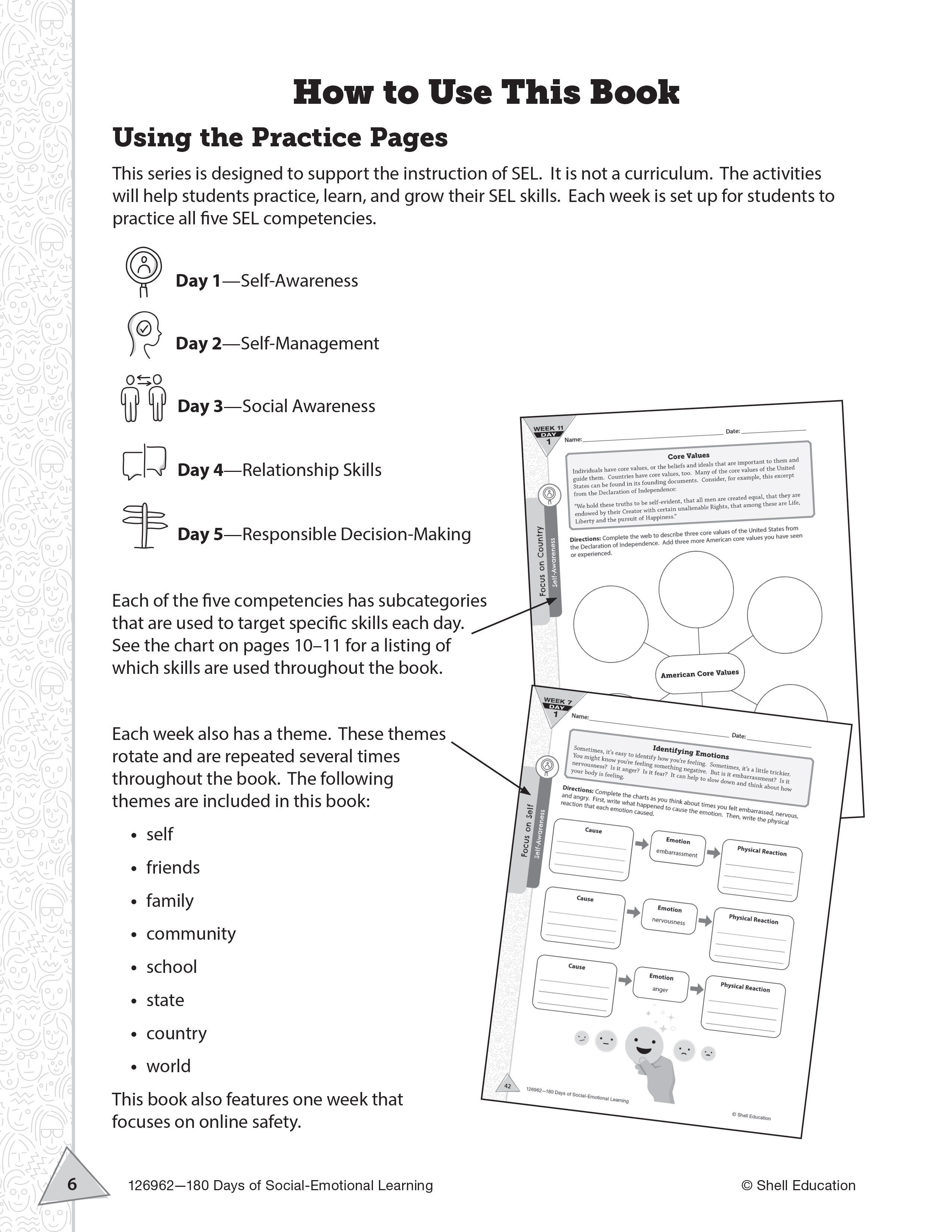 An effective sixth grade workbook that provides daily social and emotional learning (SEL) activities to help students explore emotions, actions, relationships, and decision making. The daily activities connect to the CASEL competencies, mindfulness, and key affective education initiatives. This SEL workbook makes at-home learning, whole class instruction, or small group support, quick and easy. Help students build self-awareness, analyze relationships, discover diverse perspectives, and apply what they have learned with engaging lessons. The use of fiction and nonfiction text allows for self-reflection and growth. Parents appreciate the teacher-approved activity books that keep their child engaged and learning. Great for homeschooling, to reinforce learning at school, and build connections between home and school. Teachers rely on the daily practice workbooks to save them valuable time. The ready to implement activities are perfect to introduce SEL topics for discussion.
