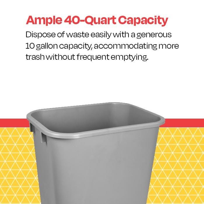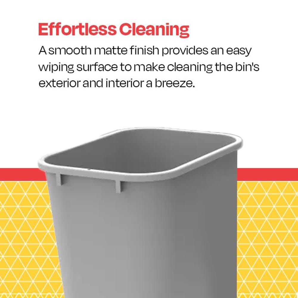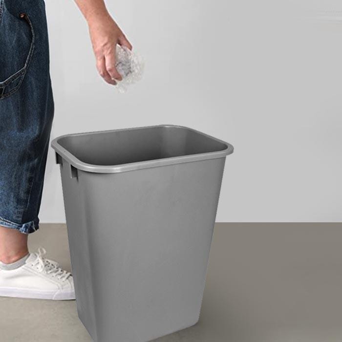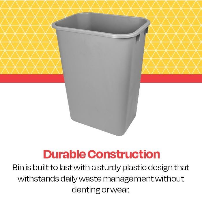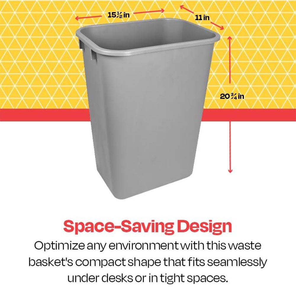 Description The slim profile and simple design of this indoor waste basket from School Smart make it a perfect fit to slide under a table, desk, or place in a cabinet. Its durable plastic construction will not crack or dent. In a contemporary gray, this wastebasket boasts a clean, polished appearance and wipes clean with ease.Features Rolled rim provides added durability and efficient grip for pick up or relocation Pairs well with a variety of spaces in a classic color sure to remain sleek and unobtrusive Lid-free opening ensures streamlined waste management