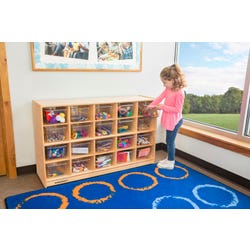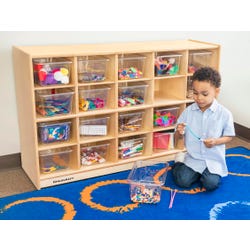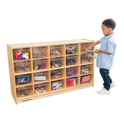 The Childcraft® Mobile Cubby Storage Unit with 20 clear trays provides ample space for organizing arts and crafts supplies, mail, and everyday essentials in classrooms, childcare centers, and homes. Featuring cubby openings, this bookcase accommodates the 20 included bins, each measuring 7-3/4 W x 12 D x 5-1/4 H inches. Removable dividers allow for customizable storage options and easy cleaning, while the heavy-duty caster wheels provide effortless mobility around the room. Crafted from durable birch plywood with a beautiful natural veneer finish, this cubby cabinet is built to last. Measures 47-3/4 W x 14-1/4 D x 30 H inches. Comes fully assembled.