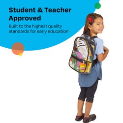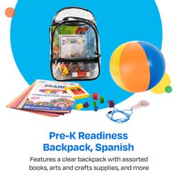 The Childcraft® Pre-K Readiness Backpack provides essential learning materials and activities that help young children develop foundational skills for school. Filled with hands-on learning materials, a Spanish children’s book, and an easy-to-follow activity guide, also in Spanish, this kit supports early learning standards while encouraging parent-child engagement. The clear, durable backpack allows for easy visibility and organization, making it perfect for at-home use or on-the-go learning. Ideal for young children preparing for preschool, this interactive set fosters literacy, numeracy, creativity, and motor skills in a fun and engaging way.Features