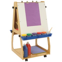 The Childcraft® Adjustable Mobile Art Easel is designed to maximize convenience and organization while fostering artistic expression and collaboration. Featuring two dry-erase panels, this double-sided easel allows multiple children to create at once, enhancing social engagement and teamwork. The adjustable panels accommodate different heights, making it ideal for young artists. The easel includes two easy-access storage shelves for organizing supplies and removable blue trays to hold paints, brushes, and more. Heavy-duty dual-wheel locking casters provide easy mobility while ensuring stability during use. This easel with whiteboards measures 24 W x 24 D x 43-5/8 H inches.