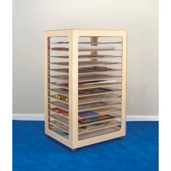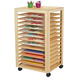 Childcraft® Mobile Art Drying Rack is the perfect addition to any creative environment. With 14 spacious shelves that accommodate paper up to 18 x 24 inches, this art rack ensures paintings, posters, or charts dry safely and stay organized. Made from sturdy all-birch veneers, the drying rack is built to last while adding a classic and professional look to your space. The top shelf includes a raised lip for extra storage and stability, while heavy-duty caster wheels make it easy to move the art cart wherever you need it. Ideal for classrooms, libraries, studios, and more, this unit simplifies storage and enhances efficiency. This art drying rack for classrooms measures 29 W x 24-1/2 D x 48-3/4 H inches.