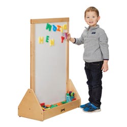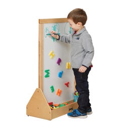 This standing board is the perfect height for children in Pre-K and features a double-sided Magnetic Write-n-Wipe panel for loads of creative fun! Children can spell out words with magnetic letters, draw their favorite pictures with dry-erase markers, or explore their favorite STEM and STEAM activities with magnetic gears, levels, and other learning aids (not included). At the bottom of the board, there is a handy tray for storing these supplies as well as catching any falling items during experiments. The Magnetic Write-n-Wipe Panel is 20-1/2 W x 31-3/4 H inches.