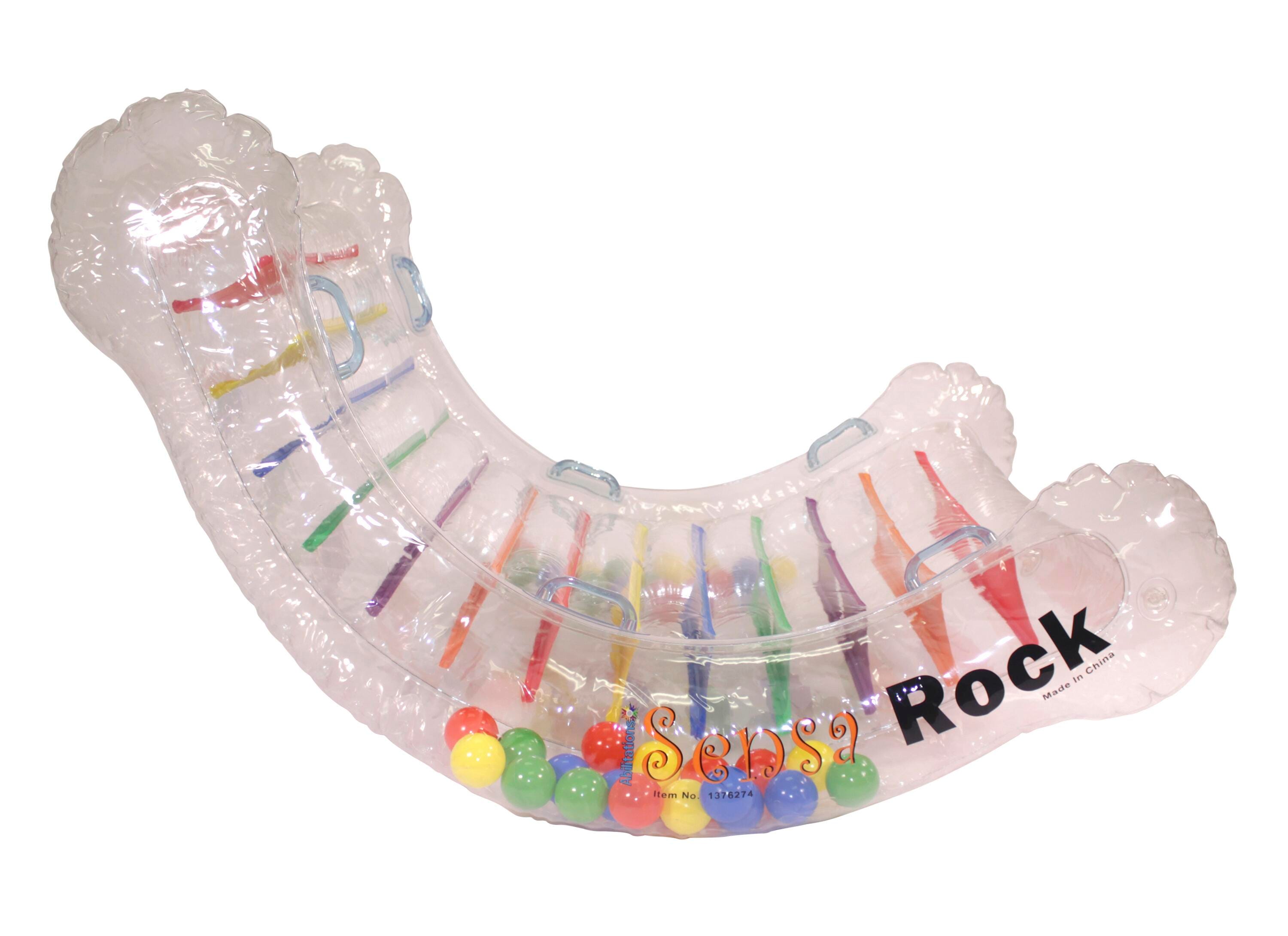 Abilitations SensaRock is an inflatable rocker that is made with high quality vinyl. The rocker is filled with colorful balls that swish around inside when in use. It is used for children with sensory processing or autistic spectrum disorders. There are 6 handles on the top help those with gravitational insecurities. Chair-like design saves space with easy inflating and deflating abilities. SensaRock measures 53 x 40 inches with an inside width of 24 inches. Weight limit of 100 pounds. Recommended for use with power inflator (not included). Design is best suited for preschool to early childhood ages. Download SensaRock Instructions
